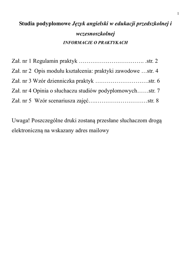1 Studia podyplomowe Język angielski w edukacji przedszkolnej i wczesnoszkolnej INFORMACJE O PRAKTYKACH Zał. nr 1 Regulamin praktyk ……………………………. .str. 2 Zał. nr 2 Opis modułu kształcenia: praktyki zawodowe …str. 4 Zał. nr 3 Wzór dzienniczka praktyk ……………………….str. 6 Zał. nr 4 Opinia o słuchaczu studiów podyplomowych……str. 7 Zał. nr 5 Wzór scenariusza zajęć….………………………str. 8 Uwaga! Poszczególne druki zostaną przesłane słuchaczom drogą elektroniczną na wskazany adres mailowy 2 Studia podyplomowe Język angielski w edukacji przedszkolnej i wczesnoszkolnej PRAKTYKI ZAWODOWE – regulamin 1. Zaliczenie praktyk 1.1 Przed rozpoczęciem praktyk słuchacz powinien dostarczyć praktykodawcy dwa egzemplarze porozumienia (oryginały), które wypełniają słuchacze i po podpisaniu przez przedstawiciela praktykodawcy przekazują uczelnianemu opiekunowi praktyk oraz poinformować uczelnianego opiekuna praktyk czy praktykodawca wymaga wykonania badań lekarskich i szkolenia BHP. 1.2 Uczelnia zapewnia ubezpieczenie od następstw nieszczęśliwych wypadków na cały okres trwania praktyk. 1.3 Praktyki: - praktyki odbywają się w 1 semestrze (60 godzin praktyk obserwacyjnych), w 2 semestrze (30 godzin praktyk czynnych) oraz w 3 semestrze (30 godzin praktyk czynnych). Placówkę i nauczyciela – opiekuna słuchacze wybierają samodzielnie ( słuchacze mogą odbywać praktyki w przedszkolach, szkołach podstawowych i placówkach kształcących uczniów na etapie przedszkolnym i wczesnoszkolnym w zakresie kompetencji językowych z języka angielskiego). - podczas praktyk obserwacyjnych słuchacze wypełniają dzienniki praktyk według wzorów (wykaz tematów jednostek lekcyjnych wraz z ewentualnym komentarzem i podpisem zakładowego opiekuna praktyk); - dzienniki praktyk obserwacyjnych należy złożyć przed rozliczeniem semestru u uczelnianego opiekuna praktyk wraz zaświadczeniem o odbyciu praktyk wystawionym przez organ prowadzący placówkę. - w ramach zaliczenia praktyk czynnych słuchacze składają scenariusze przeprowadzonych zajęć oraz opinię o praktykancie wystawioną przez zakładowego opiekuna praktyk. 2. Cele praktyk Praktyka zawodowa ma na celu kształtowanie kompetencji praktycznych poprzez zapoznanie studentów ze specyfiką placówki, w której praktyka jest odbywana, a w szczególności: - poznanie realizowanych przez nią zadań, sposobu funkcjonowania, organizacji pracy, pracowników, oraz prowadzonej dokumentacji; - współpracę z opiekunem praktyk w podejmowaniu działań wynikających z zastanych sytuacji oraz samodzielne podejmowanie odpowiednich działań; 3 - analizę i interpretację zaobserwowanych albo doświadczanych sytuacji i zdarzeń zawodowych, w tym prowadzenie dokumentacji praktyki, konfrontowanie wiedzy teoretycznej z praktyką, ocenę własnego funkcjonowania w toku realizowania zadań (dostrzeganie swoich mocnych i słabych stron), ocenę przebiegu prowadzonych działań oraz realizacji zamierzonych celów, konsultacje z opiekunem praktyk w celu omawiania obserwowanych sytuacji i przeprowadzanych działań, omawianie zgromadzonych doświadczeń w grupie studentów (słuchaczy). 3. Inne niepubliczna placówka oświatowo-wychowawcza - praca zawodowa lub działalność prowadzona przez słuchaczy, która spełnia wymogi stawiane przez uczelnię (rodzaj instytucji, wykonywanych obowiązków, liczba godzin) może stanowić podstawę zaliczenia praktyk. Decyzję w takich przypadkach podejmuje uczelniany opiekun praktyk. - przeniesienie całości bądź części wyznaczonych godzin praktyk na inny semestr na wniosek słuchacza ma miejsce w przypadku uzasadnionych przyczyn i odbywa się w trybie wpisu warunkowego. Decyzję w takich przypadkach podejmuje Kierownik Studiów Podyplomowych. Przed przystąpieniem do egzaminu końcowego słuchacz musi zaliczyć wszystkie wyznaczone godziny praktyk. 4 Załącznik nr 6 do Zarządzenia Rektora ATH Nr 524/2011/2012 z dnia 25 stycznia 2012 r. Druk DNiSS nr Sp-PK_IIID OPIS MODUŁU KSZTAŁCENIA NAZWA PRZEDMIOTU/MODUŁU KSZTAŁCENIA: PRAKTYKA ZAWODOWA Kod przedmiotu: SPA_PZ Wydział: Humanistyczno-Społeczny Nazwa studiów podyplomowych: Język angielski w edukacji przedszkolnej i wczesnoszkolnej Formy zajęć i liczba godzin praktyki: 60h (1 sem)+ 30h (2 sem)+ 30h (3 sem) =120h; Język, w którym/ch realizowane są zajęcia: j. angielski, język polski Liczba punktów ECTS: 2 (1 sem)+ 2 (2 sem)+ 2 (3 sem) = 6 Osoby prowadzące praktyki: mgr Monika Marek, dr Barbara Loranc-Paszylk ___________________________________________________________________________ 1. Zasady odbywania praktyki Zasady odbywania praktyki określa Regulamin Praktyk na Studiach podyplomowych Język angielski w edukacji przedszkolnej i wczesnoszkolnej 2. Forma odbywania praktyki Obserwacja funkcjonowania wybranej instytucji, obserwacja zajęć języka angielskiego, współpraca z opiekunem praktyk i prowadzenie zajęć języka angielskiego. 3. Cel i ramowy program praktyki Zasadniczym celem praktyki jest kształtowanie kompetencji metodycznych praktykantów poprzez obserwację zajęć, współdziałanie z opiekunem praktyk, pełnienie roli nauczyciela-pedagoga, analizę i interpretację zaobserwowanych i doświadczanych sytuacji i zdarzeń pedagogicznych. W semestrze 1 słuchacze obserwują zajęcia języka angielskiego, w semestrze 2 i 3 prowadzą zajęcia języka angielskiego. 4. Miejsca odbywania praktyki Wg regulaminu praktyk 5 6. Zakładane efekty kształcenia dla przedmiotu Numer (Symbol) Efekty kształcenia dla przedmiotu Odniesienie do efektów kształcenia dla programu (symbol efektu) WIEDZA P_W01 P_W02 Ma podstawową wiedzę o specyfice pracy nauczyciela Ma podstawową wiedzę z zakresu dydaktyki nauczania języka angielskiego P_U01 Potrafi używać w praktyce nauczycielskiej wiedzę dotyczącą akwizycji języka Potrafi stosować wiedzę z zakresu pedagogiki i dydaktyki d