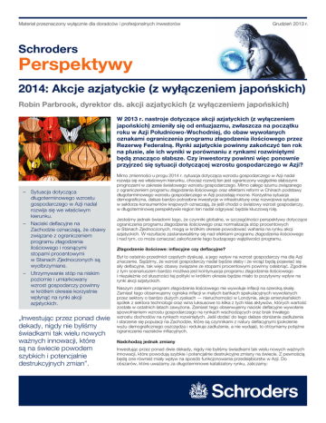 Materiał przeznaczony wyłącznie dla doradców i profesjonalnych inwestorów Grudzień 2013 r. Schroders Perspektywy 2014: Akcje azjatyckie (z wyłączeniem japońskich) Robin Parbrook, dyrektor ds. akcji azjatyckich (z wyłączeniem japońskich) W 2013 r. nastroje dotyczące akcji azjatyckich (z wyłączeniem japońskich) zmieniły się od entuzjazmu, zwłaszcza na początku roku w Azji Południowo-Wschodniej, do obaw wywołanych oznakami ograniczenia programu złagodzenia ilościowego przez Rezerwę Federalną. Rynki azjatyckie powinny zakończyć ten rok na plusie, ale ich wyniki w porównaniu z rynkami rozwiniętymi będą znacząco słabsze. Czy inwestorzy powinni więc ponownie przyjrzeć się sytuacji dotyczącej wzrostu gospodarczego w Azji? –– Sytuacja dotycząca długoterminowego wzrostu gospodarczego w Azji nadal rozwija się we właściwym kierunku. –– Naciski deflacyjne na Zachodzie oznaczają, że obawy związane z ograniczeniem programu złagodzenia ilościowego i rosnącymi stopami procentowymi w Stanach Zjednoczonych są wyolbrzymiane. –– Utrzymywanie stóp na niskim poziomie i umiarkowany wzrost gospodarczy powinny w krótkim okresie korzystnie wpłynąć na rynki akcji azjatyckich. „Inwestując przez ponad dwie dekady, nigdy nie byliśmy świadkami tak wielu nowych ważnych innowacji, które są na świecie powodem szybkich i potencjalnie destrukcyjnych zmian”. Mimo zmienności u progu 2014 r. sytuacja dotycząca wzrostu gospodarczego w Azji nadal rozwija się we właściwym kierunku, chociaż rozwój ten jest ograniczony względnie słabszymi prognozami w zakresie światowego wzrostu gospodarczego. Mimo całego szumu związanego z ograniczeniem programu złagodzenia ilościowego oraz efektami reform w Chinach podstawy długoterminowego wzrostu gospodarczego w Azji pozostają mocne. Korzystna sytuacja demograficzna, dalsze bardzo potrzebne inwestycje w infrastrukturę oraz rozwojowa sytuacja w sektorze konsumentów krajowych oznaczają, że jeśli chodzi o światowy wzrost gospodarczy, w długoterminowej perspektywie region ten nadal odgrywać będzie kluczową rolę. Jesteśmy jednak świadomi tego, że czynniki globalne, w szczególności perspektywy dotyczące ograniczenia programu złagodzenia ilościowego oraz normalizacja stóp procentowych w Stanach Zjednoczonych, mogą w krótkim okresie powodować wahania na rynku akcji azjatyckich. W rezultacie zastanawialiśmy się nad efektami programu złagodzenia ilościowego i nad tym, co może oznaczać zakończenie tego budzącego wątpliwości programu. Złagodzenie ilościowe: inflacyjne czy deflacyjne? Był to ostatnio przedmiot częstych dyskusji, a jego wpływ na wzrost gospodarczy ma dla Azji znaczenie. Sądzimy, że wzrost gospodarczy nadal będzie słaby i że wciąż będą pojawiać się siły deflacyjne, tak więc obawy związane ze stopami procentowymi powinny osłabnąć. Zgodnie z tym scenariuszem bardzo możliwa jest kontynuacja programu złagodzenia ilościowego i niezależnie od słuszności tej polityki w krótkim okresie będzie miało to pozytywny wpływ na rynki akcji azjatyckich. Naszym zdaniem program złagodzenia ilościowego nie wywołuje inflacji na szeroką skalę. Zamiast tego obserwujemy ogniska inflacji w małych bańkach spekulacyjnych wywołanych przez sektory o bardzo dużych zyskach — nieruchomości w Londynie, akcje amerykańskich spółek z sektora technologii oraz wina luksusowe to kilka z tych klas aktywów, których wartość została w ostatnich latach zawyżona. Zamiast tego obserwujemy naciski deflacyjne wywołane spowolnieniem wzrostu gospodarczego na rynkach wschodzących oraz brak trwałego wzrostu dochodów na rynkach rozwiniętych. Jeśli dodać do tego dalsze obniżanie zadłużenia i starzenie się populacji na Zachodzie, które są czynnikami z natury deflacyjnymi (pokolenie wyżu demograficznego oszczędza i redukuje zadłużenie, a nie wydaje), to otrzymamy potężne ograniczenie nacisków inflacyjnych. Nadchodzą jednak zmiany Inwestując przez ponad dwie dekady, nigdy nie byliśmy świadkami tak wielu nowych ważnych innowacji, które powodują szybkie i potencjalnie destrukcyjne zmiany na świecie. Z pewnością będą one również miały wpływ na sposób funkcjonowania przedsiębiorstw w Azji. Do obszarów, które uważamy za długoterminowe katalizatory rynku, zaliczamy: Perspektywy na rok 2014: Akcje azjatyckie (z wyłączeniem japońskich) –– Internet mobilny i duże zbiory danych. Moc przetwarzania danych, smartfony i sieci społecznościowe, aby wymienić tylko kilka czynników, nadal będą nadawać ton trendom w sektorach tak zróżnicowanych, jak sprzedaż detaliczna, nieruchomości i banki. –– Drukowanie przestrzenne. Znane jest również pod nazwą wytwarzania metodą przyrostową. Lepsze drukarki i niższe koszty produkcji (również odnoszące się do powyższego wątku) sprawiły, że stało się to nagle opłacalnym przedsięwzięciem produkcyjnym. Będzie to miało istotny wpływ na liczne azjatyckie fabryki i uzależnionych od nich sprzedawców detalicznych. –– Nowe technologie budowy silników. W całej branży transportowej — obejmującej transport lądowy, lotniczy i wodny — szybka poprawa wydajności energetycznej oraz technologii oznacza, że koszty transportu maleją, a nie rosną, co prowadzi do korzystnej deflacji. –– Nowe technologie energetyczne i związane z budową akumulatorów. Koszty energii słonecznej i wiatrowej gwałtownie spadły. Żarówki LED są teraz tanie. Firma Tesla pokazała, że technologie budowy akumulatorów są znacznie udoskonalane. Chiny nie są być może krajem „czystym i zielonym”, ale koszty ponoszone przez nie, by osiągnąć cel wykorzystania energii odnawialnych na poziomie 10% całkowitego wykorzystania energii, szybko spadają. Robin Parbrook Dyrektor ds. akcji azjatyckich (z wyłączeniem japońskich) Robin Parbrook ma 22-letnie doświadczenie na rynkach azja