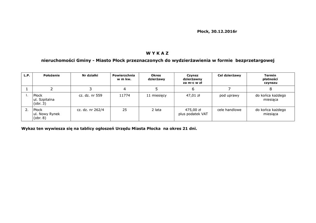 Płock, 30.12.2016r WYKAZ nieruchomości Gminy - Miasto Płock przeznaczonych do wydzierżawienia w formie bezprzetargowej L.P. Położenie Nr działki 1 2 3 1. Płock ul. Szpitalna (obr. 3) 2. Płock ul. Nowy Rynek (obr. 8) Powierzchnia w m kw. Okres dzierżawy Czynsz dzierżawny za m-c w zł Cel dzierżawy Termin płatności czynszu 4 5 6 7 8 cz. dz. nr 559 11774 11 miesięcy 47,01 zł pod uprawy do końca każdego miesiąca cz. dz. nr 262/4 25 2 lata 475,00 zł plus podatek VAT cele handlowe do końca każdego miesiąca Wykaz ten wywiesza się na tablicy ogłoszeń Urzędu Miasta Płocka na okres 21 dni.