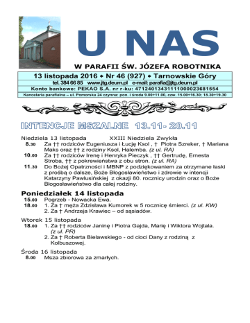 U NAS W PARAFII ŚW. JÓZEFA ROBOTNIKA 13 listopada 2016 Nr 46 (927) Tarnowskie Góry tel. 384 66 85 www.jtg.deum.pl e-mail: [email protected] Konto bankowe: PEKAO S.A. nr r-ku: 47124013431111000023681554 Kancelaria parafialna – ul. Pomorska 24 czynna: pon. i środa 9.00÷11.00, czw. 15.00÷16.30; 18.30÷19.30 Niedziela 13 listopada XXIII Niedziela Zwykła 8.30 Za †† rodziców Eugeniusza i Łucję Ksol , † Piotra Szreker, † Mariana Maks oraz †† z rodziny Ksol, Halemba. (z ul. RA) 10.00 Za †† rodziców Irenę i Henryka Pieczyk , †† Gertrudę, Ernesta Stroba, †† z pokrewieństwa z obu stron. (z ul. RA) 11.30 Do Bożej Opatrzności i MBNP z podziękowaniem za otrzymane łaski z prośbą o dalsze, Boże Błogosławieństwo i zdrowie w intencji Katarzyny Pawlusińskiej z okazji 80. rocznicy urodzin oraz o Boże Błogosławieństwo dla całej rodziny. Poniedziałek 14 listopada 15.00 18.00 Pogrzeb - Nowacka Ewa. 1. Za † męża Zdzisława Kumorek w 5 rocznicę śmierci. (z ul. KW) 2. Za † Andrzeja Krawiec – od sąsiadów. Wtorek 15 listopada 18.00 1. Za †† rodziców Janinę i Piotra Gajda, Marię i Wiktora Wojtala. (z ul. PR) 2. Za † Roberta Bielawskiego - od cioci Dany z rodziną z Kolbuszowej. Środa 16 listopada 8.00 Msza zbiorowa za zmarłych. Czwartek 17 listopada 17.00 Piątek 18 listopada 18.00 11.30 Bł. Salomei Adoracja Najświętszego Sakramentu. Do Bożej Opatrzności i MBNP z podziękowaniem za otrzymane łaski z prośbą o dalsze, Boże Błogosławieństwo i zdrowie w intencji Anny i Tadeusza Hudaszek z okazji 45 rocznicy ślubu oraz z 70 urodzin Tadeusza. (z ul. RA) Niedziela 20 listopada 8.30 10.00 Bł. Karoliny Kozkówny 1. Za † Krystynę Dorosz w 2 rocznicę śmierci, jej † męża Stefana, †† rodziców, †† teściów. (z ul. ZA) 2. Za † Krystiana Waluga w 1 rocznice śmierci. Sobota 19 listopada 16.30 17.00 Św. Elżbiety Węgierskiej Msza szkolna. 1. Za † brata Joachima Mitas w 3 rocznice śmierci, †† rodziców Walerię i Jerzego Mitas, †† z pokrewieństwa z obu stron. (z ul. KW) 2. Za † Annę Żurek w 1 rocznicę śmierci. (z ul. RO) Uroczystość Chrystusa Króla Za parafian. Do Miłosierdzia Bożego o życie wieczne dla Tadeusza Bauza w kolejną rocznicę śmierci, jego †† rodziców, †† Jana i Małgorzatę Kot, †† rodzeństwo oraz dusze w czyśćcu cierpiące. Do Dzieciątka Jezus i Anioła Stróża w intencji rocznego dziecka: Zuzanna Zdebel oraz w intencji dziecka, które przyjmie chrzest : Roch Paździor. Liturgia Słowa dzisiejszej, przedostatniej, niedzieli roku liturgicznego przypomina nam o sprawiedliwym sądzie Bożym, który czeka każdą i każdego z nas. Pan Bóg oceni nasze życie: wynagrodzi dobro, a zło ukarze. W Ewangelii znajdziemy również zapowiedź prześladowań. Wierność Chrystusowi i Jego nauce spotka się z niezrozumieniem i wrogością nawet ze strony najbliższych, jednak obietnica wspaniałej nagrody winna nas motywować do prowadzenia życia prawdziwie chrześcijańskiego i bycia świadkiem tego, że Pan Bóg jest stale obecny wśród swojego ludu. W przyszłą niedzielę będziemy obchodzić uroczystość Jezusa Chrystusa Króla Wszechświata. To święto patronalne (tytularne) Akcji Katolickiej, organizacji ludzi świeckich, którzy pragną ewangelijne ideały realizować na co dzień w swoim życiu zawodowym i społecznym. Pragniemy przekazać słowa serdecznych życzeń solenizantów i jubilatów rozpoczynającego się tygodnia. dla wszystkich We wtorek spotkanie wspólnoty Odnowa w Duchu Świętym. W czwartek msza szkolna dla dzieci i młodzieży młodszej. Spotkanie dla dzieci kl. III przygotowujących się do I Komunii św. we wtorek 22 listopada o godz.16.00 w salce na plebani, przypominam dzieciom I komunijnym i rodzicom o obecności na mszach szkolnych w czwartki. W piątek o godz.19.00 w salce na plebani spotkanie dla kl. III gimnazjum przed Bierzmowaniem. Kolekta dzisiejsza i w następną niedzielę na potrzeby naszej parafii a przed kościołem zbiórka na Kościół w Potrzebie. Bóg Zapłać. W ramach nowenny przygotowującej do Jubileuszowego Aktu Przyjęcia Jezusa za Króla i Pana przez cały tydzień w czasie każdej mszy św. przed błogosławieństwem będziemy się modlić modlitwami nowenny. ********************************************************************** Zapowiedzi przedślubne. Dawid Sorbal z Tarnowskich Gór – Sandra Kandzia z Strzebinia. ********************************************************************** Do wieczności z naszej wspólnoty parafialnej odeszli: Roman Zawadzki – l.56 Ewa Nowacka – l.95 Wieczny odpoczynek racz im dać Panie!!! ********************************************************************** Od czwartku trwa nowenna przygotowująca do Jubileuszowego Aktu Przyjęcia Jezusa za Króla i Pana, do której odmawiania zapraszają duchowni z całej Polski. Centralna uroczystość odbędzie się 19 listopada, w wigilię uroczystości Chrystusa Króla Wszechświata, w Sanktuarium Miłosierdzia Bożego w Krakowie-Łagiewnikach, a następnego dnia we wszystkich kościołach w Polsce. Nowenna obejmuje 9 dni. Składa się m.in. z Pieśni na rozpoczęcie, fragmentu Ewangelii z krótkim komentarzem oraz modlitwy do Jezusa Chrystusa naszego Króla i Pana. Do Nowenny dołączono tekst Jubileuszowego Aktu Przyjęcia Jezusa za Króla i Pana z komentarzem i epilogiem. ********************************************************************** VIII Dzień Solidarności z Kościołem Prześladowanym jest okazją, by przyjść z pomocą prześladowanym za wiarę poprzez stałą modlitwę w ich intencji. Wypełniając przykazanie miłości nieprzyjaciół módlmy się również za prześladowców. Zachęcamy także do włączenia się w akcję Pokój dla Iraku Irak stał się symbolem wojny z chrześcijanami. Rozlała się ona na cały Bliski Wschód. Iraccy chrześcijanie doświadczają ciągłych prób islamizacji ich społeczeństwa. Poni