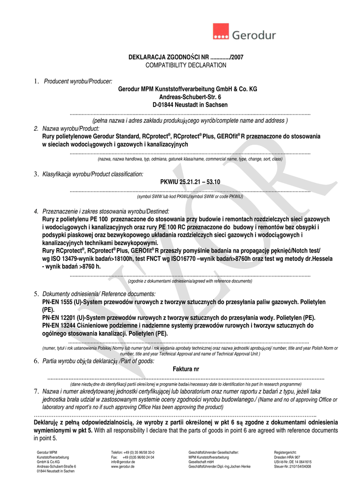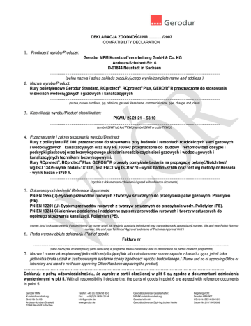 DEKLARACJA ZGODNOŚCI NR ............./2007 COMPATIBILITY DECLARATION 1. Producent wyrobu/Producer: Gerodur MPM Kunststoffverarbeitung GmbH & Co. KG Andreas-Schubert-Str. 6 D-01844 Neustadt in Sachsen ................................................................................................................................................................. (pełna nazwa i adres zakładu produkującego wyrób/complete name and address ) 2. Nazwa wyrobu/Product: Rury polietylenowe Gerodur Standard, RCprotect®, RCprotect® Plus, GEROfit® R przeznaczone do stosowania w sieciach wodociągowych i gazowych i kanalizacyjnych ................................................................................................................................................................. (nazwa, nazwa handlowa, typ, odmiana, gatunek klasa/name, commercial name, type, change, sort, class) 3. Klasyfikacja wyrobu/Product classification: PKWIU 25.21.21 – 53.10 ................................................................................................................................................................. (symbol SWW lub kod PKWiU/symbol SWW or code PKWiU) 4. Przeznaczenie i zakres stosowania wyrobu/Destined: Rury z polietylenu PE 100 przeznaczone do stosowania przy budowie i remontach rozdzielczych sieci gazowych i wodociągowych i kanalizacyjnych oraz rury PE 100 RC przeznaczone do budowy i remontów bez obsypki i podsypki piaskowej oraz bezwykopowego układania rozdzielczych sieci gazowych i wodociągowych i kanalizacyjnych technikami bezwykopowymi. Rury RCprotect®, RCprotect® Plus, GEROfit® R przeszły pomyślnie badania na propagację pęknięć/Notch test/ wg ISO 13479-wynik badań>18100h, test FNCT wg ISO16770 –wynik badań>8760h oraz test wg metody dr.Hessela - wynik badań >8760 h. ................................................................................................................................................................. (zgodnie z dokumentami odniesienia/agreed with reference documents) 5. Dokumenty odniesienia/ Reference documents: PN-EN 1555 (U)-System przewodów rurowych z tworzyw sztucznych do przesyłania paliw gazowych. Polietylen (PE). PN-EN 12201 (U)-System przewodów rurowych z tworzyw sztucznych do przesyłania wody. Polietylen (PE). PN-EN 13244 Ciśnieniowe podziemne i nadziemne systemy przewodów rurowych i tworzyw sztucznych do ogólnego stosowania kanalizacji. Polietylen (PE). ................................................................................................................................................................. (numer, tytuł i rok ustanowienia Polskiej Normy lub numer tytuł i rok wydania aprobaty technicznej oraz nazwa jednostki aprobującej/ number, title and year Polish Norm or number, title and year Technical Approval and name of Technical Approval Unit ) 6. Partia wyrobu objęta deklaracją /Part of goods: Faktura nr .......................................................................................................................................................................... (dane niezbędne do identyfikacji partii określonej w programie badań/necessary date to identification his part In research programme) 7. Nazwa i numer akredytowanej jednostki certyfikującej lub laboratorium oraz numer raportu z badań z typu, jeżeli taka jednostka brała udział w zastosowanym systemie oceny zgodności wyrobu budowlanego./ (Name and no of approving Office or laboratory and report’s no if such approving Office Has been approving the product) ………………………………………………………………………………………………………………………………………….. Deklaruję z pełną odpowiedzialnością, że wyroby z partii określonej w pkt 6 są zgodne z dokumentami odniesienia wymienionymi w pkt 5. With all responsibility I declare that the parts of goods in point 6 are agreed with reference documents in point 5. Gerodur MPM Kunststoffverarbeitung GmbH & Co.KG Andreas-Schubert-Straße 6 01844 Neustadt in Sachen Telefon: +49 (0) 35 96/58 33-0 Fax: +49 (0)35 96/60 24 04 [email protected] www.gerodur.de Geschäftsführender Gesellschafter: MPM Kunststoffverarbeitung Gesellschaft mbH Geschäftsführender:Dipl.-Ing.Jochen Henke Registergericht: Dresden HRA 907 USt-Id-Nr.:DE 14 0641615 Steuer-Nr.:210/154/04008 .......................................................... (miejsce i data wystawienia/place and date of issue) Gerodur MPM Kunststoffverarbeitung GmbH & Co.KG Andreas-Schubert-Straße 6 01844 Neustadt in Sachen Telefon: +49 (0) 35 96/58 33-0 Fax: +49 (0)35 96/60 24 04 [email protected] www.gerodur.de ......................................................... (imię, nazwisko i podpis osoby upoważnionej/signature) Geschäftsführender Gesellschafter: MPM Kunststoffverarbeitung Gesellschaft mbH Geschäftsführender:Dipl.-Ing.Jochen Henke Registergericht: Dresden HRA 907 USt-Id-Nr.:DE 14 0641615 Steuer-Nr.:210/154/04008