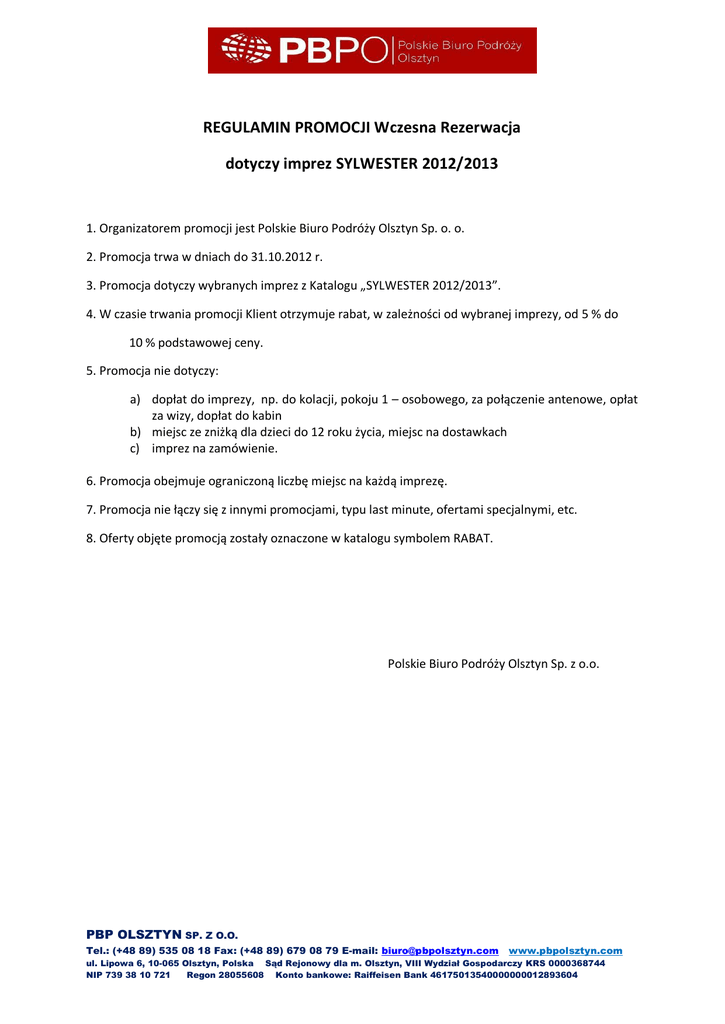 REGULAMIN PROMOCJI Wczesna Rezerwacja dotyczy imprez SYLWESTER 2012/2013 1. Organizatorem promocji jest Polskie Biuro Podróży Olsztyn Sp. o. o. 2. Promocja trwa w dniach do 31.10.2012 r. 3. Promocja dotyczy wybranych imprez z Katalogu „SYLWESTER 2012/2013”. 4. W czasie trwania promocji Klient otrzymuje rabat, w zależności od wybranej imprezy, od 5 % do 10 % podstawowej ceny. 5. Promocja nie dotyczy: a) dopłat do imprezy, np. do kolacji, pokoju 1 – osobowego, za połączenie antenowe, opłat za wizy, dopłat do kabin b) miejsc ze zniżką dla dzieci do 12 roku życia, miejsc na dostawkach c) imprez na zamówienie. 6. Promocja obejmuje ograniczoną liczbę miejsc na każdą imprezę. 7. Promocja nie łączy się z innymi promocjami, typu last minute, ofertami specjalnymi, etc. 8. Oferty objęte promocją zostały oznaczone w katalogu symbolem RABAT. Polskie Biuro Podróży Olsztyn Sp. z o.o. PBP OLSZTYN SP. Z O.O. Tel.: (+48 89) 535 08 18 Fax: (+48 89) 679 08 79 E-mail: [email protected] www.pbpolsztyn.com ul. Lipowa 6, 10-065 Olsztyn, Polska Sąd Rejonowy dla m. Olsztyn, VIII Wydział Gospodarczy KRS 0000368744 NIP 739 38 10 721 Regon 28055608 Konto bankowe: Raiffeisen Bank 46175013540000000012893604