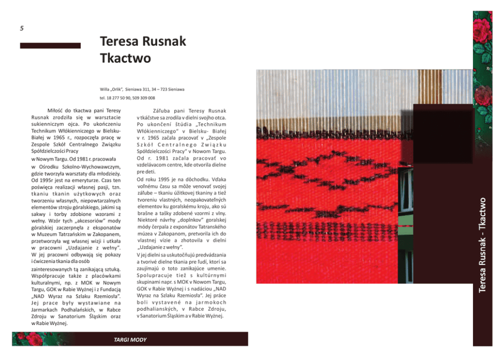 5 Teresa Rusnak Tkactwo Willa „Orlik”, Sieniawa 311, 34 – 723 Sieniawa Miłość do tkactwa pani Teresy Rusnak zrodziła się w warsztacie sukienniczym ojca. Po ukończeniu Technikum Włókienniczego w BielskuBiałej w 1965 r., rozpoczęła pracę w Zespole Szkół Centralnego Związku Spółdzielczości Pracy w Nowym Targu. Od 1981 r. pracowała w Ośrodku Szkolno-Wychowawczym, gdzie tworzyła warsztaty dla młodzieży. Od 1995r jest na emeryturze. Czas ten poświęca realizacji własnej pasji, tzn. tkaniu tkanin użytkowych oraz tworzeniu własnych, niepowtarzalnych elementów stroju góralskiego, jakimi są sakwy i torby zdobione wzorami z wełny. Wzór tych „akcesoriów” mody góralskiej zaczerpnęła z eksponatów w Muzeum Tatrzańskim w Zakopanem, przetworzyła wg własnej wizji i utkała w pracowni „Uzdajanie z wełny”. W jej pracowni odbywają się pokazy i ćwiczenia tkania dla osób zainteresowanych tą zanikającą sztuką. Współpracuje także z placówkami kulturalnymi, np. z MOK w Nowym Targu, GOK w Rabie Wyżnej i z Fundacją „NAD Wyraz na Szlaku Rzemiosła”. J e j p ra c e by ł y w ystaw i a n e n a Jarmarkach Podhalańskich, w Rabce Zdroju w Sanatorium Śląskim oraz w Rabie Wyżnej. Záľuba pani Teresy Rusnak v tkáčstve sa zrodila v dielni svojho otca. Po ukončení štúdia „Technikum Włókienniczego“ v Bielsku- Białej v r. 1965 začala pracovať v „Zespole Szkół Centralnego Związku Spółdzielczości Pracy“ v Nowom Targu. Od r. 1981 začala pracovať vo vzdelávacom centre, kde otvorila dielne pre deti. Od roku 1995 je na dôchodku. Vďaka voľnému času sa môže venovať svojej záľube – tkaniu úžitkovej tkaniny a tiež tvoreniu vlastných, neopakovateľných elementov ku goralskému kroju, ako sú brašne a tašky zdobené vzormi z vlny. Niektoré návrhy „doplnkov” goralskej módy čerpala z exponátov Tatranského múzea v Zakopanom, pretvorila ich do vlastnej vízie a zhotovila v dielni „Uzdajanie z wełny”. V jej dielni sa uskutočňujú predvádzania a tvorivé dielne tkania pre ľudí, ktorí sa zaujímajú o toto zanikajúce umenie. Spolupracuje tiež s kultúrnymi skupinami napr. s MOK v Nowom Targu, GOK v Rabie Wyżnej i s nadáciou „NAD Wyraz na Szlaku Rzemiosła“. Jej práce b o l i v y s t a v e n é n a j a r m o ko c h podhalianských, v Rabce Zdroju, v Sanatorium Śląskim a v Rabie Wyżnej. TARGI MODY Teresa Rusnak - Tkactwo tel. 18 277 50 90, 509 309 008