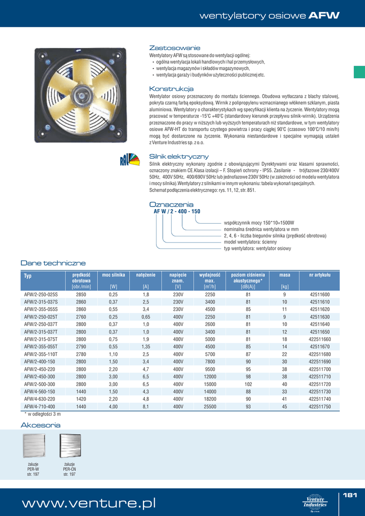 wentylatory osiowe AFW Zastosowanie Wentylatory AFW są stosowane do wentylacji ogólnej: · ogólna wentylacja lokali handlowych i hal przemysłowych, · wentylacja magazynów i składów magazynowych, · wentylacja garaży i budynków użyteczności publicznej etc. Konstrukcja Wentylator osiowy przeznaczony do montażu ściennego. Obudowa wytłaczana z blachy stalowej, pokryta czarną farbą epoksydową. Wirnik z polipropylenu wzmacnianego włóknem szklanym, piasta aluminiowa. Wentylatory o charakterystykach wg specyfikacji klienta na życzenie. Wentylatory mogą o pracować w temperaturze -15oC +40 C (standardowy kierunek przepływu silnik-wirnik). Urządzenia przeznaczone do pracy w niższych lub wyższych temperaturach niż standardowe, w tym wentylatory osiowe AFW-HT do transportu czystego powietrza i pracy ciągłej 90oC (czasowo 100oC/10 min/h) mogą być dostarczone na życzenie. Wykonania niestandardowe i specjalne wymagają ustaleń z Venture Industries sp. z o.o. Silnik elektryczny Silnik elektryczny wykonany zgodnie z obowiązującymi Dyrektywami oraz klasami sprawności, oznaczony znakiem CE.Klasa izolacji – F. Stopień ochrony - IP55. Zasilanie - trójfazowe 230/400V 50Hz, 400V 50Hz, 400/690V 50Hz lub jednofazowe 230V 50Hz (w zależności od modelu wentylatora i mocy silnika).Wentylatory z silnikami w innym wykonaniu: tabela wykonań specjalnych. Schemat podłączenia elektrycznego: rys. 11, 12, str. 851. Oznaczenia AF W / 2 - 400 - 150 współczynnik mocy 150*10=1500W nominalna średnica wentylatora w mm 2, 4, 6 - liczba biegunów silnika (prędkość obrotowa) model wentylatora: ścienny typ wentylatora: wentylator osiowy Dane techniczne prędkość obrotowa [obr./min] moc silnika natężenie [W] AFW/2-250-025S 2850 0,25 AFW/2-315-037S 2860 0,37 Typ [A] napięcie znam. [V] wydajność max. [m3/h] poziom ciśnienia akustycznego* [dB(A)] masa nr artykułu 1,8 230V 2250 81 9 42511600 2,5 230V 3400 81 10 42511610 [kg] AFW/2-355-055S 2860 0,55 3,4 230V 4500 85 11 42511620 AFW/2-250-025T 2760 0,25 0,65 400V 2250 81 9 42511630 AFW/2-250-037T 2800 0,37 1,0 400V 2600 81 10 42511640 AFW/2-315-037T 2800 0,37 1,0 400V 3400 81 12 42511650 422511660 AFW/2-315-075T 2800 0,75 1,9 400V 5000 81 18 AFW/2-355-055T 2790 0,55 1,35 400V 4500 85 14 42511670 AFW/2-355-110T 2780 1,10 2,5 400V 5700 87 22 422511680 AFW/2-400-150 2800 1,50 3,4 400V 7800 90 30 422511690 AFW/2-450-220 2800 2,20 4,7 400V 9500 95 38 422511700 AFW/2-450-300 2800 3,00 6,5 400V 12000 98 38 422511710 AFW/2-500-300 2800 3,00 6,5 400V 15000 102 40 422511720 AFW/4-560-150 1440 1,50 4,3 400V 14000 88 33 422511730 AFW/4-630-220 1420 2,20 4,8 400V 18200 90 41 422511740 AFW/4-710-400 1440 4,00 8,1 400V 25500 93 45 422511750 * w odległości 3 m Akcesoria żaluzje PER-W str. 197 żaluzje PER-CN str. 197 www.venture.pl 181 wentylatory osiowe AFW Wymiary [mm] Typ OF AFW/2-250-025 B OD E C A A 315 B 260 C 65 OD 254 E 275 OF 10 AFW/2-250-037 315 260 65 254 290 10 AFW/2-315-037 400 330 80 315 300 10 AFW/2-315-075 400 330 80 315 320 10 AFW/2-355-055 450 380 87 355 320 10 AFW/2-355-110 450 380 87 355 320 10 AFW/2-400-150 500 420 90 400 350 10 AFW/2-450-220 560 480 103 450 390 10 AFW/2-450-300 560 480 103 450 390 10 AFW/2-500-300 630 560 110 500 400 10 AFW/4-560-150 710 630 110 560 400 10 AFW/4-630-220 800 710 115 630 425 10 AFW/4-710-400* 900 800 110 710 430 10,5 * silnik montowany na podstawie Charakterystyki pracy [Pa] AFW/2-315-037 AFW/2-315-075 AFW/2-250-025 AFW/2-250-037 [Pa] AFW/2 - 315 - 075 AFW/2 - 315 - 037 [m3/h] [m3/h] AFW/2-450-220 AFW/2-450-300 AFW/2-500-300 AFW/2-355-055 AFW/2-355-110 AFW/2-400-150 [Pa] [Pa] [m3/h] [m3/h] 182 Venture Industries Sp. z o.o. ul. Mokra 27, 05-092 Łomianki - Kiełpin tel. +48 22 751 95 50, 751 20 31 fax +48 22 751 22 59, 751 12 02 e-mail: [email protected] wentylatory osiowe AFW Charakterystyki pracy AFW/4-710-400 AFW/4-560-150 AFW/4-630-220 [Pa] [Pa] [m3/h] www.venture.pl [m3/h] 183