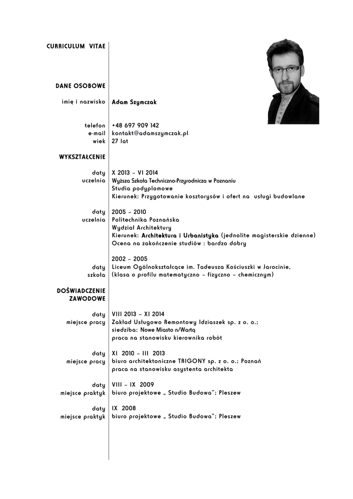 CURRICULUM VITAE DANE OSOBOWE imię i nazwisko telefon e-mail wiek Adam Szymczak +48 697 909 142 [email protected] 27 lat WYKSZTAŁCENIE daty uczelnia X 2013 – VI 2014 Wyższa Szkoła Techniczno-Przyrodnicza w Poznaniu Studia podyplomowe Kierunek: Przygotowanie kosztorysów i ofert na usługi budowlane daty uczelnia 2005 – 2010 Politechnika Poznańska Wydział Architektury Kierunek: Architektura i Urbanistyka (jednolite magisterskie dzienne) Ocena na zakończenie studiów : bardzo dobry daty szkoła 2002 – 2005 Liceum Ogólnokształcące im. Tadeusza Kościuszki w Jarocinie, (klasa o profilu matematyczno – fizyczno – chemicznym) DOŚWIADCZENIE ZAWODOWE daty miejsce pracy VIII 2013 – XI 2014 Zakład Usługowo Remontowy Idziaszek sp. z o. o.; siedziba: Nowe Miasto n/Wartą praca na stanowisku kierownika robót daty miejsce pracy XI 2010 – III 2013 biuro architektoniczne TRIGONY sp. z o. o.; Poznań praca na stanowisku asystenta architekta daty miejsce praktyk VIII – IX 2009 biuro projektowe „ Studio Budowa”; Pleszew daty miejsce praktyk IX 2008 biuro projektowe „ Studio Budowa”; Pleszew UMIEJĘTNOŚCI języki obce obsługa programów język angielski w stopniu dobrym w mowie i piśmie AutoCAD Architecture ArchiCAD Adobe Photoshop MS Office bardzo dobrze dobrze bardzo dobrze Word, Excel, Outlook, PowerPoint prawo jazdy kategoria A i B OSIĄGNIĘCIA I DZIAŁALNOŚĆ daty 2008 – 2010 stypendium naukowe Wydziału Architektury PP daty 2007 – 2008 działalność w kole i Informatyki UAM SILNE STRONY ZAINTERESOWANIA Portfolio z fotograficznym Wydziału Matematyki samodzielność, umiejętność pracy w zespole, koncentracja, sprawna organizacja pracy, rzetelność, potrzeba tworzenia i działania, zdolności analityczne oraz artystyczne, gotowość do nauki, szybkie przyswajanie nowego oprogramowania komputerowego fotografia tradycyjna i cyfrowa, stolarstwo, snowboard, jazda konna, gra na perkusji, gry logiczne i planszowe wybranymi projektami dostępne pod adresem www.adamszymczak.pl "Wyrażam zgodę na przetwarzanie moich danych osobowych zawartych w ofercie pracy dla potrzeb procesu rekrutacji zgodnie z ustawą z dnia 27.08.1997r. Dz. U. z 2002 r., Nr 101, poz. 923 ze zm."