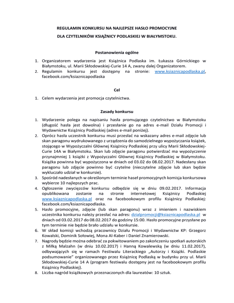 REGULAMIN KONKURSU NA NAJLEPSZE HASŁO PROMOCYJNE DLA CZYTELNIKÓW KSIĄŻNICY PODLASKIEJ W BIAŁYMSTOKU. Postanowienia ogólne 1. Organizatorem wydarzenia jest Książnica Podlaska im. Łukasza Górnickiego w Białymstoku, ul. Marii Skłodowskiej-Curie 14 A, zwany dalej Organizatorem. 2. Regulamin konkursu jest dostępny na stronie: www.ksiaznicapodlaska.pl, facebook.com/ksiaznicapodlaska Cel 1. Celem wydarzenia jest promocja czytelnictwa. Zasady konkursu 1. Wydarzenie polega na napisaniu hasła promującego czytelnictwo w Białymstoku 2. 3. 4. 5. 6. 7. 8. (długość hasła jest dowolna) i przesłanie go na adres e-mail Działu Promocji i Wydawnictw Książnicy Podlaskiej (adres e-mail poniżej). Oprócz hasła uczestnik konkursu musi przesłać na wskazany adres e-mail zdjęcie lub skan paragonu wydrukowanego z urządzenia do samodzielnego wypożyczania książek, stojącego w Wypożyczalni Głównej Książnicy Podlaskiej przy ulicy Marii SkłodowskiejCurie 14A w Białymstoku. Skan lub zdjęcie paragonu potwierdzać ma wypożyczenie przynajmniej 1 książki z Wypożyczalni Głównej Książnicy Podlaskiej w Białymstoku. Książka powinna być wypożyczona w dniach od 03.02 do 08.02.2017. Nadesłany skan paragonu lub zdjęcie powinno być czytelne (nieczytelne zdjęcie lub skan będzie wykluczało udział w konkursie). Spośród nadesłanych w określonym terminie haseł promocyjnych komisja konkursowa wybierze 10 najlepszych prac. Ogłoszenie zwycięzców konkursu odbędzie się w dniu 09.02.2017. Informacja opublikowana zostanie na stronie internetowej Książnicy Podlaskiej www.ksiaznicapodlaska.pl oraz na facebookowym profilu Książnicy Podlaskiej: facebook.com/ksiaznicapodlaska. Hasło promocyjne, zdjęcie (lub skan paragonu) wraz z imieniem i nazwiskiem uczestnika konkursu należy przesłać na adres: [email protected] w dniach od 03.02.2017 do 08.02.2017 do godziny 15:00. Hasło promocyjne przysłane po tym terminie nie będzie brało udziału w konkursie. W skład komisji wchodzą pracownicy Działu Promocji i Wydawnictw KP: Grzegorz Kowalski, Dominik Sołowiej, Mona Al-Kaber i Daniel Znamierowski. Nagrody będzie można odebrać za pokwitowaniem po zakończeniu spotkań autorskich z Miłką Malzahn (w dniu 10.02.2017) i Hanną Kowalewską (w dniu 11.02.2017), odbywających się w ramach Festiwalu Literackiego „Autorzy i Książki. Podlaskie podsumowanie” organizowanego przez Książnicę Podlaską w budynku przy ul. Marii Skłodowskiej-Curie 14 A (program festiwalu dostępny jest na facebookowym profilu Książnicy Podlaskiej). Liczba nagród książkowych przeznaczonych dla laureatów: 10 sztuk. 9. Udział w konkursie jest równoznaczny z akceptacją regulaminu. 10. Niezgłoszenie się po odbiór nagrody w wyznaczonym terminie jest równoznaczne z rezygnacją z udziału w konkursie. Nagrody 1. Nagrodzone osoby, które prześlą hasło promocyjne w wyznaczony terminie na adres mailowy wskazany w regulaminie otrzymają nagrodę książkową ufundowaną przez Książnicę Podlaską w Białymstoku i Fundację Sąsiedzi. Warunki uczestnictwa 1. Udział w konkursie wiąże się z wyrażeniem zgody w formie pisemnej dotyczącego akceptacji regulaminu, odebraniem nagrody książkowej oraz wykorzystaniem hasła promocyjnego laureata do celów promocyjnych Książnicy Podlaskiej. 2. Hasło promocyjne, zdjęcie (lub skan paragonu) wraz z imieniem i nazwiskiem uczestnika konkursu należy przesłać na adres: [email protected] w dniach od 03.02.2017 do 08.02.2017 do godziny 15:00. Hasło promocyjne przysłane po tym terminie nie będzie brało udziału w konkursie. 3. Osoby biorące udział w konkursie muszą mieć ukończone 18 lat. 4. Osoby biorące udział w konkursie muszą posiadać kartę czytelnika Książnicy Podlaskiej im. Łukasza Górnickiego w Białymstoku. Postanowienia końcowe 1. W sprawach nieujętych w niniejszym regulaminie, jak również o zapisach regulaminu budzących wątpliwości rozstrzygać będzie Organizator. 2. Bezpośrednim Organizatorem jest Dział Promocji i Wydawnictw Książnicy Podlaskiej im. Łukasza Górnickiego w Białymstoku, ul. Marii Skłodowskiej-Curie 14 A, tel. (85) 67 67 241 . 3. Organizator zastrzega sobie prawo do zmian w regulaminie, przerwania lub odwołania konkursu bez podania przyczyn. Informacja o ewentualnych zmianach będzie publikowana wyłącznie na stronie internetowej Książnicy Podlaskiej: www.ksiaznicapodlaska.pl oraz profilu Facebook Książnicy Podlaskiej: www.facebook.com/ksiaznicapodlaska . 4. Otrzymanie nagrody jest równoznaczne z podpisaniem oświadczenia, a tym samym z wyrażeniem przez uczestnika konkursu zgody na przetwarzanie przez Organizatora danych osobowych na potrzeby konkursu [ ustawa z dnia 29.08.1997 r. o ochronie danych osobowych (Dz.U. nr 101 poz. 926 z póź. zm.), ewentualnego wykorzystania wizerunku na potrzeby promocji Książnicy Podlaskiej im. Łukasza Górnickiego w Białymstoku [art. 81 Ustawy o prawie autorskim i prawach pokrewnych], a także zgody na wykorzystanie opinii laureata konkursu również w celach promocyjnych KP.