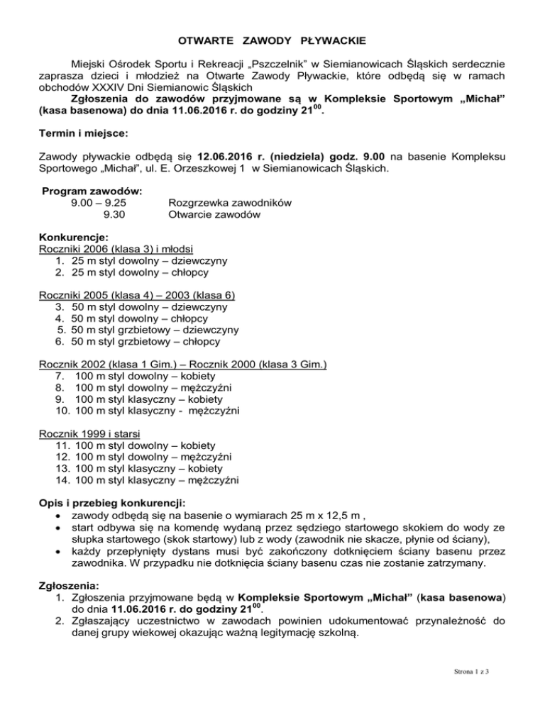 OTWARTE ZAWODY PŁYWACKIE Miejski Ośrodek Sportu i Rekreacji „Pszczelnik” w Siemianowicach Śląskich serdecznie zaprasza dzieci i młodzież na Otwarte Zawody Pływackie, które odbędą się w ramach obchodów XXXIV Dni Siemianowic Śląskich Zgłoszenia do zawodów przyjmowane są w Kompleksie Sportowym „Michał” (kasa basenowa) do dnia 11.06.2016 r. do godziny 2100. Termin i miejsce: Zawody pływackie odbędą się 12.06.2016 r. (niedziela) godz. 9.00 na basenie Kompleksu Sportowego „Michał”, ul. E. Orzeszkowej 1 w Siemianowicach Śląskich. Program zawodów: 9.00 – 9.25 9.30 Rozgrzewka zawodników Otwarcie zawodów Konkurencje: Roczniki 2006 (klasa 3) i młodsi 1. 25 m styl dowolny – dziewczyny 2. 25 m styl dowolny – chłopcy Roczniki 2005 (klasa 4) – 2003 (klasa 6) 3. 50 m styl dowolny – dziewczyny 4. 50 m styl dowolny – chłopcy 5. 50 m styl grzbietowy – dziewczyny 6. 50 m styl grzbietowy – chłopcy Rocznik 2002 (klasa 1 Gim.) – Rocznik 2000 (klasa 3 Gim.) 7. 100 m styl dowolny – kobiety 8. 100 m styl dowolny – mężczyźni 9. 100 m styl klasyczny – kobiety 10. 100 m styl klasyczny - mężczyźni Rocznik 1999 i starsi 11. 100 m styl dowolny – kobiety 12. 100 m styl dowolny – mężczyźni 13. 100 m styl klasyczny – kobiety 14. 100 m styl klasyczny – mężczyźni Opis i przebieg konkurencji: zawody odbędą się na basenie o wymiarach 25 m x 12,5 m , start odbywa się na komendę wydaną przez sędziego startowego skokiem do wody ze słupka startowego (skok startowy) lub z wody (zawodnik nie skacze, płynie od ściany), każdy przepłynięty dystans musi być zakończony dotknięciem ściany basenu przez zawodnika. W przypadku nie dotknięcia ściany basenu czas nie zostanie zatrzymany. Zgłoszenia: 1. Zgłoszenia przyjmowane będą w Kompleksie Sportowym „Michał” (kasa basenowa) do dnia 11.06.2016 r. do godziny 2100. 2. Zgłaszający uczestnictwo w zawodach powinien udokumentować przynależność do danej grupy wiekowej okazując ważną legitymację szkolną. Strona 1 z 3 Zasady przebiegu zawodów: Zawody odbywać się będą po kolei w swoich grupach wiekowych, w zależności od ilości zawodników w konkurencji, odbędą się serie na czas. Nagradzane będą 3 najlepsze czasy w swoich grupach wiekowych, osobno dziewczyny i chłopcy. Uzyskiwane czasy będą mierzone przez sędziów znajdujących się na każdym torze startowym. Po skończonej konkurencji każdy sędzia podaje uzyskany czas do komisji, głównego sędziego lub sekretariatu zawodów, gdzie są odnotowywane na listach startowych. Wyniki rywalizacji w poszczególnych grupach wiekowych zostaną ogłoszone po zakończeniu zawodów. Nagrody: Organizator zapewnia medale za pierwsze 3 miejsca w każdej kategorii oraz słodycze. IV ZAWODY W ZJEŹDZIE „RUSZBANOM” Miejski Ośrodek Sportu i Rekreacji „Pszczelnik” w Siemianowicach Śląskich serdecznie zaprasza uczestników otwartych zawodów pływackich na IV Zawody w Zjeździe „Ruszbanom” w ramach obchodów XXXIV Dni Siemianowic Śląskich. Termin i miejsce: IV Zawody w Zjeździe „Ruszbanom” odbędą się w dniu 12.06.2016 r. (niedziela) bezpośrednio po zakończeniu Otwartych Zawodów Pływackich na basenie Kompleksu Sportowego „Michał”, ul. E.Orzeszkowej 1 w Siemianowicach Śląskich. Cel zawodów: a) obchody XXXIV Dni Siemianowic Śląskich; b) popularyzacja sportu przez zabawę w środowisku dzieci i młodzieży; c) kształtowanie prawidłowych, bezpiecznych nawyków w kontakcie z wodą, budowanie odwagi i koordynacji ruchowo przestrzennej; d) podjęcie rywalizacji sportowej wg. zasad fair play; e) propagowanie spędzania wolnego czasu w aktywny sposób; f) nawiązanie kontaktów i przyjaźni pomiędzy startującymi zawodnikami; g) promocja Kompleksu Sportowego „Michał”, miasta Siemianowice Śląskie; Program zawodów: Zawody rozpoczną się bezpośrednio po zakończeniu zawodów pływackich. Opis i przebieg konkurencji: zawody odbędą się na zjeżdżalni basenowej o długości 86 m; każdy zawodnik wykonuje dwa zjazdy; Uczestnicy: Uczestnikami zawodów są dzieci i młodzież (minimalny wiek - rocznik 2006) dziewczynki i chłopcy. Podzielone na następujące kategorie wiekowe: a. Szkoła Podstawowa - rocznik 2006 – 2003 b. Szkoły Gimnazjalne i Ponadgimnazjalne - rocznik 2002 i starsi Sprawy techniczne: Rura zjazdowa ma konstrukcję zamkniętą, o przekroju 600 mm, wyprofilowana jest w kształcie „ósemki”. Posiada 3 ostre zakręty w lewo, 2 ostre zakręty w prawo na odcinku o długości 86 m. Zgłoszenia: Warunkiem uczestniczenia w zawodach (zjazd rurą) jest wcześniejszy udział w zawodach pływackich. Zgłoszenia do zawodów przyjmowane są w kasie basenowej Kompleksu Sportowego „Michał” do dnia 11.06.2016 r. do godziny 2100. Strona 2 z 3 Zasady przebiegu zawodów: pomiar czasu wykonywany jest elektronicznie, za pomocą zegara elektronicznego; zawodnik rozpoczyna zjazd na znak zielonego światła umieszczonego na wieży zjeżdżalni; zawodnik zjeżdża w pozycji dozwolonej regulaminem zjeżdżalni; po ukończonym zjeździe, zawodnik winien niezwłocznie opuścić basen hamowny; zwycięzcą zostaje zawodnik z najkrótszym łącznym czasem obu przejazdów; w przypadku uzyskania identycznego czasu łącznego dwóch przejazdów przez dwóch lub większą ilość zawodników, o kolejności zadecyduje najkrótszy zjazd; w przypadku awarii maszyny mierzącej czas przejazdów (zegar elektroniczny), zawodnikowi przysługuje przejazd dodatkowy. premiowane będą 3 najlepsze czasy, osobno dziewczyny i chłopcy (kobiety i mężczyźni); Nagrody: Organizator zapewnia medale za pierwsze 3 miejsca w każdej kategorii oraz słodycze. POSTANOWIENIA KOŃCOWE: Każdy uczestnik „Otwartych Zawodów Pływackich oraz IV Zawodów w Zjeździe „RUSZBANOM” przed wejściem na basen ma obowiązek zapoznana się z regulaminu zjeżdżalni oraz ogólnym regulaminem Kompleksu Sportowego „Michał” or