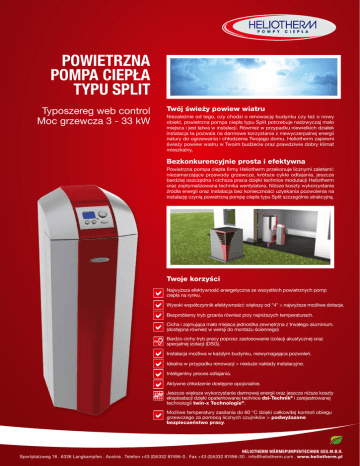 POWIETRZNA POMPA CIEPŁA TYPU SPLIT Typoszereg web control Moc grzewcza 3 - 33 kW Twój świeży powiew wiatru Niezależnie od tego, czy chodzi o renowację budynku czy też o nowy obiekt, powietrzna pompa ciepła typu Split potrzebuje nadzwyczaj mało miejsca i jest łatwa w instalacji. Również w przypadku niewielkich działek instalacja ta pozwala na darmowe korzystanie z niewyczerpalnej energii natury do ogrzewania i chłodzenia Twojego domu. Heliotherm zapewni świeży powiew wiatru w Twoim budżecie oraz prawdziwie dobry klimat mieszkalny. Bezkonkurencyjnie prosta i efektywna Powietrzna pompa ciepła firmy Heliotherm przekonuje licznymi zaletami: niezamarzające przewody grzewcze, krótsze cykle odtajania, jeszcze bardziej oszczędna i cichsza praca dzięki technice modulacji Heliotherm oraz zoptymalizowana technika wentylatora. Niższe koszty wykorzystania źródła energii oraz instalacja bez konieczności uzyskania pozwolenia na instalację czynią powietrzną pompę ciepła typu Split szczególnie atrakcyjną. Twoje korzyści Najwyższa efektywność energetyczna ze wszystkich powietrznych pomp ciepła na rynku. Wysoki współczynnik efektywności: większy od "4" > najwyższe możliwe dotacje. Bezproblemy tryb grzania również przy najniższych temperaturach. Cicha i zajmująca mało miejsca jednostka zewnętrzna z trwałego aluminium. (dostępna również w wersji do montażu ściennego) Bardzo cichy tryb pracy poprzez zastosowanie izolacji akustycznej oraz specjalnej izolacji (DSG). Instalacja możliwa w każdym budynku, niewymagająca pozwoleń. Idealna w przypadku renowacji > nieduże nakłady instalacyjne. Inteligentny proces odtajania. Aktywne chłodzenie dostępne opcjonalnie. Jeszcze większe wykorzystanie darmowej energii oraz jeszcze niższe koszty eksploatacji dzięki opatentowanej technice dsi-Technik® i zarejestrowanej technologii twin-x Technologie®. Możliwe temperatury zasilania do 60 °C dzięki całkowitej kontroli obiegu grzewczego za pomocą licznych czujników > podwyższone bezpieczeństwo pracy. HELIOTHERM WÄRMEPUMPENTECHNIK GES.M.B.H. Sportplatzweg 18 . 6336 Langkampfen . Austria . Telefon +43 (0)5332 87496-0 . Fax +43 (0)5332 87496-30 . [email protected] . www.heliotherm.pl TABELA MOCY GRZEWCZYCH – POWIETRZNA POMPA CIEPŁA TYPU SPLIT, TYPOSZEREG WEB CONTROL Pompa ciepła Heliotherm – Typ HP10L-WEB HP12L-WEB HP16L-WEB HP20L-WEB Moc grzewcza [kW] 9,69 12,04 15,10 19,19 COP 4,32 4,27 4,27 4,26 Moc grzewcza [kW] 10,00 12,42 15,58 19,80 COP 4,17 4,12 4,12 4,11 138 × 55 × 62 138 × 55 × 62 138 × 55 × 62 138 × 55 × 62 Maks. temperatura zasilania A2W35 wg EN255 / ∆ 10 K A2W35 wg EN14511/ ∆ 5 K 60 °C* Wymiary w cm (wys. × szer. × głęb.) * zależnie od kompresora TABELA MOCY GRZEWCZYCH – POWIETRZNA POMPA CIEPŁA TYPU SPLIT Z MODULACJĄ, TYPOSZEREG WEB CONTROL Pompa ciepła Heliotherm – Typ HP08LM-WEB HP12LM-WEB HP25LM-WEB HP30LM-WEB 15,9 - 4,3 20,25 - 5,8 24,4 - 7,8 31,8 - 9,7 4,24 - 4,43 4,24 - 4,43 4,27 - 4,48 4,23 - 4,35 4,20 - 4,27 25,2 - 8,0 32,8 - 10,0 4,08 - 4,19 4,05 - 4,12 Maks. temperatura zasilania A2W35 wg EN255 / ∆ 10 K 60 °C* Moc grzewcza [kW] 11,0 - 2,9 COP HP20LM-WEB Moc grzewcza [kW] 11,4 - 3,0 16,5 - 4,5 20,9 - 6,0 A2W35 wg EN14511/ ∆ 5 K COP 4,09 - 4,27 4,09 - 4,27 4,12 - 4,32 Wymiary w cm (wys. × szer. × głęb.) 138 × 55 × 62 138 × 55 × 62 138 × 55 × 62 162,5 x 60,4 x 52 162,5 x 60,4 x 67,4 Technika modulacji Heliotherm** - - - Inteligentniej, oszczędniej i elastyczniej. Do 25 % wyższa efektywność instalacji & mniejsze wydzielanie CO2 niż w przypadku zwykłych pomp ciepła. Długa żywotność poprzez łagodny rozruch. Elastyczne wykorzystanie instalacji. Niewykorzystane pomieszczenia mogą zostać po prostu wykluczone z ogrzewania. ** opcjonalnie Płynna modulacja. Dopasuj moc grzewczą do zapotrzebowania budynku. Zróżnicowane temperatury zewnętrzne wymagają indywidualnych ustawień grzewczych. Poprzez inteligentną technikę sterowania oraz kompresor modulacyjny w Twojej instalacji Heliotherm pobierana jest tylko taka ilość prądu, jaka jest potrzebna do pozyskania ciepła. W ten sposób Twoje koszty grzewcze automatycznie pozostają zoptymalizowane przez cały rok. Wzorowa efektywność. Instalacje Heliotherm odznaczone są najwyższą klasą efektywności energetycznej. Międzynarodowy znak jakości potwierdzający sprawdzoną jakość oraz liczne patenty firmy Heliotherm potwierdzają, że tyrolski producent pomp ciepła wzorowo spełnia wymagania w zakresie efektywności. Najniższe koszty eksploatacji oraz najlepsza ochrona środowiska to w tym przypadku sprawy oczywiste. Wykorzystać najwyższe dotacje. European Quality Label for Heat Pumps check the validity of this label at www.ehpa.org/QL Partner Heliotherm. Twoja gwarancja pierwszorzędności. Zaoferować wszystko z jednego źródła i w jednym miejscu to filozofia serwisu Heliotherm. Doradztwo, planowanie, montaż, uruchomienie oraz serwis wykonywany jest wyłącznie przez wybranych i przeszkolonych Partnerów Heliotherm. W ten sposób gwarantujemy najlepsze osiągnięcia dla najlepszych produktów. Zdalna konserwacja dla globalnego sterowania przez Internet lub telefon komórkowy poprzez Heliotherm web control®. Optymalizacja obiegu chłodzenia twin-x Poprzez zastosowanie zarejestrowanej techniki Heliotherm twin-x-Technik® używana jest dodatkowa darmowa energia z natury do ogrzewania. Elektroniczna regulacja czynnika roboczego Poprzez opatentowaną technikę Heliotherm DSI-Technik® – możliwe jest automatyczne dopasowanie do zmienionych warunków trybu pracy i obniżenie w znaczny sposób kosztów eksploatacji! Twój Partner Heliotherm. Zastrzeżone prawo do zmian technicznych oraz błedów . Stan na dzień 15.11.2011. Ze względu na wysokie współczynniki efektywności możliwe jest wykorzystanie najwyższych dotacji państwowych. Twój Partner Heliotherm chętnie udzieli informacji na temat indywidualnych możliwośc