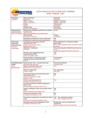 LISTA DANYCH DOTYCZĄCYCH TERENU SITE CHECK LIST Nazwa lokalizacji Site name Miasto / Gmina Town / Commune Powiat District Województwo Province (Voivodship) Maksymalna dostępna powierzchnia (w jednym Powierzchnia kawałku) [ha] nieruchomości Area of property Max. area available (as one piece) [ha] Kształt działki The shape of the site Położenie Location Informacje dotyczące nieruchomości Property information Możliwości powiększenia terenu (krótki opis) Possibility for expansion (short description) 2 Orientacyjna cena gruntu [PLN/m ] włączając 23% VAT 2 Approx. land price [PLN/m ] including 23% VAT Właściciel / właściciele Owner(s) Aktualny plan zagospodarowania przestrzennego (T/N) Valid zoning plan (Y/N) Charakterystyka działki Land specification Człuchów Czluchow Zagórki / Człuchów Zagorki / Czluchow Człuchowski Czluchow Pomorskie Pomeranian 15 ha Trapez Trapezium Nie No Cena negocjowana na drodze przetargu publicznego. Price: to be negotiated under the public tender procedure Pomorska Specjalna Strefa Ekonomiczna sp. z o.o. Pomeranian Special Economic Zone Ltd. Tak Yes Przeznaczenie w miejscowym planie zagospodarowania przestrzennego Zoning Przemysłowe Industrial Klasa gruntów wraz z powierzchnią [ha] Soil class with area [ha] Różnica poziomów terenu [m] Differences in land level [m] Grunty przemysłowe Industrial area 1m Obecne użytkowanie Present usage Nie użytkowany Not used Zanieczyszczenia wód powierzchniowych i gruntowych (T/N) Soil and underground water pollution (Y/N) Nie No Poziom wód gruntowych [m] Underground water level [m] Czy były prowadzone badania geologiczne terenu (T/N) Were geological research done (Y/N) 4m Ryzyko wystąpienia zalań lub obsunięć terenu (T/N) Risk of flooding or land slide (Y/N) Nie No Przeszkody podziemne (T/N) Underground obstacles (Y/N) Nie No Przeszkody występujące na powierzchni terenu (T/N) Ground and overhead obstacles (Y/N) Tak – linia wysokiego napięcia Yes – high voltage power line Istniejące ograniczenia ekologiczne (T/N) Ecological restrictions (Y/N) Działalność musi być neutralna dla środowiska Activity must be environment friendly 1 Połączenia transportowe Transport links Budynki i zabudowania na terenie (T/N) Buildings / other constructions on site (Y/N) Nie No Droga dojazdowa do terenu (rodzaj drogi i jej szerokość) Access road to the plot (type and width of access road) Droga asfaltowa Asphalt road Autostrada / droga krajowa [km] Nearest motorway / national road [km] Droga Krajowa nr 22 obok działki National Road no. 22 next to the site Porty rzeczne i morskie w odległości do 200 km Sea and river ports located up to 200 km Kolej [km] Railway line [km] Bocznica kolejowa [km] Railway siding [km] Najbliższe lotnisko międzynarodowe [km] Nearest international airport [km] Istniejąca infrastruktura Existing infrastructure Najbliższe miasto wojewódzkie [km] Nearest province capital [km] Elektryczność na terenie (T/N) Electricity (Y/N) Odległość przyłącza od granicy terenu Connection point (distance from boundary) [m] Napięcie Voltage [kV] Porty morskie: Gdańsk 107 km, Gdynia: 112 km, Szczecin: 200 km Sea ports: Gdansk: 107 km, Gdynia: 112 km, Szczecin: 200 km Człuchów: 6 km, Chojnice: 8 km Czluchow: 6 km, Chojnice: 8 km Człuchów: 6 km, Chojnice: 8 km Czluchow: 6 km, Chojnice: 8 km Bydgoszcz: 93 km, Gdańsk 146 km Bydgoszcz: 90 km, Gdańsk: 140 km Tak Yes 0m 15 kV Dostępna moc Available capacity [MW] Gaz na terenie (T/N) Gas (Y/N) Według zgłoszonego zapotrzebowania According to demand Nie No Odległość przyłącza od granicy działki Connection point (distance from boundary) [m] Wartość kaloryczna 3 Calorific value [MJ/Nm ] Średnica rury Pipe diameter [mm] Dostępna objętość 3 Available capacity [Nm /h] Woda na terenie (T/N) Water supply (Y/N) Odległość przyłącza od granicy terenu Connection point (distance from boundary) [m] Dostępna objętość 3 Available capacity [m /24h] Kanalizacja na terenie (T/N) Sewage discharge (Y/N) 5000 m Odległość przyłącza od granicy terenu Connection point (distance from boundary) [m] Dostępna objętość 3 Available capacity [m /24h] Oczyszczalnia ścieków na terenie bądź w bezpośrednim sąsiedztwie Treatment plant (Y/N) Telefony (T/N) Telephone (Y/N) Odległość przyłącza od granicy terenu Connection point (distance from 2 38 MJ/m 3 110 mm 3 2500 m /h Tak Yes 0m 3 400 m /24h Tak Yes 0m Według zgłoszonego zapotrzebowania According to demand Tak – Człuchów 6 km Yes – Czluchow 6 km Nie – tylko telefonia komórkowa No – mobile communication only 2000 m boundary) [m] Uwagi Comments Osoba przygotowująca ofertę Offer prepared by Osoby do kontaktu Contact person Jarosław Szponarski, Project Manager w Biurze Pozyskiwania Inwestorów PSSE sp. z o.o., 58 555 97 15, [email protected], kontakt również w języku angielskim Jarosław Szponarski, Project Manager in Investment Development Department of PSEZ Ltd., +48 58 555 97 15, [email protected], contact also in English Jarosław Szponarski, Project Manager w Biurze Pozyskiwania Inwestorów PSSE sp. z o.o., (58) 555 97 15, [email protected], kontakt również w języku angielskim Jarosław Szponarski, Project Manager in Investment Development Department of PSEZ Ltd., +48 58 555 97 15, [email protected], contact also in English 3
