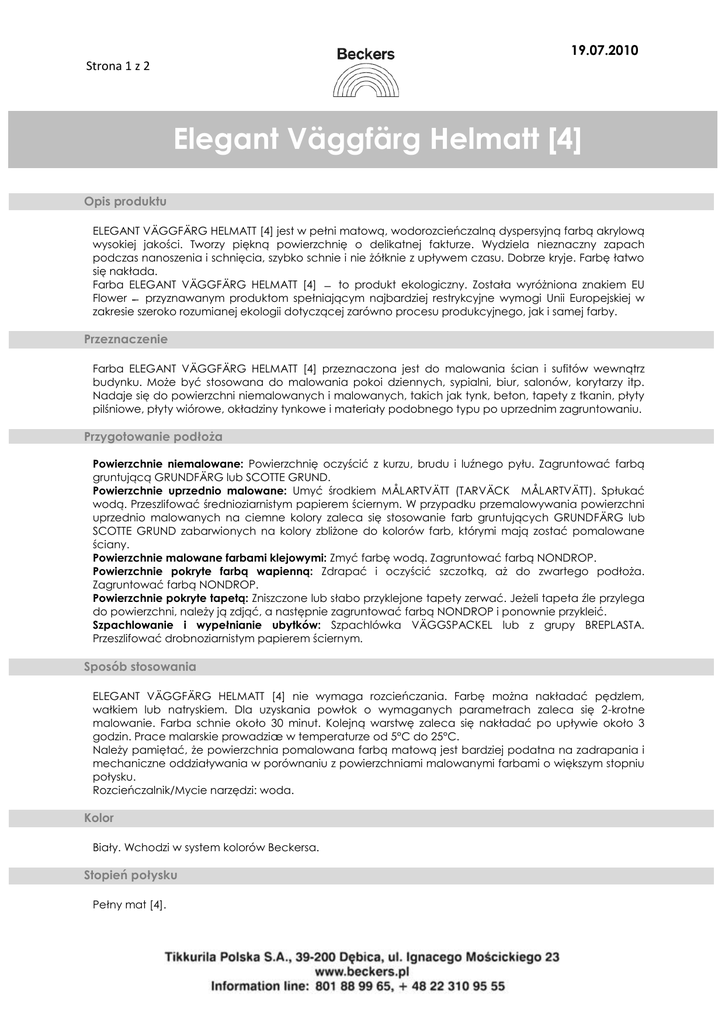 19.07.2010 Strona 1 z 2 Elegant Väggfärg Helmatt [4] Opis produktu ELEGANT VÄGGFÄRG HELMATT [4] jest w pełni matową, wodorozcieńczalną dyspersyjną farbą akrylową wysokiej jakości. Tworzy piękną powierzchnię o delikatnej fakturze. Wydziela nieznaczny zapach podczas nanoszenia i schnięcia, szybko schnie i nie żółknie z upływem czasu. Dobrze kryje. Farbę łatwo się nakłada. Farba ELEGANT VÄGGFÄRG HELMATT [4] ̶ to produkt ekologiczny. Została wyróżniona znakiem EU Flower ˗̶ przyznawanym produktom spełniającym najbardziej restrykcyjne wymogi Unii Europejskiej w zakresie szeroko rozumianej ekologii dotyczącej zarówno procesu produkcyjnego, jak i samej farby. Przeznaczenie Farba ELEGANT VÄGGFÄRG HELMATT [4] przeznaczona jest do malowania ścian i sufitów wewnątrz budynku. Może być stosowana do malowania pokoi dziennych, sypialni, biur, salonów, korytarzy itp. Nadaje się do powierzchni niemalowanych i malowanych, takich jak tynk, beton, tapety z tkanin, płyty pilśniowe, płyty wiórowe, okładziny tynkowe i materiały podobnego typu po uprzednim zagruntowaniu. Przygotowanie podłoża Powierzchnie niemalowane: Powierzchnię oczyścić z kurzu, brudu i luźnego pyłu. Zagruntować farbą gruntującą GRUNDFÄRG lub SCOTTE GRUND. Powierzchnie uprzednio malowane: Umyć środkiem MÅLARTVÄTT (TARVÄCK MÅLARTVÄTT). Spłukać wodą. Przeszlifować średnioziarnistym papierem ściernym. W przypadku przemalowywania powierzchni uprzednio malowanych na ciemne kolory zaleca się stosowanie farb gruntujących GRUNDFÄRG lub SCOTTE GRUND zabarwionych na kolory zbliżone do kolorów farb, którymi mają zostać pomalowane ściany. Powierzchnie malowane farbami klejowymi: Zmyć farbę wodą. Zagruntować farbą NONDROP. Powierzchnie pokryte farbą wapienną: Zdrapać i oczyścić szczotką, aż do zwartego podłoża. Zagruntować farbą NONDROP. Powierzchnie pokryte tapetą: Zniszczone lub słabo przyklejone tapety zerwać. Jeżeli tapeta źle przylega do powierzchni, należy ją zdjąć, a następnie zagruntować farbą NONDROP i ponownie przykleić. Szpachlowanie i wypełnianie ubytków: Szpachlówka VÄGGSPACKEL lub z grupy BREPLASTA. Przeszlifować drobnoziarnistym papierem ściernym. Sposób stosowania ELEGANT VÄGGFÄRG HELMATT [4] nie wymaga rozcieńczania. Farbę można nakładać pędzlem, wałkiem lub natryskiem. Dla uzyskania powłok o wymaganych parametrach zaleca się 2-krotne malowanie. Farba schnie około 30 minut. Kolejną warstwę zaleca się nakładać po upływie około 3 godzin. Prace malarskie prowadziæ w temperaturze od 5°C do 25°C. Należy pamiętać, że powierzchnia pomalowana farbą matową jest bardziej podatna na zadrapania i mechaniczne oddziaływania w porównaniu z powierzchniami malowanymi farbami o większym stopniu połysku. Rozcieńczalnik/Mycie narzędzi: woda. Kolor Biały. Wchodzi w system kolorów Beckersa. Stopień połysku Pełny mat [4]. 19.07.2010 Strona 2 z 2 Elegant Väggfärg Helmatt [4] Wydajność teoretyczna Około 6-8 m2/l przy jednokrotnym malowaniu, w zależności od chłonności podłoża i użytego narzędzia malarskiego. Opakowania 1 l, 3 l i 10 l Wskazówki BHP i ppoż Wyrób zastosowany zgodnie z przeznaczeniem i instrukcją stosowania nie stwarza zagrożenia dla zdrowia i środowiska. Farbę należy przechowywać w miejscu niedostępnym dla dzieci. Pomieszczenia zamknięte po zastosowaniu farby należy wietrzyć do zaniku zapachu i po tym czasie nadają się one do użytkowania. Płynnych pozostałości po malowaniu nie wolno wylewać do kanalizacji ̶ należy je przekazać firmom specjalistycznym posiadającym stosowne zezwolenie w celu utylizacji. Puste puszki należy przekazać do recyklingu. Transport i przechowywanie Farbę chronić przed zamarzaniem i promieniowaniem słonecznym. Przechowywać i transportować w szczelnie zamkniętych opakowaniach w temperaturze od 5°C do 25°C. Parametry techniczne Spoiwo: dyspersja akrylowa Gęstość: 1300 kg/m3 Lepkość: 170-220 cP Substancje stałe: 35-40% objętości pH: 7-9 Odporność na szorowanie na mokro (ISO 11998): klasa 2 Produkt posiada Atest Higieniczny. Informacje i zalecenia podane w karcie katalogowej są oparte na naszej wiedzy i doświadczeniu, należy je weryfikować w konkretnych zastosowaniach. Tikkurila Polska S.A. gwarantuje właściwą jakość produktu, nie ma jednak wpływu na warunki i sposób jego zastosowania. Producent nie odpowiada za pracę Projektanta i Wykonawcy. Przedstawione powyżej informacje zostały podane w dobrej wierze, według aktualnego stanu wiedzy i doświadczenia praktycznego, co nie zwalnia od odpowiedzialności za wykonywanie prac zgodnie z zasadami sztuki budowlanej i BHP. Tikkurila Polska S.A. nie ponosi odpowiedzialności za wady i szkody powstałe w wyniku łącznego stosowania naszych produktów z materiałami pochodzącymi z oferty innych producentów, a także w przypadku wprowadzania jakichkolwiek modyfikacji recepturowych przez nabywców i użytkowników. Producent zastrzega sobie prawo do zmiany treści w kolejnych edycjach karty technicznej bez wcześniejszego informowania o tym fakcie odbiorców. Tikkurila Polska S.A. zastrzega sobie również pełne prawo do modyfikacji swoich produktów w ramach ich rozwoju technologicznego. Informacje i zalecenia podane w karcie katalogowej są oparte na naszej wiedzy i doświadczeniu, należy je weryfikować w konkretnych zastosowaniach.