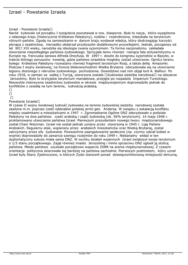 Izrael - Powstanie Izraela Izrael - Powstanie Izraela Naród żydowski od początku I tysiąclecia pozostawał w tzw. diasporze. Była to nacja, która wypędzona z własnego kraju (historycznie Królestwo Palestyny), rozbita i rozdrobniona, mieszkała na terytorium różnych państw. Zgodę na zamieszkanie w danym kraju wydawał władca, który dostrzegając korzyści płynące z osadnictwa, nierzadko obdarzał przybyszów dodatkowymi przywilejami. Jednak, począwszy od lat 90 XIX wieku, narodziła się ideologia zwana syjonizmem. Ta forma nacjonalizmu zakładała stworzenie niepodległego państwa żydowskiego. Sprzyjała temu również rosnąca fala antysemityzmu w Europie np. francuska sprawa Alfreda Dreyfusa. W 1897 r. doszło do kongresu syjonistów w Bazylei, w trakcie którego poruszono kwestię, gdzie państwo izraelskie mogłoby zostać utworzone. Oprócz terenu byłego Królestwa Palestyny rozważano również fragment terytorium Rosji, a także deltę Amazonki. Podczas I wojny światowej, na froncie bliskowschodnim Wielka Brytania zdecydowała się na utworzenie legionu złożonego z rekrutów żydowskiego pochodzenia. Dowództwo nad nim objął lord A. Balfour. Po roku 1918, w zamian za walkę z Turcją, utworzona została żydowska siedziba narodowa na obszarze Jerozolimy. Było to brytyjskie terytorium mandatowe, przejęte po rozpadzie Imperium Tureckiego. Niezwykle intensywne osadnictwo żydowskie w okresie międzywojennym doprowadziło jednak do konfliktów z osiadłą na tym terenie, ludnością arabską. Powstanie Izraela W czasie II wojny światowej ludność żydowska na terenie żydowskiej siedziby narodowej została zasilona m.in. poprzez cześć oddziałów polskiej armii gen. Andersa. W związku z eskalacją konfliktu między osadnikami a mieszkańcami w 1947 r. Zgromadzenie Ogólne ONZ zdecydowało o podziale Palestyny na dwa państwa: cześć arabską i część żydowską (ok. 56% terytorium). 14 maja 1948 r. proklamowano utworzenie państwa Izrael. Pierwszym prezydentem nowego tworu międzynarodowego został Chain Weizman. Izrael nie został jednak uznany przez utworzoną w 1945 r. Ligę Państw Arabskich. Regularny atak, wspierany przez arabskich mieszkańców oraz Wielką Brytanię, został zatrzymany przez siły żydowskie. Powszechne zaangażowanie społeczne (np. czynny udział kobiet w wojnie) doprowadziły do zawarcia szeregu rozejmów do roku 1949 r. Niebanalny wkład w ten dyplomatyczny sukces miała sama ONZ. W wyniku działań wojennych Izrael zwiększył swoje terytorium o 1/3 stanu początkowego. Zajął również miasto Jerozolimę i mimo sprzeciwu ONZ ogłosił ją stolicą państwa. Młode państwo uzyskało początkowo wsparcie ZSRR na arenie międzynarodowej. Z czasem orientacja polityczna skierowała się bardziej na państwa zachodnie. Pierwszym podmiotem, który uznał Izrael były Stany Zjednoczone, w których Żydzi stanowili ponad dziesięciomilionową mniejszość etniczną. http://www.wos.net.pl Kreator PDF Utworzono 7 March, 2017, 11:28