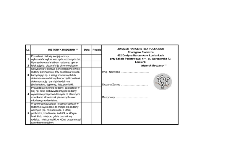Lp. HISTORYK RODZINNY ** Poznała/ał historię swojej rodziny, 1 wykonała/ał wykaz waŜnych rodzinnych dat. Uporządkowała/ał album rodzinny, opisa2 ła/ał zdjęcia, ułoŜyła/ył je chronologicznie. Odtworzyła/ył drzewo genealogiczne swojej rodziny przynajmniej trzy pokolenia wstecz, 3 korzystając np. z ksiąg kościel-nych lub dokumentów rodzinnych uporząd-kowała/ał dokumentację i pamiątki rodzin-ne (świadectwa, dyplomy, listy, pamiątki. Prowadziła/ił kronikę rodziny, zapisała/ał w niej np. kilka ciekawych przygód rodziny, 4 wywiadów przeprowadzonych ze starszymi członkami, słowniczek pierwszych słów młodszego rodzeństwa. Współorganizowała/ał i uczestniczyła/ył w rodzinnej wycieczce do miejsc dla rodziny waŜnych (np. miejscowość, z której 5 pochodzą dziadkowie, kościół, w którym brali ślub, miejsce, gdzie poznali się rodzice, miejsce walki, w której uczestniczyli członkowie rodziny). Data Podpis ZWIĄZEK HARCERSTWA POLSKIEGO Chorągiew Stołeczna 462 DruŜyna Harcerska w Łomiankach przy Szkole Podstawowej nr 1, ul. Warszawska 73, Łomianki Historyk Rodzinny ** Imię i Nazwisko …………………………… DruŜyna/Zastęp ………………………….. DruŜynowy ………………………………..