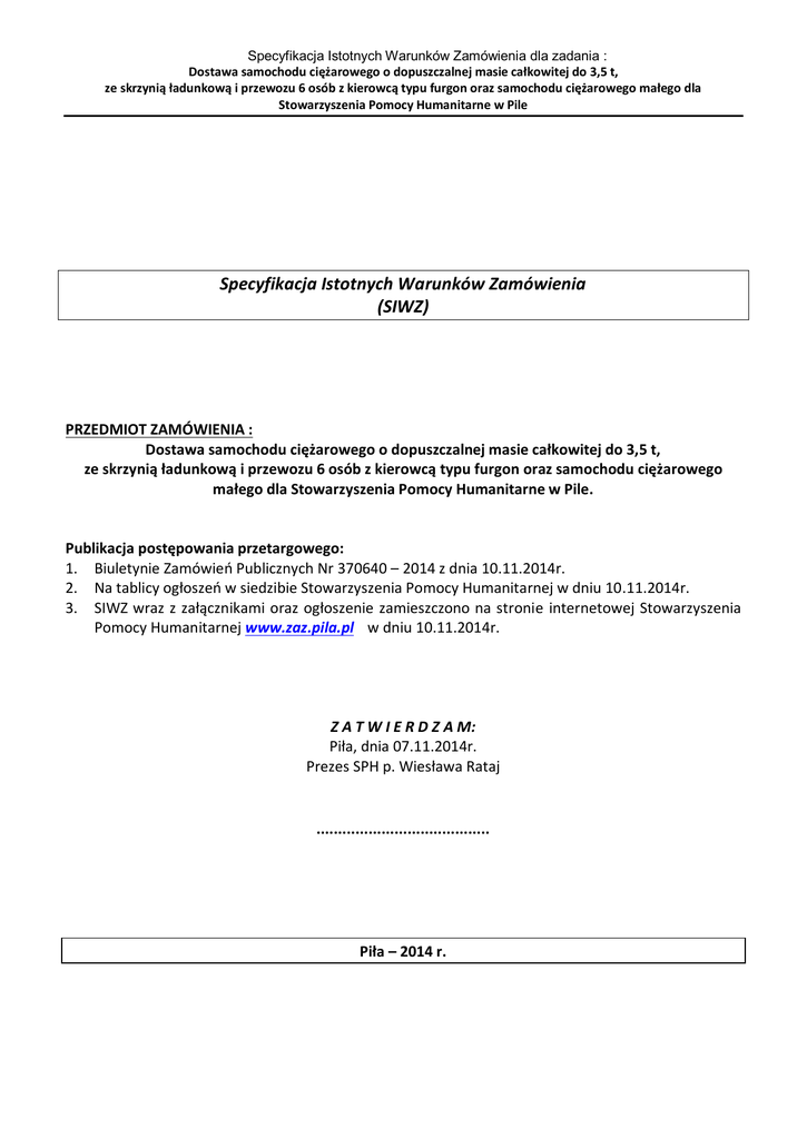 Specyfikacja Istotnych Warunków Zamówienia dla zadania : Dostawa samochodu ciężarowego o dopuszczalnej masie całkowitej do 3,5 t, ze skrzynią ładunkową i przewozu 6 osób z kierowcą typu furgon oraz samochodu ciężarowego małego dla Stowarzyszenia Pomocy Humanitarne w Pile Specyfikacja Istotnych Warunków Zamówienia (SIWZ) PRZEDMIOT ZAMÓWIENIA : Dostawa samochodu ciężarowego o dopuszczalnej masie całkowitej do 3,5 t, ze skrzynią ładunkową i przewozu 6 osób z kierowcą typu furgon oraz samochodu ciężarowego małego dla Stowarzyszenia Pomocy Humanitarne w Pile. Publikacja postępowania przetargowego: 1. Biuletynie Zamówień Publicznych Nr 370640 – 2014 z dnia 10.11.2014r. 2. Na tablicy ogłoszeń w siedzibie Stowarzyszenia Pomocy Humanitarnej w dniu 10.11.2014r. 3. SIWZ wraz z załącznikami oraz ogłoszenie zamieszczono na stronie internetowej Stowarzyszenia Pomocy Humanitarnej www.zaz.pila.pl w dniu 10.11.2014r. Z A T W I E R D Z A M: Piła, dnia 07.11.2014r. Prezes SPH p. Wiesława Rataj ........................................ Piła – 2014 r. Specyfikacja Istotnych Warunków Zamówienia dla zadania : Dostawa samochodu ciężarowego o dopuszczalnej masie całkowitej do 3,5 t, ze skrzynią ładunkową i przewozu 6 osób z kierowcą typu furgon oraz samochodu ciężarowego małego dla Stowarzyszenia Pomocy Humanitarne w Pile I. Informacja o Zamawiającym Stowarzyszenie Pomocy Humanitarnej w Pile, wpisane do Krajowego Rejestru Sądowego - nr KRS: 0000087816, w imieniu którego działa Wiesława Rataj - Prezes Stowarzyszenia, ul. Węglowa 9 64 - 920 Piła województwo wielkopolskie powiat pilski tel. 67 214 43 40 faks 67 214 43 47 e-mail: [email protected] NIP : 764-23-59-290 Regon : 572056428 II. Informacje o sposobie porozumiewania się Zamawiającego z Wykonawcami oraz przekazywania oświadczeń lub dokumentów, a także wskazanie osób uprawnionych do porozumiewania się z Wykonawcami 1. Do kontaktów z Wykonawcami upoważnieni są: Irena Wiśniewska Ryszard Dąbrowski – konsultant ds. zamówień publicznych w sprawach formalnych. 2. Postępowanie prowadzone jest z zachowaniem formy pisemnej, formie faksu i elektronicznej. Oświadczenia, wnioski, zawiadomienia oraz informacje Zamawiający oraz Wykonawcy przekazują faksem na numer jw. lub e-mailem na adres [email protected]: . Każda ze Stron na żądanie drugiej niezwłocznie potwierdza fakt ich otrzymania; przesłanie dokumentu e-mailem bez względu na włączenie czy wyłączenie opcji potwierdzenia uznane będzie jako dokonane, tj. wysłane i otrzymane w tej samej chwili. 3. Postępowanie jest oznaczone znakiem sprawy: 271.1S.2014. Wykonawcy winni we wszystkich kontaktach z Zamawiającym powoływać się na podane oznaczenie. 4. Wykonawca może zwrócić się do Zamawiającego z wnioskiem o wyjaśnienia dotyczące treści Specyfikacji Istotnych Warunków Zamówienia (dalej - SIWZ), kierując swoje zapytania w formie podanej w pkt. 2. 5. Wniosek o wyjaśnienie treści SIWZ można składać do Zamawiającego nie później niż do końca dnia, w którym upływa połowa wyznaczonego terminu składania ofert. Zamawiający niezwłocznie udzieli odpowiedzi na wszelkie zapytania wynikające z treści złożonego wniosku, jednak nie później niż na dwa dni przed upływem terminu składania ofert. 6. Treść wyjaśnienia zostanie przekazana Wykonawcom, którym Zamawiający przekazał SIWZ oraz zamieszczona na stronie internetowej Stowarzyszenia Pomocy Humanitarne w Pile ( dalej SPH ). 7. Przedłużenie terminu składania ofert nie wpływa na bieg terminu składania wniosków, o których mowa w pkt. 4 i 5. 8. SIWZ wraz z załącznikami zamieszczona na stronie internetowej www.zaz.pila.pl, a w wersji elektronicznej na CD można odebrać nieodpłatnie u p. Ireny Wiśniewskiej w siedzibie Zamawiającego. Specyfikacja Istotnych Warunków Zamówienia dla zadania : Dostawa samochodu ciężarowego o dopuszczalnej masie całkowitej do 3,5 t, ze skrzynią ładunkową i przewozu 6 osób z kierowcą typu furgon oraz samochodu ciężarowego małego dla Stowarzyszenia Pomocy Humanitarne w Pile 9. W toku badania i oceny ofert Zamawiający może żądać od Wykonawców wyjaśnień dotyczących treści złożonej oferty. 10. W uzasadnionych przypadkach, przed upływem terminu składania ofert, Zamawiający może zmienić treść ogłoszenia opublikowanego w Biuletynie Zamówień Publicznych ( dalej BZP ) lub Specyfikacji. Dokonane zmiany Zamawiający zamieści na stronie internetowej, a także doręczy niezwłocznie wszystkim Wykonawcom, którym przekazano SIWZ. 11. W przypadku gdy zmiana powodować będzie konieczność zmian w przygotowaniu oferty, Zamawiający przedłuży termin składania ofert z uwzględnieniem czasu niezbędnego do wprowadzenia tych zmian. 12. Jeżeli zmiany, o których mowa w pkt. 10, będą istotne, w szczególności będą dotyczyły określenia przedmiotu, wielkości lub zakresu zamówienia, kryteriów oceny ofert, warunków udziału w postępowaniu lub sposobu oceny ich spełniania, Zamawiający przedłuży termin składania ofert o czas niezbędny do ich wprowadzenia. 13. Zamawiający nie dopuszcza składania ofert częściowych. 14. Zamawiający nie dopuszcza składania ofert wariantowych. 15. Przedmiotem zamówienia nie jest zawarcie umowy ramowej. 16. Zamawiający nie przewiduje dokonanie wyboru oferty najkorzystniejszej z użyciem aukcji elektronicznej. III. Tryb udzielenia zamówienia 1. Do udzielenia zamówienia stosuje się przepisy ustawy z dnia 29 stycznia 2004 r. - Prawo zamówień publicznych (Dz. U. z 2013r. poz. 907 z późn. zm.), zwanej dalej ustawą Pzp oraz, w sprawach nieuregulowanych ustawą, przepisy ustawy - Kodeks Cywilny. 2. Postępowanie jest prowadzone w trybie przetargu nieograniczonego na podstawie art. 39 – 46 ustawy Pzp. dla wartości zamówienia poniżej kwot określonych w przepisach art. 11 ust. 8 ustawy Pzp. IV. Opis przedmiotu zamówienia. 1. Przepisy prawne regulu