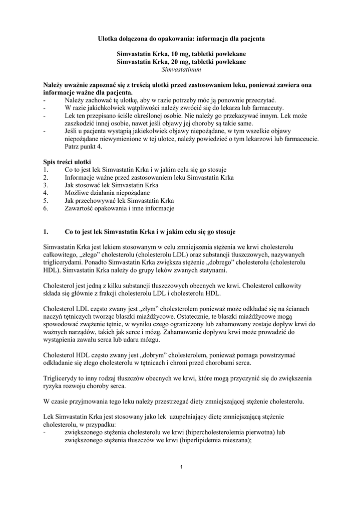 Ulotka dołączona do opakowania: informacja dla pacjenta Simvastatin Krka, 10 mg, tabletki powlekane Simvastatin Krka, 20 mg, tabletki powlekane Simvastatinum Należy uważnie zapoznać się z treścią ulotki przed zastosowaniem leku, ponieważ zawiera ona informacje ważne dla pacjenta. Należy zachować tę ulotkę, aby w razie potrzeby móc ją ponownie przeczytać. W razie jakichkolwiek wątpliwości należy zwrócić się do lekarza lub farmaceuty. Lek ten przepisano ściśle określonej osobie. Nie należy go przekazywać innym. Lek może zaszkodzić innej osobie, nawet jeśli objawy jej choroby są takie same. Jeśli u pacjenta wystąpią jakiekolwiek objawy niepożądane, w tym wszelkie objawy niepożądane niewymienione w tej ulotce, należy powiedzieć o tym lekarzowi lub farmaceucie. Patrz punkt 4. Spis treści ulotki 1. Co to jest lek Simvastatin Krka i w jakim celu się go stosuje 2. Informacje ważne przed zastosowaniem leku Simvastatin Krka 3. Jak stosować lek Simvastatin Krka 4. Możliwe działania niepożądane 5. Jak przechowywać lek Simvastatin Krka 6. Zawartość opakowania i inne informacje 1. Co to jest lek Simvastatin Krka i w jakim celu się go stosuje Simvastatin Krka jest lekiem stosowanym w celu zmniejszenia stężenia we krwi cholesterolu całkowitego, „złego” cholesterolu (cholesterolu LDL) oraz substancji tłuszczowych, nazywanych triglicerydami. Ponadto Simvastatin Krka zwiększa stężenie „dobrego” cholesterolu (cholesterolu HDL). Simvastatin Krka należy do grupy leków zwanych statynami. Cholesterol jest jedną z kilku substancji tłuszczowych obecnych we krwi. Cholesterol całkowity składa się głównie z frakcji cholesterolu LDL i cholesterolu HDL. Cholesterol LDL często zwany jest „złym” cholesterolem ponieważ może odkładać się na ścianach naczyń tętniczych tworząc blaszki miażdżycowe. Ostatecznie, te blaszki miażdżycowe mogą spowodować zwężenie tętnic, w wyniku czego ograniczony lub zahamowany zostaje dopływ krwi do ważnych narządów, takich jak serce i mózg. Zahamowanie dopływu krwi może prowadzić do wystąpienia zawału serca lub udaru mózgu. Cholesterol HDL często zwany jest „dobrym” cholesterolem, ponieważ pomaga powstrzymać odkładanie się złego cholesterolu w tętnicach i chroni przed chorobami serca. Triglicerydy to inny rodzaj tłuszczów obecnych we krwi, które mogą przyczynić się do zwiększenia ryzyka rozwoju choroby serca. W czasie przyjmowania tego leku należy przestrzegać diety zmniejszającej stężenie cholesterolu. Lek Simvastatin Krka jest stosowany jako lek uzupełniający dietę zmniejszającą stężenie cholesterolu, w przypadku: zwiększonego stężenia cholesterolu we krwi (hipercholesterolemia pierwotna) lub zwiększonego stężenia tłuszczów we krwi (hiperlipidemia mieszana); 1 - - zaburzenia dziedzicznego (homozygotyczna hipercholesterolemia rodzinna), które powoduje zwiększenie stężenia cholesterolu we krwi. Można wtedy zastosować także inne metody leczenia; choroby niedokrwiennej serca (choroba wieńcowa) lub wysokiego ryzyka wystąpienia choroby niedokrwiennej serca (ze względu na cukrzycę, przebyty udar mózgu lub inne choroby naczyń krwionośnych). Simvastatin Krka może wydłużyć życie pacjenta przyczyniając się do zmniejszenia ryzyka rozwoju chorób serca niezależnie od stężenia cholesterolu we krwi. U większości osób nie występują bezpośrednie objawy zwiększenia stężenia cholesterolu. Lekarz może ocenić stężenie cholesterolu, zlecając proste badanie krwi. Należy regularnie zgłaszać się na wizyty kontrolne, obserwować stężenie cholesterolu we krwi i omawiać z lekarzem zamierzone cele leczenia. 2. Informacje ważne przed zastosowaniem leku Simvastatin Krka Kiedy nie stosować leku Simvastatin Krka jeśli pacjent ma uczulenie na symwastatynę lub na którykolwiek z pozostałych składników tego leku (wymienionych w punkcie 6); jeśli występują obecnie zaburzenia czynności wątroby; jeśli pacjentka jest w ciąży lub karmi piersią; jeśli pacjent przyjmuje jednocześnie jeden lub więcej z poniżej wymienionych leków: itrakonazol, ketokonazol, pozakonazol lub worykonazol (stosowane w leczeniu zakażeń grzybiczych), erytromycyna, klarytromycyna lub telitromycyna (stosowane w leczeniu zakażeń), inhibitory proteazy HIV, takie jak indynawir, nelfinawir, rytonawir i sakwinawir (inhibitory proteazy wirusa HIV stosowane w leczeniu zakażenia wirusem HIV), boceprewir i telaprewir (stosowane w leczeniu wirusowego zapalenia wątroby typu C), nefazodon (stosowany w leczeniu depresji), gemfibrozyl (stosowany w celu zmniejszenia stężenia cholesterolu), cyklosporyna (stosowana u pacjentów po przeszczepach narządów), danazol (syntetyczny hormon stosowany w leczeniu endometriozy, choroby w której błona wyściełająca macicę rozrasta się poza macicą); jeśli pacjent obecnie przyjmuje lub w okresie 7 ostatnich dni przyjmował (lub podawano mu) lek o nazwie kwas fusydowy (stosowany w leczeniu zakażeń bakteryjnych). W razie wątpliwości, czy stosowany jest którykolwiek z wyżej wymienionych leków należy poradzić się lekarza. Ostrzeżenia i środki ostrożności Przed rozpoczęciem stosowania leku Simvastatin Krka należy zwrócić się do lekarza lub farmaceuty. Należy poinformować lekarza: o wszystkich dolegliwościach, w tym o uczuleniach, o spożywaniu dużych ilości alkoholu, o występowaniu w przeszłości chorób wątroby. Stosowanie leku Simvastatin Krka może nie być właściwe, o planowanym zabiegu operacyjnym. Może zaistnieć potrzeba przerwania stosowania leku Simvastatin Krka na krótki czas. Lekarz powinien wykonać badanie krwi przed rozpoczęciem stosowania leku Simvastatin Krka i podczas leczenia, jeśli u pacjenta występują jakiekolwiek zaburzenia wątroby. Celem badania będzie ocena czynności wątroby. 2 Lekarz może również przeprowadzić badania krwi oceniające czynność wąt