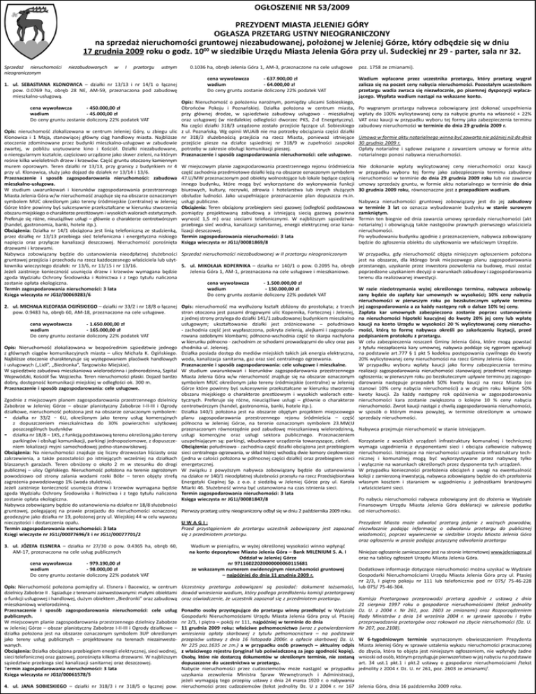 OGŁOSZENIE NR 53/2009 PREZYDENT MIASTA JELENIEJ GÓRY OGŁASZA PRZETARG USTNY NIEOGRANICZONY na sprzedaż nieruchomości gruntowej niezabudowanej, położonej w Jeleniej Górze, który odbędzie się w dniu 17 grudnia 2009 roku o godz. 1000 w siedzibie Urzędu Miasta Jelenia Góra przy ul. Sudeckiej nr 29 - parter, sala nr 32. Sprzedaż nieruchomości nieograniczonym niezabudowanych w I przetargu ustnym 1. ul. SEBASTIANA KLONOWICA – działki nr 13/13 i nr 14/1 o łącznej pow. 0.0769 ha, obręb 28 NE, AM-59, przeznaczona pod zabudowę mieszkalno-usługową. cena wywoławcza - 450.000,00 zł wadium - 45.000,00 zł Do ceny gruntu zostanie doliczony 22% podatek VAT Opis: nieruchomość zlokalizowana w centrum Jeleniej Góry, u zbiegu ulic Klonowica i 1 Maja, stanowiącej główny ciąg handlowy miasta. Najbliższe otoczenie zdominowane przez budynki mieszkalno-usługowe w zabudowie zwartej, w pobliżu usytuowane kino i Kościół. Działki niezabudowane, o nieregularnym kształcie, częściowo urządzone jako skwer zieleni, na którym rośnie kilka wieloletnich drzew i krzewów. Część gruntu otoczony kamiennym murem oporowym. Teren działki nr 13/13, przy granicy z budynkiem nr 4 przy ul. Klonowica, służy jako dojazd do działek nr 13/14 i 13/6. Przeznaczenie i sposób zagospodarowania nieruchomości: zabudowa mieszkalno-usługowa. W studium uwarunkowań i kierunków zagospodarowania przestrzennego Miasta Jelenia Góra w/w nieruchomość znajduje się na obszarze oznaczonym symbolem MUC określonym jako tereny śródmiejskie (centralne) w Jeleniej Górze które powinny byś sukcesywnie przekształcane w kierunku stworzenia obszaru miejskiego o charakterze presżowym i wysokich walorach estetycznych. Preferuje się różne, nieuciążliwe usługi – głównie o charakterze centrotwórczym (handel, gastronomia, banki, hotele itp.). Obciążenia: Działka nr 14/1 obciążona jest linią telefoniczną ze studzienką, przez działkę nr 13/13 przebiega sieć telefoniczna i energetyczna niskiego napięcia oraz przyłącze kanalizacji deszczowej. Nieruchomość porośnięta drzewami i krzewami. Nabywca zobowiązany będzie do ustanowienia nieodpłatnej służebności gruntowej przejścia i przechodu na rzecz każdoczesnego właściciela lub użytkownika wieczystego działek: nr 13/6, nr 13/15 i nr 13/16. Jeżeli zaistnieje konieczność usunięcia drzew i krzewów wymagana będzie zgoda Wydziału Ochrony Środowiska i Rolnictwa i z tego tytułu naliczona zostanie opłata ekologiczna. Termin zagospodarowania nieruchomości: 3 lata Księga wieczysta nr JG1J/00069283/6 2. ul. MICHAŁA KLEOFASA OGIŃSKIEGO – działki nr 33/2 i nr 18/8 o łącznej pow. 0.9483 ha, obręb 60, AM-18, przeznaczone na cele usługowe. cena wywoławcza - 1.650.000,00 zł wadium - 165.000,00 zł Do ceny gruntu zostanie doliczony 22% podatek VAT Opis: Nieruchomość zlokalizowana w bezpośrednim sąsiedztwie jednego z głównych ciągów komunikacyjnych miasta – ulicy Michała K. Ogińskiego. Najbliższe otoczenie charakteryzuje się występowaniem placówek handlowych i usługowych („Lidl”, „Biedronka”, Targowisko Miejskie). W sąsiedztwie zabudowa mieszkaniowa wielorodzinna i jednorodzinna, Szpital Wojewódzki, Kościół Św. Wojciecha. Teren nieruchomości płaski. Dojazd bardzo dobry, dostępność komunikacji miejskiej w odległości ok. 300 m. Przeznaczenie i sposób zagospodarowania: cele usługowe. 0.1036 ha, obręb Jelenia Góra 1, AM-3, przeznaczone na cele usługowe cena wywoławcza - 637.900,00 zł wadium - 64.000,00 zł Do ceny gruntu zostanie doliczony 22% podatek VAT Opis: Nieruchomość o położeniu narożnym, pomiędzy ulicami Sobieskiego, Obrońców Pokoju i Poznańskiej. Działka położona w centrum miasta, przy głównej drodze, w sąsiedztwie zabudowy usługowo - mieszkalnej oraz usługowej (w niedalekiej odległości dworzec PKS, Z-d Energetyczny). Na części działki 318/3 urządzone zostało przejście łączące ul. Sobieskiego z ul. Poznańską. Wg opinii WUAiB nie ma potrzeby obciążania części działki nr 318/3 służebnością przejścia na rzecz Miasta, ponieważ istniejące przejście piesze na działce sąsiedniej nr 318/9 w zupełności zaspokoi potrzeby w zakresie obsługi komunikacji pieszej. Przeznaczenie i sposób zagospodarowania nieruchomości: cele usługowe. W miejscowym planie zagospodarowania przestrzennego rejonu śródmieścia część zachodnia przedmiotowe działki leżą na obszarze oznaczonym symbolem 47.U/MW przeznaczonym pod obiekty wolnostojące lub lokale będące częścią innego budynku, które mogą być wykorzystane do wykonywania funkcji biurowych, kultury, rozrywki, zdrowia i hotelarstwa lub innych służących obsłudze ludności. Jako uzupełniające przeznaczenie plan dopuszcza m.in. usługi publiczne. Obciążenia: Teren obciążony przebiegiem sieci gazowej (odległość podstawowa pomiędzy projektowaną zabudową a istniejącą siecią gazową powinna wynosić 1,5 m) oraz sieciami telefonicznymi. W najbliższym sąsiedztwie przebiega sieć wodna, kanalizacji sanitarnej, energii elektrycznej oraz kanalizacji deszczowej. Termin zagospodarowania nieruchomości: 3 lata Księga wieczysta nr JG1J/00081869/8 poz. 1758 ze zmianami). Wadium wpłacone przez uczestnika przetargu, który przetarg wygrał zalicza się na poczet ceny nabycia nieruchomości. Pozostałym uczestnikom przetargu wadia zwraca się niezwłocznie, po pisemnej dyspozycji wpłacającego. Wypłata wadium nastąpi na wskazane konto. Po wygranym przetargu nabywca zobowiązany jest dokonać uzupełnienia wpłaty do 100% wylicytowanej ceny za nabycie gruntu na własność + 22% VAT oraz kaucji w przypadku wyboru tej formy jako zabezpieczenia terminu zabudowy nieruchomości w terminie do dnia 29 grudnia 2009 r. Umowa w formie aktu notarialnego winna być zawarta nie później niż do dnia 30 grudnia 2009 r. Opłaty notarialne i sądowe związane z zawarciem umowy w formie aktu not