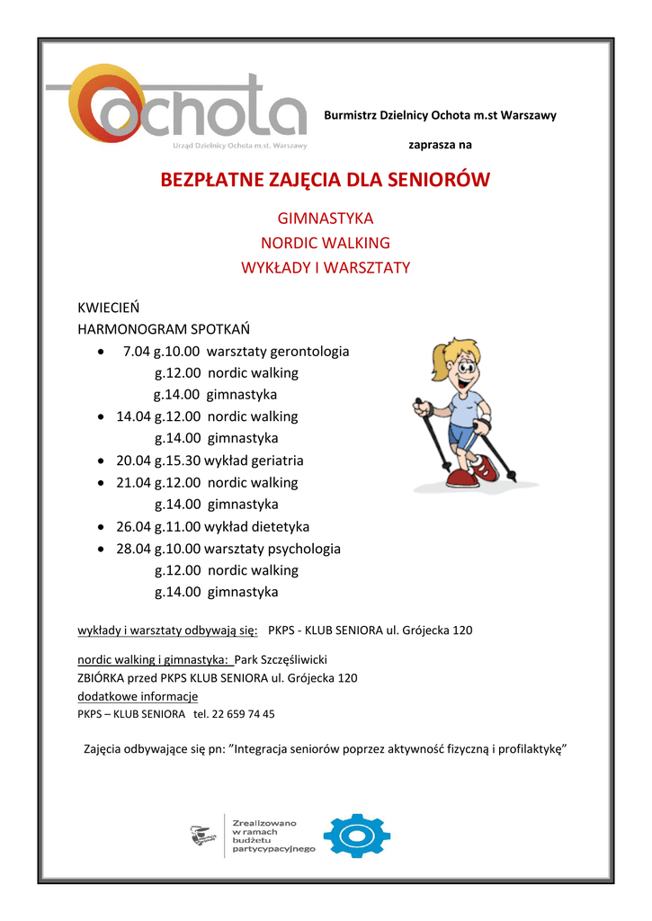 Burmistrz Dzielnicy Ochota m.st Warszawy zaprasza na BEZPŁATNE ZAJĘCIA DLA SENIORÓW GIMNASTYKA NORDIC WALKING WYKŁADY I WARSZTATY KWIECIEŃ HARMONOGRAM SPOTKAŃ 7.04 g.10.00 warsztaty gerontologia g.12.00 nordic walking g.14.00 gimnastyka 14.04 g.12.00 nordic walking g.14.00 gimnastyka 20.04 g.15.30 wykład geriatria 21.04 g.12.00 nordic walking g.14.00 gimnastyka 26.04 g.11.00 wykład dietetyka 28.04 g.10.00 warsztaty psychologia g.12.00 nordic walking g.14.00 gimnastyka wykłady i warsztaty odbywają się: PKPS - KLUB SENIORA ul. Grójecka 120 nordic walking i gimnastyka: Park Szczęśliwicki ZBIÓRKA przed PKPS KLUB SENIORA ul. Grójecka 120 dodatkowe informacje PKPS – KLUB SENIORA tel. 22 659 74 45 Zajęcia odbywające się pn: ”Integracja seniorów poprzez aktywność fizyczną i profilaktykę”