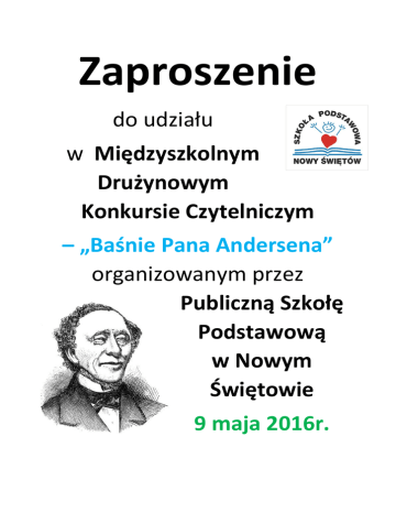 Zaproszenie do udziału w Międzyszkolnym Drużynowym Konkursie Czytelniczym – „Baśnie Pana Andersena” organizowanym przez Publiczną Szkołę Podstawową w Nowym Świętowie 9 maja 2016r. REGULAMIN MIĘDZYSZKOLNEGO DRUŻYNOWEGO KONKURSU CZYTELNICZEGO -„BAŚNIE PANA ANDERSENA” Organizator/Miejsce: Publiczna Szkoła Podstawowa w Nowym Świętowie, 48-330 Nowy Świętów 65, tel./fax - 774397021, e-mail: [email protected] Termin: 9 maja 2016 r. (poniedziałek) Czas trwania: godz.: 9.00 – 12.00 Cele: rozbudzenie zainteresowań czytelniczych, popularyzacja wśród uczniów twórczości H.CH. Andersena, rozwijanie sprawności w zakresie umiejętności pracy z tekstem, budowania poprawnych wypowiedzi i interpretacji, kształtowanie umiejętności współpracy w zespole. Zasady uczestnictwa: Każda szkoła może zgłosić do udziału w konkursie jeden 4-osobowy zespół składający się z uczniów klas IV-VI szkoły podstawowej, Zgłoszenia (karta zgłoszenia) przyjmowane będą do dnia 30 kwietnia 2016r. w formie mailowej, faksem, osobiście w sekretariacie szkoły lub pocztą Zadania obejmują twórczość H.Ch. Andersena, a w szczególności baśnie: Calineczka, Księżniczka na ziarnku grochu, Nowe szaty Cesarza, Królowa Śniegu, Dziewczynka z zapałkami, Brzydkie kaczątko, Mała syrenka, Ze względu na różnorodność zadań konkursowych prosimy uczestników o zabranie ze sobą wygodnych strojów, Nad prawidłowym przebiegiem konkursu czuwać będzie Komisja Konkursowa powołana przez Organizatora, Decyzje Komisji Konkursowej są ostatecznie i nie podlegają weryfikacji ani zaskarżeniu, Ogłoszenie wyników i wręczenie nagród odbędzie się w dniu organizacji konkursu, Organizator nie zwraca kosztów dojazdu uczestników, Zgłoszenie szkoły do udziału w konkursie jest jednoznaczne z akceptacją Regulaminu, Bliższych informacji na temat konkursu można uzyskać u p. Magdaleny Kwit (tel.502924916), Dokumentacja konkursowa znajduje się na stronie internetowej szkoły pod adresem: www.pspnowyswietow.internetdsl.pl w zakładce – konkurs czytelniczy. MIĘDZYSZKOLNY DRUŻYNOWY KONKURS CZYTELNICZY - „BAŚNIE PANA ANDERSENA” KARTA ZGŁOSZENIA Po zapoznaniu się z Regulaminem konkursu zgłaszam chęć udziału reprezentacji naszej szkoły w Międzyszkolnym Drużynowym Konkursie Czytelniczym - „Baśnie Pana Andersena” organizowanym przez Publiczną Szkołę Podstawową w Nowym Świętowie w dniu 9 maja 2016 roku Nazwa i adres szkoły: ..................................................................................................................................................... ..................................................................................................................................................... ...................................................................................... W konkursie weźmie udział drużyna w składzie (imię i nazwisko): 1. ................................................................ 2. ................................................................ 3. ................................................................ 4. ................................................................ Opiekunem uczniów jest: .............................................................. ……………………………....…. podpis opiekuna grupy ……………….………… pieczęć szkoły …………………………..……… data i podpis dyrektora OŚWIADCZENIE RODZICÓW/PRAWNYCH OPIEKUNÓW Podstawa prawna: Ustawa z dnia 29 sierpnia 1997 r. o ochronie danych osobowych (Dz. U. z 2002 r. Nr 101, poz. 926, z późniejszymi zmianami) Wyrażamy zgodę na umieszczenie i przetwarzanie danych osobowych oraz wizerunku (m.in. zdjęcia, filmu, imienia i nazwiska dziecka) syna/córki*) …………………………………………………………………………………………………………………………… (imię i nazwisko dziecka) biorącego/biorącej*) udział w Międzyszkolnym Drużynowym Konkursie Czytelniczym - „Baśnie Pana Andersena” organizowanym przez Publiczną Szkołę Podstawową w Nowym Świętowie. Jednocześnie oświadczamy, że akceptujemy postanowienia zawarte w Regulaminie konkursu, który znajduje się na stronie internetowej organizatora pod adresem: www.pspnowyswietow.internetdsl.pl Podpis rodziców/prawnych opiekunów …………………………………………………………………………… Miejscowość i data ……………………………………………….. *) Proszę podkreślić właściwe