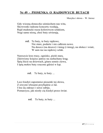Nr 49 - PIOSENKA O RAJDOWYCH BUTACH Muzyka i słowa - W. Jarosz Gdy wiosną słoneczko uśmiechem nas wita, Skowronki radosne koncerty rozdają, Rajd studencki rusza kolorowym szlakiem, Nogi same niosą, choć buty uwierają. ref. Te buty, te buty rajdowe, Nie stare, podarte i nie całkiem nowe. Na deszcz (na deszcz) i śnieg (i śnieg), na słońce i wiatr, W sam raz na rajdowy szlak. Nareszcie kres trasy, ognisko, pieśń stara, Zdziwiony księżyc patrzy na zasłuchany krąg. Śpią liście na drzewach, gitara sennie ziewa, I śpią mokre buty rzucone gdzieś w kąt. ref. Te buty, te buty ... Lecz kiedyś zapomnisz piosenki tej słowa, Z siwymi włosami przybędzie ci lat. I łza się zakręci i serce zabije, Pomarzysz, jak niosły cię kiedyś przez świat. ref. Te buty, te buty ... 67 | S t r o n a