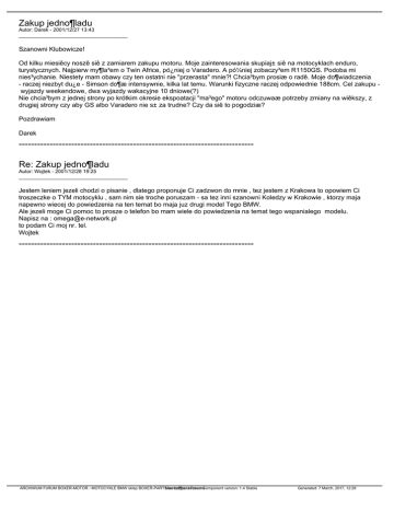 Zakup jedno¶ladu Autor: Darek - 2001/12/27 13:43 _____________________________________ Szanowni Klubowicze! Od kilku miesiêcy noszê siê z zamiarem zakupu motoru. Moje zainteresowania skupiaj± siê na motocyklach enduro, turystycznych. Najpierw my¶la³em o Twin Africe, pó¿niej o Varadero. A pó¼niej zobaczy³em R1150GS. Podoba mi nies³ychanie. Niestety mam obawy czy ten ostatni nie "przerasta" mnie?! Chcia³bym prosiæ o radê. Moje do¶wiadczenia - raczej niezbyt du¿e - Simson do¶æ intensywnie, kilka lat temu. Warunki fizyczne raczej odpowiednie 188cm. Cel zakupu wyjazdy weekendowe, dwa wyjazdy wakacyjne 10 dniowe(?) Nie chcia³bym z jednej strony po krótkim okresie ekspoatacji "ma³ego" motoru odczuwaæ potrzeby zmiany na wiêkszy, z drugiej strony czy aby GS albo Varadero nie s± za trudne? Czy da siê to pogodziæ? Pozdrawiam Darek ============================================================================ Re: Zakup jedno¶ladu Autor: Wojtek - 2001/12/28 19:25 _____________________________________ Jestem leniem jezeli chodzi o pisanie , dlatego proponuje Ci zadzwon do mnie , tez jestem z Krakowa to opowiem Ci troszeczke o TYM motocyklu , sam nim sie troche poruszam - sa tez inni szanowni Koledzy w Krakowie , ktorzy maja napewno wiecej do powiedzenia na ten temat bo maja juz drugi model Tego BMW. Ale jezeli moge Ci pomoc to prosze o telefon bo mam wiele do powiedzenia na temat tego wspanialego modelu. Napisz na : [email protected] to podam Ci moj nr. tel. Wojtek ============================================================================ ARCHIWUM FoRUM BOXER-MOTOR - MOTOCYKLE BMW sklep BOXER-PARTS.eu MamboBoard czê¶ci i akcesoria Forum Component version: 1.4 Stable Generated: 7 March, 2017, 12:28