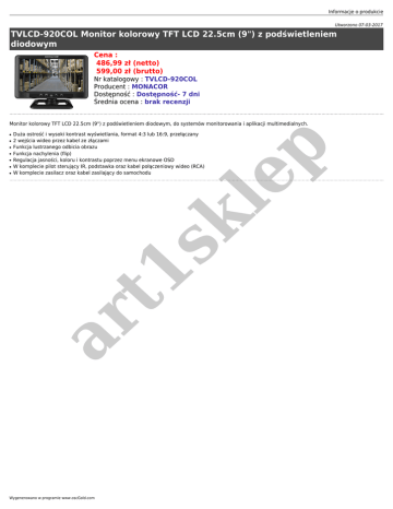 Informacje o produkcie Utworzono 07-03-2017 TVLCD-920COL Monitor kolorowy TFT LCD 22.5cm (9") z podświetleniem diodowym Cena : 486,99 zł (netto) 599,00 zł (brutto) Nr katalogowy : TVLCD-920COL Producent : MONACOR Dostępność : Dostępność- 7 dni Średnia ocena : brak recenzji Monitor kolorowy TFT LCD 22.5cm (9") z podświetleniem diodowym, do systemów monitorowania i aplikacji multimedialnych. ● ● ● ● ● ar t1 sk ● Duża ostrość i wysoki kontrast wyświetlania, format 4:3 lub 16:9, przełączany 2 wejścia wideo przez kabel ze złączami Funkcja lustrzanego odbicia obrazu Funkcja nachylenia (flip) Regulacja jasności, koloru i kontrastu poprzez menu ekranowe OSD W komplecie pilot sterujący IR, podstawka oraz kabel połączeniowy wideo (RCA) W komplecie zasilacz oraz kabel zasilający do samochodu le p ● Wygenerowano w programie www.oscGold.com