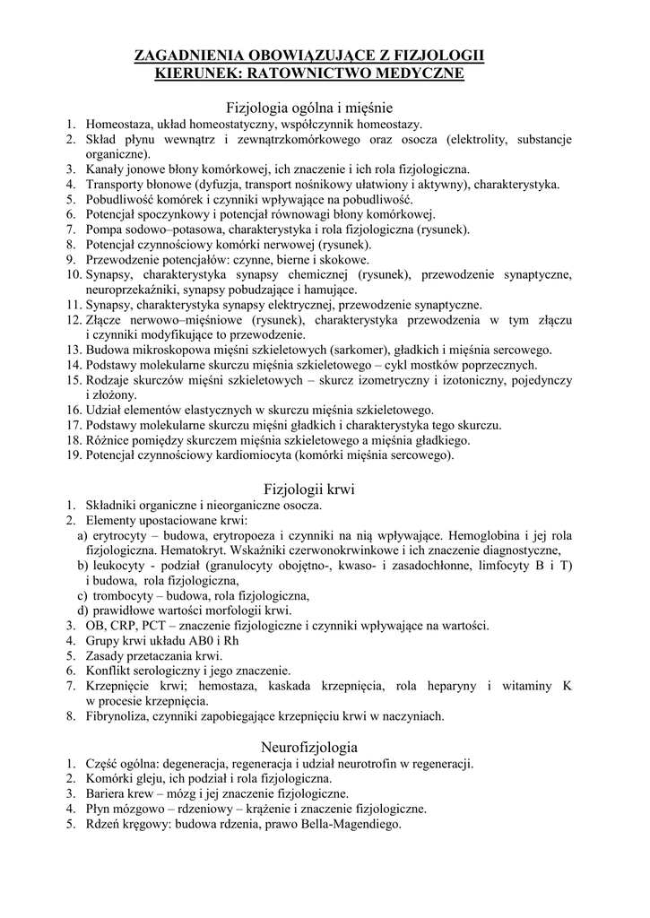 ZAGADNIENIA OBOWIĄZUJĄCE Z FIZJOLOGII KIERUNEK: RATOWNICTWO MEDYCZNE Fizjologia ogólna i mięśnie 1. Homeostaza, układ homeostatyczny, współczynnik homeostazy. 2. Skład płynu wewnątrz i zewnątrzkomórkowego oraz osocza (elektrolity, substancje organiczne). 3. Kanały jonowe błony komórkowej, ich znaczenie i ich rola fizjologiczna. 4. Transporty błonowe (dyfuzja, transport nośnikowy ułatwiony i aktywny), charakterystyka. 5. Pobudliwość komórek i czynniki wpływające na pobudliwość. 6. Potencjał spoczynkowy i potencjał równowagi błony komórkowej. 7. Pompa sodowo–potasowa, charakterystyka i rola fizjologiczna (rysunek). 8. Potencjał czynnościowy komórki nerwowej (rysunek). 9. Przewodzenie potencjałów: czynne, bierne i skokowe. 10. Synapsy, charakterystyka synapsy chemicznej (rysunek), przewodzenie synaptyczne, neuroprzekaźniki, synapsy pobudzające i hamujące. 11. Synapsy, charakterystyka synapsy elektrycznej, przewodzenie synaptyczne. 12. Złącze nerwowo–mięśniowe (rysunek), charakterystyka przewodzenia w tym złączu i czynniki modyfikujące to przewodzenie. 13. Budowa mikroskopowa mięśni szkieletowych (sarkomer), gładkich i mięśnia sercowego. 14. Podstawy molekularne skurczu mięśnia szkieletowego – cykl mostków poprzecznych. 15. Rodzaje skurczów mięśni szkieletowych – skurcz izometryczny i izotoniczny, pojedynczy i złożony. 16. Udział elementów elastycznych w skurczu mięśnia szkieletowego. 17. Podstawy molekularne skurczu mięśni gładkich i charakterystyka tego skurczu. 18. Różnice pomiędzy skurczem mięśnia szkieletowego a mięśnia gładkiego. 19. Potencjał czynnościowy kardiomiocyta (komórki mięśnia sercowego). Fizjologii krwi 1. Składniki organiczne i nieorganiczne osocza. 2. Elementy upostaciowane krwi: a) erytrocyty – budowa, erytropoeza i czynniki na nią wpływające. Hemoglobina i jej rola fizjologiczna. Hematokryt. Wskaźniki czerwonokrwinkowe i ich znaczenie diagnostyczne, b) leukocyty - podział (granulocyty obojętno-, kwaso- i zasadochłonne, limfocyty B i T) i budowa, rola fizjologiczna, c) trombocyty – budowa, rola fizjologiczna, d) prawidłowe wartości morfologii krwi. 3. OB, CRP, PCT – znaczenie fizjologiczne i czynniki wpływające na wartości. 4. Grupy krwi układu AB0 i Rh 5. Zasady przetaczania krwi. 6. Konflikt serologiczny i jego znaczenie. 7. Krzepnięcie krwi; hemostaza, kaskada krzepnięcia, rola heparyny i witaminy K w procesie krzepnięcia. 8. Fibrynoliza, czynniki zapobiegające krzepnięciu krwi w naczyniach. Neurofizjologia 1. 2. 3. 4. 5. Część ogólna: degeneracja, regeneracja i udział neurotrofin w regeneracji. Komórki gleju, ich podział i rola fizjologiczna. Bariera krew – mózg i jej znaczenie fizjologiczne. Płyn mózgowo – rdzeniowy – krążenie i znaczenie fizjologiczne. Rdzeń kręgowy: budowa rdzenia, prawo Bella-Magendiego. 6. Odruch rozciągowy, łuk odruchowy tego odruchu i jego znaczenie fizjologiczne. 7. Odruch zgięciowy, łuk odruchowy tego odruchu i jego znaczenie fizjologiczne 8. Odruch odwrócony rozciągowy, łuk odruchowy tego odruchu i jego znaczenie fizjologiczne. 9. Regulacja napięcia mięśniowego na poziomie rdzenia kręgowego. 10. Dolny neuronu motorycznego (DNM): lokalizacja, objawy uszkodzenia. 11. Uszkodzenie rdzenia kręgowego – szok rdzeniowy. 12. Oś ruchowa: kora ruchowa i jej organizacja, homunkulus ruchowy, układ piramidowy, 13. Górny neuron motoryczny (GNM): lokalizacja, objawy uszkodzenia. 14. Rola jąder podstawnych w organizacji ruchów, uszkodzenie jąder podstawnych – zespół Parkinsona. 15. Móżdżek, podział anatomiczno-fizjologiczny, rola w organizacji ruchów i utrzymaniu równowagi, uszkodzenia móżdżku. 16. Oś czuciowa: receptory, ich podział, transdukcja czuciowa (kodowanie analogowo-cyfrowe) adaptacja receptorów. 17. Drogi czuciowe: układ tylnopowrózkowy i droga rdzeniowo-wzgórzowa, charakterystyka przewodzenia w tych drogach. 18. Kora czuciowa, homunkulus czuciowy. Plastyczność kory czuciowej. 19. Ból, jego powstawanie i rodzaje, transmisja bólu. Układ analgetyczny mózgu. Rola endogennych opiatów. 20. Termorecepcja. 21. Aktywacja mózgu: układ siatkowaty pnia mózgu (US). RAS i układ wzgórzowy. Rola US w regulacji napięcia mięśniowego, stanów snu i czuwania. 22. Sen jego rodzaje i charakterystyka. 23. Podwzgórze: budowa podwzgórza i jego rola w utrzymaniu homeostazy. 24. Układ limbiczny: struktury korowe i podkorowe, powstawanie emocji, popędy i motywacje, układ kary i nagrody, uzależnienia i ich mechanizm. 25. Wyższe czynności nerwowe: pamięć i jej rodzaje, podłoże neuralne, konsolidacja pamięci, amnezje. 26. Odruchy warunkowe: postawanie i znaczenie fizjologiczne. 27. Mowa i jej ośrodki korowe oraz objawy ich uszkodzenia. 28. Okolice kojarzeniowe kory mózgowej. 29. Uzupełniająca specjalizacja półkul mózgowych . Fizjologia układu krążenia 1. Elektrofizjologia: potencjały czynnościowe kardiomiocyta oraz węzła SA i AV, czynniki wpływające na rytm wyładowań w tych węzłach. 2. EKG – charakterystyka krzywej: załamki, odcinki, odstępy. Czasy trwania i woltaż. 3. Cykl sercowy i zmiany wartości ciśnień w jamach serca i dużych naczyniach zachodzące w tym cyklu. 4. Kurczliwość mięśnia sercowego i czynniki na nią wpływające. 5. Kliniczne wskaźniki kurczliwości mięśnia sercowego. 6. Regulacja wewnątrzsercowa pracy serca- heterometryczna (prawo Starlinga) i homeometryczna. 7. Wpływ nerwów autonomicznych na pracę serca i szerokość naczyń. 8. Tony serca; osłuchiwanie i charakterystyka, szmery. 9. Pojemność minutowa i objętość wyrzutowa serca oraz czynniki na nią wpływające. 10. Rezerwa serca. 11. Zjawisko powietrzni. 12. Wartości ciśnienia krwi i czynniki determinujące to ciśnienie. 13. Wpływ ciśnienia hydrostatycznego na ciśnienie krwi w naczyniach. 14. Powrót żylny i czynniki usprawniające. Rola mięśni szkieletowy