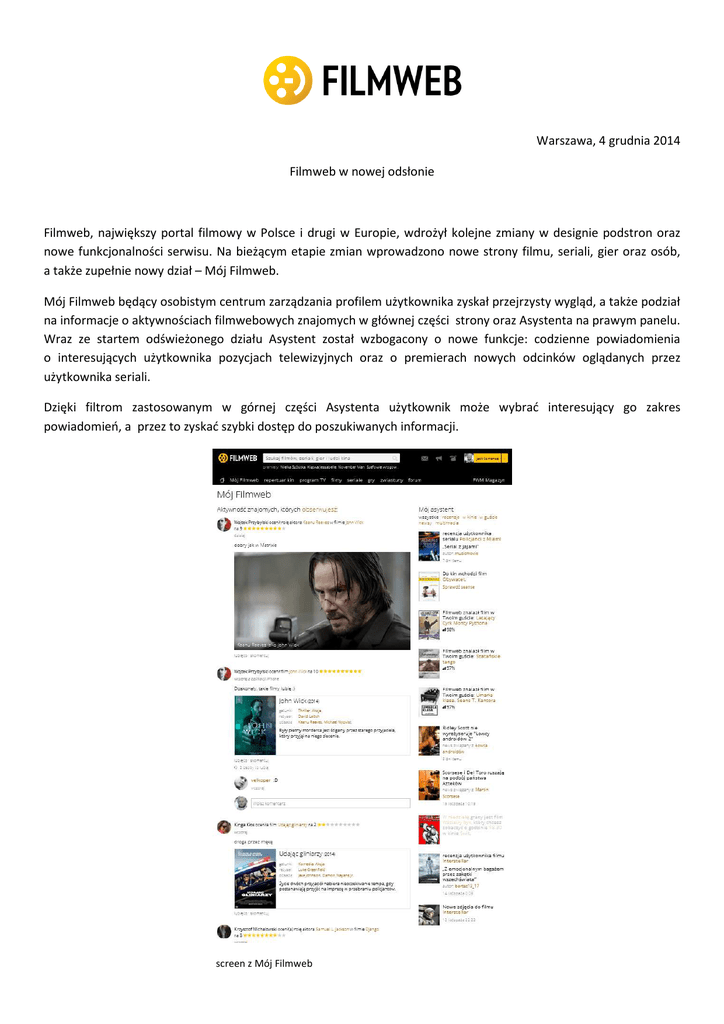 Warszawa, 4 grudnia 2014 Filmweb w nowej odsłonie Filmweb, największy portal filmowy w Polsce i drugi w Europie, wdrożył kolejne zmiany w designie podstron oraz nowe funkcjonalności serwisu. Na bieżącym etapie zmian wprowadzono nowe strony filmu, seriali, gier oraz osób, a także zupełnie nowy dział – Mój Filmweb. Mój Filmweb będący osobistym centrum zarządzania profilem użytkownika zyskał przejrzysty wygląd, a także podział na informacje o aktywnościach filmwebowych znajomych w głównej części strony oraz Asystenta na prawym panelu. Wraz ze startem odświeżonego działu Asystent został wzbogacony o nowe funkcje: codzienne powiadomienia o interesujących użytkownika pozycjach telewizyjnych oraz o premierach nowych odcinków oglądanych przez użytkownika seriali. Dzięki filtrom zastosowanym w górnej części Asystenta użytkownik może wybrać interesujący go zakres powiadomień, a przez to zyskać szybki dostęp do poszukiwanych informacji. screen z Mój Filmweb Strony filmu, serialu, gry i osoby przeszły całkowity redesign. Wyeksponowane zostały galerie zdjęć oraz zwiastuny. Na kartach produkcji wszystkie informacje związane z oceną zostały przeniesione do prawej kolumny. Nowością jest box office, który zawiera informacje o pozycji filmu w polskim i amerykańskim zestawieniu, budżecie produkcji i zysku. Strona osoby zyskała dodatkowe filtry w filmografii, które pozwalają na szybkie wyświetlanie pozycji interesujących użytkownika Filmwebu. Dodatkowo profil artysty wzbogacono o filtry dotyczące wykonywanej profesji przy danej produkcji. Całkowitą nowością jest możliwość oceniania ról oraz pracy twórców filmowych w skali od 1 do 10. screeny z karty filmu i osoby Filmweb to największy w Polsce i drugi w Europie portal filmowy (11 400 876 unikalnych użytkowników dane z Gemius Traffic, listopad 2014). Jest nie tylko drugą największą bazą filmową, ale również pierwszym źródłem informacji o filmie w polskim Internecie. W 2011 roku Filmweb zdobył nagrody Polskiego Instytutu Sztuki Filmowej oraz MediaTorów za promowanie ambitnej krytyki filmowej w Internecie. Jest także laureatem nagród za aplikacje mobilne: Mobile Trends Awards 2013 w kategorii „Rozrywka” oraz Appaward 2013 za aplikacje Filmwebu na systemy iOS i Android w kategorii „Media”.