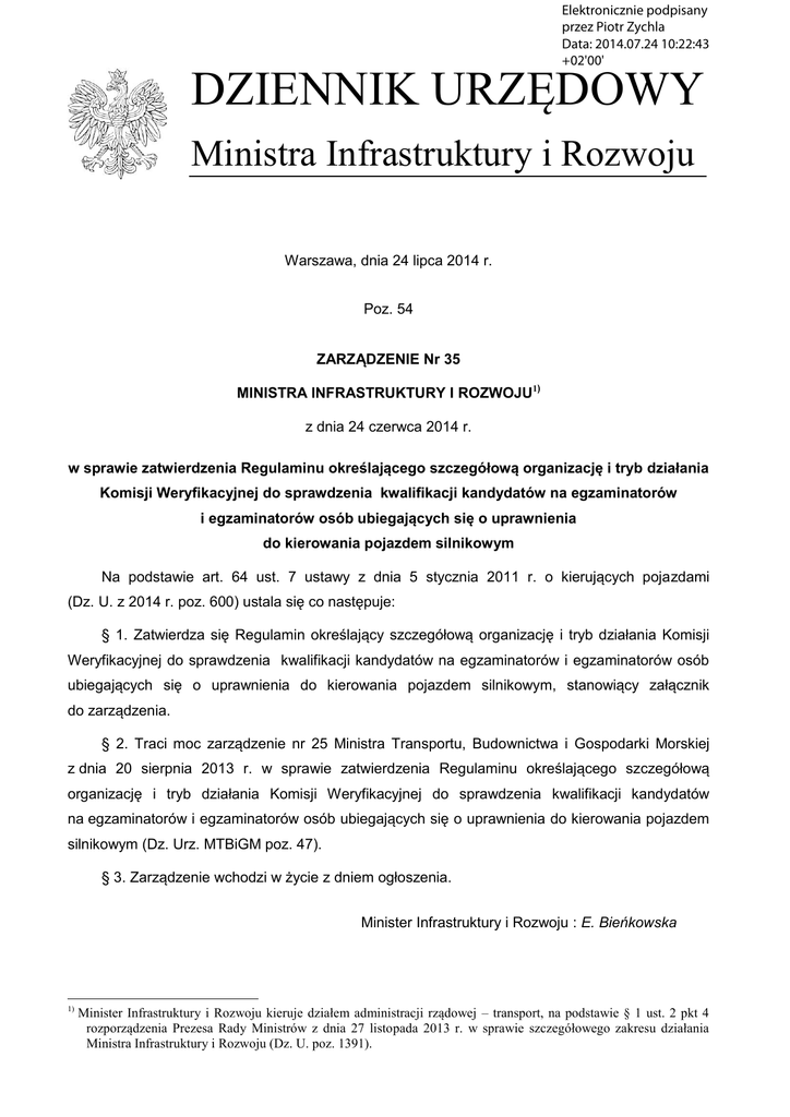 Elektronicznie podpisany przez Piotr Zychla Data: 2014.07.24 10:22:43 +02'00' DZIENNIK URZĘDOWY Ministra Infrastruktury i Rozwoju Warszawa, dnia 24 lipca 2014 r. Poz. 54 ZARZĄDZENIE Nr 35 MINISTRA INFRASTRUKTURY I ROZWOJU1) z dnia 24 czerwca 2014 r. w sprawie zatwierdzenia Regulaminu określającego szczegółową organizację i tryb działania Komisji Weryfikacyjnej do sprawdzenia kwalifikacji kandydatów na egzaminatorów i egzaminatorów osób ubiegających się o uprawnienia do kierowania pojazdem silnikowym Na podstawie art. 64 ust. 7 ustawy z dnia 5 stycznia 2011 r. o kierujących pojazdami (Dz. U. z 2014 r. poz. 600) ustala się co następuje: § 1. Zatwierdza się Regulamin określający szczegółową organizację i tryb działania Komisji Weryfikacyjnej do sprawdzenia kwalifikacji kandydatów na egzaminatorów i egzaminatorów osób ubiegających się o uprawnienia do kierowania pojazdem silnikowym, stanowiący załącznik do zarządzenia. § 2. Traci moc zarządzenie nr 25 Ministra Transportu, Budownictwa i Gospodarki Morskiej z dnia 20 sierpnia 2013 r. w sprawie zatwierdzenia Regulaminu określającego szczegółową organizację i tryb działania Komisji Weryfikacyjnej do sprawdzenia kwalifikacji kandydatów na egzaminatorów i egzaminatorów osób ubiegających się o uprawnienia do kierowania pojazdem silnikowym (Dz. Urz. MTBiGM poz. 47). § 3. Zarządzenie wchodzi w życie z dniem ogłoszenia. Minister Infrastruktury i Rozwoju : E. Bieńkowska 1) Minister Infrastruktury i Rozwoju kieruje działem administracji rządowej – transport, na podstawie § 1 ust. 2 pkt 4 rozporządzenia Prezesa Rady Ministrów z dnia 27 listopada 2013 r. w sprawie szczegółowego zakresu działania Ministra Infrastruktury i Rozwoju (Dz. U. poz. 1391). Dziennik Urzędowy Ministra Infrastruktury i Rozwoju –2– Poz. 54 Załącznik do zarządzenia nr 35 Ministra Infrastruktury i Rozwoju z dnia 24 czerwca 2014 r. (poz. 54) REGULAMIN OKREŚLAJĄCY SZCZEGÓŁOWĄ ORGANIZACJĘ I TRYB DZIAŁANIA KOMISJI WERYFIKACYJNEJ DO SPRAWDZENIA KWALIFIKACJI KANDYDATÓW NA EGZAMINATORÓW I EGZAMINATORÓW OSÓB UBIEGAJĄCYCH SIĘ O UPRAWNIENIA DO KIEROWANIA POJAZDEM SILNIKOWYM § 1. Regulamin określa szczegółową organizację oraz tryb działania Komisji Weryfikacyjnej do sprawdzenia kwalifikacji kandydatów na egzaminatorów i egzaminatorów osób ubiegających się o uprawnienia do kierowania pojazdem silnikowym, o której mowa w art. 64 ust. 1 ustawy z dnia 5 stycznia 2011 r. o kierujących pojazdami (Dz. U. z 2014 r. poz. 600), zwanej dalej „Komisją”. § 2. Komisja przeprowadza egzamin z zachowaniem przepisów: 1) ustawy z dnia 5 stycznia 2011 r. o kierujących pojazdami, zwanej dalej ,,ustawą”; 2) rozporządzenia Ministra Transportu, Budownictwa i Gospodarki Morskiej z dnia 13 lipca 2012 r. w sprawie egzaminowania osób ubiegających się o uprawnienia do kierowania pojazdami, szkolenia, egzaminowania i uzyskiwania uprawnień przez egzaminatorów oraz wzorów dokumentów stosowanych w tych sprawach (Dz. U. poz. 995 oraz z 2013 r. poz. 319), zwanego dalej „rozporządzeniem”; 3) niniejszego Regulaminu. § 3. Egzamin składają osoby zgłoszone przez właściwy organ ewidencyjny nie później niż 21 dni przed terminem egzaminu na wniosku, którego wzór określa załącznik nr 1 do Regulaminu. § 4. 1. Egzamin przeprowadza się: 1) w Wojewódzkim Ośrodku Ruchu Drogowego, 2) w sesjach egzaminacyjnych organizowanych zgodnie z planem zatwierdzonym przez ministra właściwego do spraw transportu dla grup określonych w § 48 rozporządzenia. 2. Dane osobowe osób zakwalifikowanych na egzamin w danym terminie umieszcza się w systemie informatycznym służącym do przeprowadzania egzaminów weryfikacyjnych. 3. W egzaminie mają prawo uczestniczyć w charakterze obserwatora: 1) pracownicy właściwej do spraw transportu drogowego komórki organizacyjnej urzędu obsługującego ministra właściwego do spraw transportu sprawujący nadzór nad pracą Komisji, 2) inne osoby upoważnione przez ministra właściwego do spraw transportu. Dziennik Urzędowy Ministra Infrastruktury i Rozwoju –3– Poz. 54 4. Obsługę Komisji wykonuje właściwa do spraw transportu drogowego komórka organizacyjna urzędu obsługującego ministra właściwego do spraw transportu. § 5. 1. Do obowiązków przewodniczącego Komisji należy w szczególności: 1) organizowanie i kierowanie pracą Komisji; 2) wyznaczanie: 3) a) terminu i miejsca egzaminu, b) członków komisji do przeprowadzenia egzaminu w danym terminie; powiadomienie właściwych organów ewidencyjnych o terminie i miejscu przeprowadzenia egzaminu dla poszczególnych osób; 4) wnioskowanie do kierującego właściwą do spraw transportu drogowego komórką organizacyjną urzędu obsługującego ministra właściwego do spraw transportu o opracowanie pytań egzaminacyjnych; 5) wnioskowanie do kierującego właściwą do spraw transportu drogowego komórką organizacyjną urzędu obsługującego ministra właściwego do spraw transportu o weryfikację pytań egzaminacyjnych przez niezależnych ekspertów; 6) wnioskowanie do kierującego właściwą do spraw transportu drogowego komórką organizacyjną urzędu obsługującego ministra właściwego do spraw transportu o zawarcie umów: a) z Wojewódzkim Ośrodkiem Ruchu Drogowego, w którym będzie przeprowadzony egzamin, b) z odpowiednim podmiotem na wykonanie czynności techniczno-organizacyjnych związanych z obsługą egzaminu, c) związanych z zakupem materiałów biurowych, sprzętu i wyposażenia biurowego, materiałów eksploatacyjnych, oprogramowania komputerowego niezbędnego do pracy Komisji, d) 7) innych związanych z wykonywaniem zadań Komisji; omawianie bezpośrednio przed egzaminem zasad i kryteriów oceny egzaminu oraz jego przebiegu; 8) 9) sprawdzanie prawidłowości sporządzenia i podpisywanie: a) protokołów egzaminacyjnych, b) zaświadczeń o uzyskaniu pozytywnego wyniku egzaminu, c) rozl