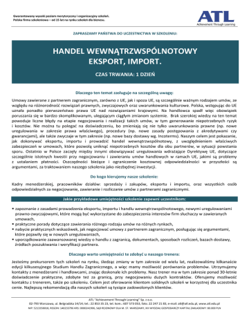 Gwarantowany wysoki poziom merytoryczny i organizacyjny szkoleń. Polska firma szkoleniowa – od 15 lat na rynku szkoleń dla biznesu. ZAPRASZAMY PAŃSTWA DO UCZESTNICTWA W SZKOLENIU: HANDEL WEWNĄTRZWSPÓLNOTOWY EKSPORT, IMPORT. CZAS TRWANIA: 1 DZIEŃ Dlaczego ten temat zasługuje na szczególną uwagę: Umowy zawierane z partnerem zagranicznym, zarówno z UE, jak i spoza UE, są szczególnie ważnym rodzajem umów, ze względu na różnorodność rozwiązań prawnych, zwyczajowych oraz uwarunkowania kulturowe. Polska, wstępując do UE uznała ponadto pierwszeństwo prawa UE nad rozwiązaniami krajowymi. Na handlowca spadł więc obowiązek poruszania się w bardzo skomplikowanym, ulegającym ciągłym zmianom systemie. Brak szerokiej wiedzy na ten temat powoduje liczne błędy na etapie negocjowania i realizacji takich umów, w tym generowanie niepotrzebnych ryzyk i kosztów. Nie można tu polegać na doświadczeniu, bo zmieniają się nie tylko uwarunkowania prawne (np. nowe uregulowania w zakresie prawa właściwego), procedury (np. nowe zasady postępowania z akredytywami czy gwarancjami), ale także zwyczaje w tym zakresie (np. nowe bazy dostawy wg. Incoterms). Naszym celem jest pokazanie, jak dokonywać eksportu, importu i prowadzić handel wewnątrzwspólnotowy, z uwzględnieniem właściwych zabezpieczeń w umowach, które pozwolą uniknąć niepotrzebnych kosztów dla obu partnerów, w sytuacji powstania sporu. Ostatnio w Polsce zaczęły między innymi obowiązywać uregulowania wdrażające Dyrektywę UE, dotyczące szczególnie istotnych kwestii przy negocjowaniu i zawieraniu umów handlowych w ramach UE, jakimi są problemy z ustalaniem płatności. Oszczędności bieżące i ograniczenie kosztownej odpowiedzialności w przyszłości są argumentami, za traktowaniem naszego szkolenia jako niezbędnej inwestycji. Do kogo kierujemy nasze szkolenie: Kadry menedżerskiej, pracowników działów: sprzedaży i zakupów, eksportu i importu, oraz wszystkich osób odpowiedzialnych za negocjowanie, zawieranie i rozliczanie umów z partnerami zagranicznymi. Jakie przykładowe umiejętności szkolenie zapewni uczestnikom: zapoznanie z zasadami prowadzenia eksportu, importu i handlu wewnątrzwspólnotowego, nowymi uregulowaniami prawno-zwyczajowymi, które mogą być wykorzystane do zabezpieczenia interesów firm słuchaczy w zawieranych umowach, praktyczne porady dotyczące zawierania różnego rodzaju umów na różnych rynkach, nabycie praktycznych wskazówek, jak negocjować umowy z partnerem zagranicznym, posługując się argumentami, które pojawiły się w nowych uregulowaniach, uporządkowanie zaawansowanej wiedzy o handlu z zagranicą, dokumentach, sposobach rozliczeń, bazach dostawy, źródłach poszukiwania i weryfikacji partnera. Dlaczego warto umiejętności te zdobyć u naszego trenera: Jesteśmy prekursorem tych szkoleń na rynku, śledząc zmiany w tym zakresie od wielu lat, realizowaliśmy kilkanaście edycji kilkusesyjnego Studium Handlu Zagranicznego, a więc mamy możliwość porównania problemów. Utrzymujemy kontakty z menedżerami i handlowcami, znając doskonale ich problemy. Nasz trener ma w tym zakresie ponad 30-letnie doświadczenie praktyczne, zdobyte też za granicą, przy negocjowaniu dużych kontraktów. Oferujemy możliwość kontaktu z trenerem, także po szkoleniu. Celem jest oferowanie klientom solidnych szkoleń w korzystnej dla uczestnika cenie. Najlepszą rekomendacją dla naszych szkoleń są tysiące zadowolonych klientów. ATL “Achievement Through Learning” Sp. z o.o. 02-793 Warszawa, ul. Belgradzka 14/14; tel.: 22 853 35 23, tel. kom.: 607 573 053, faks: 22 247 21 83, e-mail: [email protected], www.atl.edu.pl NIP: 5213358018, REGON: 140233796 KRS: 0000241906, SĄD REJONOWY DLA M. ST. WARSZAWY, XIII WYDZIAŁ GOSPODARCZY KAPITAŁ ZAKŁADOWY: 80.000 PLN Gwarantowany wysoki poziom merytoryczny i organizacyjny szkoleń. Polska firma szkoleniowa – od 15 lat na rynku szkoleń dla biznesu. PROGRAM SZKOLENIA: Jak nowa Dyrektywa UE wpłynie na zawieranie umów z partnerami z Unii Europejskiej? Ile wynosi maksymalny, dopuszczalny termin płatności w UE i jakie są konsekwencje innego uregulowania tej kwestii w umowie? Jakie aktualne rozwiązania prawne i zwyczajowe należy uwzględnić przy zawieraniu umów z partnerem zagranicznym z UE i spoza UE? Na czym polegają zmienione zasady wyboru prawa właściwego dla umowy według Rozporządzenia Parlamentu Europejskiego i Rady? Jak zawierać umowy w formie oferty z partnerem z UE i spoza UE, zgodnie z postanowieniami Konwencji CISG? W którym momencie uważa się za uzgodnione ogólne warunki sprzedaży / zakupu, w różnych systemach prawnych? Jakie były najważniejsze zmiany w nowej wersji Incoterms®2010 i jak stosować nowe reguły DAP i DAT w dostawach wewnątrzwspólnotowych? Czy kontrakty oparte na zlikwidowanej regule DDU są ważne i czy można dokonać na ich podstawie odprawy celnej? Jakie są zasady negocjowania klauzul umów jednodokumentowych, zgodnych z koncepcją kontraktów wzorcowych i wykładnią ICC (siła wyższa, kary umowne, sąd państwowy lub arbitraż, poufność…)? W jaki sposób sprzedający może zabezpieczyć się przed ryzykiem wysokiej odpowiedzialności z tytułu kar umownych? Kiedy kary umowne nie zabezpieczają właściwie interesów kupującego, w szczególności w sytuacji wysokiej szkody, spowodowanej niedotrzymaniem terminu dostawy? Czy można ustalać kary z partnerami zagranicznymi za opóźnienie czy tylko za zwłokę? W jakich sytuacjach kupujący może dochodzić roszczeń z tytułu jakości przez okres dłuższy niż określony w gwarancji jakości? Co to znaczy niezgodność dostawy z umową i jak do tego odnosi się Konwencja Narodów Zjednoczonych o umowach międzynarodowej sprzedaży towarów? Jak można wyłączyć niekorzystne dla eksportera postanowienia Konwencji CISG? Jak uwzględnić w umowach problem odpowiedzialności za produkt niebezpiec