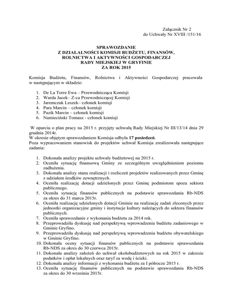 Załącznik Nr 2 do Uchwały Nr XVIII /151/16 SPRAWOZDANIE Z DZIAŁALNOŚCI KOMISJI BUDŻETU, FINANSÓW, ROLNICTWA I AKTYWNOŚCI GOSPODARCZEJ RADY MIEJSKIEJ W GRYFINIE ZA ROK 2015 Komisja Budżetu, Finansów, Rolnictwa i Aktywności Gospodarczej pracowała w następującym w składzie: 1. 2. 3. 4. 5. 6. De La Torre Ewa – Przewodnicząca Komisji Warda Jacek– Z-ca Przewodniczącej Komisji Jaremczuk Leszek– członek komisji Para Marcin – członek komisji Pazik Marcin – członek komisji Namieciński Tomasz - członek komisji W oparciu o plan pracy na 2015 r. przyjęty uchwałą Rady Miejskiej Nr III/13/14 dnia 29 grudnia 2014r. W okresie objętym sprawozdaniem Komisja odbyła 17 posiedzeń. Poza wypracowaniem stanowisk do projektów uchwał Komisja zrealizowała następujące zadania: 1. Dokonała analizy projektu uchwały budżetowej na 2015 r. 2. Oceniła sytuację finansową Gminy ze szczególnym uwzględnieniem poziomu zadłużenia. 3. Dokonała analizy stanu realizacji i rozliczeń projektów realizowanych przez Gminę z udziałem środków zewnętrznych. 4. Oceniła realizację dotacji udzielonych przez Gminę podmiotom spoza sektora publicznego. 5. Oceniła sytuację finansów publicznych na podstawie sprawozdania Rb-NDS za okres do 31 marca 2015r. 6. Oceniła realizację udzielonych dotacji Gminie na realizację zadań zleconych przez jednostki organizacyjne gminy i instytucje kultury należących do sektora finansów publicznych. 7. Oceniła sprawozdanie z wykonania budżetu za 2014 rok. 8. Przeprowadziła dyskusję nad perspektywą wprowadzenia budżetu zadaniowego w Gminie Gryfino. 9. Przeprowadziła dyskusję nad perspektywą wprowadzenia budżetu obywatelskiego w Gminie Gryfino. 10. Dokonała oceny sytuacji finansów publicznych na podstawie sprawozdania Rb-NDS za okres do 30 czerwca 2015r. 11. Dokonała analizy założeń do uchwał okołobudżetowych na rok 2015 w zakresie podatków i opłat lokalnych oraz taryf za wodę i ścieki. 12. Dokonała analizy informacji z wykonania budżetu za I półrocze 2015 r. 13. Oceniła sytuację finansów publicznych na podstawie sprawozdania Rb-NDS za okres do 30 września 2015r. 14. Dokonała analizy projektu uchwały budżetowej na 2016 r. 15. Przygotowała plan pracy na 2016 r. Wnioski komisji wypracowane do Rady Miejskiej i Burmistrza Miasta i Gminy Gryfino • • • • • • Komisja wnioskowała o: przygotowanie pisemnej informacji – w formie tabelarycznej- na temat osób zatrudnionych przez MOS w ramach kontraktów, o udzielenie pisemnej odpowiedzi na pytanie czy osoby/a pracujące/a na podstawie umowy o pracę w MOS równolegle pobierają/a wynagrodzenie w ramach umowy cywilno –prawnej /kontraktu. Komisja poprosiła również o przekazanie pisemnej informacji na temat posiadania lub nieposiadania przez MOS środka transportowego. Jeżeli MOS posiada środek transportu to Komisja poprosiła o wykazanie w ujęciu tabelarycznym, jaki to środek transportu i jakie są roczne jego koszty utrzymania. Jeżeli MOS nie posiada środka transportu to komisja wnioskowała o wykazanie, na jakim poziomie, jakie są ponoszone wydatki na transport w ciągu roku i przez jakie podmioty są usługi transportowe są świadczone na rzecz MOS. Komisja wnioskowała o przygotowanie materiału poglądowego, z którego wynikałoby jak w praktyce jest prowadzona obsługa finansowo – księgowa stowarzyszeń, które realizują zadania w zakresie sportu i rekreacji i są dotowane przez Gminę Gryfino. Komisja poprosiła o podanie informacji, jakie są miesięczne lub roczne koszty obsługi finansowo – księgowej w tych stowarzyszeniach. Komisja wnioskowała o przedstawienie w ujęciu tabelarycznym informacji o: stałych kosztach utrzymania obiektów stanowiących własność lub administrowanych przez Bibliotekę Publiczną w zakresie energii elektrycznej, energii cieplnej, opłat za wodę i ścieki, gaz, opłaty telefoniczne, internet i in. Poprosiła o krótki opis każdego z obiektów wraz z podaniem użytkowanej powierzchni. Komisja wnioskowała również przedstawienie informacji o: zatrudnieniu pracowników w oparciu o umowy o pracę oraz w oparciu o umowy cywilno – prawne w Bibliotece Publicznej, o przedstawienie Komisji wniosku dot. planu finansowego instytucji kultury i planowanej przez dyrektora BP wysokości dotacji podmiotowej z budżetu gminy na rok 2015. Komisja wraz z Komisją Rewizyjną wnioskowała o informację dotyczącą obiektów użyteczności publicznej na terenie sołectw z wyszczególnieniem: nazwy sołectwa, liczby mieszkańców, wskazaniem czy jest świetlica, (jeśli jest to proszę przedstawić koszt utrzymania budynku), remiza (koszt utrzymania budynku), boisko (koszt utrzymania), place zabaw (koszt utrzymania), szkoła, świetlica wykorzystywana przy współfinansowaniu z parafią. Komisja wraz z Komisją Rewizyjną poprosiła o przedstawienie pełnych informacji na temat posiadanych przez Gminę Gryfino pozwoleń na budowę, aktualnych i nieaktualnych, gotowej dokumentacji projektowej dla obiektów, które miałyby powstać lub być remontowane na terenie Gminy Gryfino ( świetlic, hal sportowych, budynków OSP). Komisja wnioskowała o przygotowanie materiałów poglądowych i informacyjnych na temat „Ocena wykonania zadań i wykorzystania dotacji udzielonych Gminie Gryfino na realizację zadań zleconych realizowanych przez jednostki organizacyjne gminy należące do sektora finansów publicznych. Ocena miała dotyczyć np.: pełnienia funkcji biblioteki powiatowej przez Bibliotekę Publiczną w Gryfinie, • • • • • realizacji zadań w zakresie upowszechniania kultury fizycznej przez Młodzieżowy Ośrodek Sportowy w Gryfinie, utrzymania cmentarza wojennego w Gryfinie przez Urząd Miasta i Gminy w Gryfinie. Komisja poprosiła, aby do sprawozdania z działalności MOS uzupełniająco dostarczyć informację na temat: realizacji porozumienia NR EK, – 3/09 § 2 – jakie są koszty zarządu, jeś