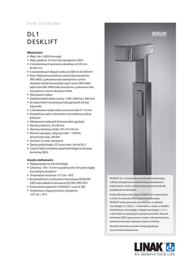 DANE TECHNICZNE DL1 DESKLIFT Właściwości: • Maks. siła: 1 600 N (na nogę) • Maks. prędkość: 43 mm/s bez obciążenia z CBD3 • 6 standardowych wymiarów zabudowy od 345 mm do 645 mm • 6 standardowych długości skoku od 200 mm do 500 mm • Kolor: Malowana proszkowo czarna tuba zewnętrzna (RAL 9005), cynkowana tuba wewnętrzna i czarna obudowa silnika lub wszystkie części czarne (RAL 9005) bądź szara (RAL 9006) tuba zewnętrzna, cynkowana tuba wewnętrzna i czarna obudowa silnika • Niski poziom hałasu • Oddzielne kable silnika (czarny: 1 000, 2 000 lub 2 300 mm) • Ze wspornikiem montażowym dla poprzeczki lub bez wspornika • 2 standardowe wersje skoku wrzeciona (skok 9 i 15 mm) • Kompaktowy wzór z siłownikiem i prowadnicą w jednej jednostce • Wbudowane wyłączniki krańcowe (bez regulacji) • Wymiary kolumny: 50 x 80 mm • Wymiary obudowy silnika: 187 x 97 x70 mm • Moment zginający: statyczny maks. 1 350 Nm, dynamiczny maks. 200 Nm • Hamulec 3 x maks. obciążenie • Typowy pobór prądu: 3,5 A przy maks. sile (na DL1) • Czujnik Halla (umożliwia napęd równoległy ze skrzynką kontrolną CBD3) Zasady użytkowania: • Napęd pojedynczy lub równoległy • Cykl pracy: 10% ~ 6 min na godzinę lub 2 min pracy ciągłej przy pełnym obciążeniu • Temperatura otoczenia: +5°C do + 40°C • Kompatybilność ze skrzynkami kontrolnymi DESKLINE® CBD3 oraz układami sterowania DP, DPA, DPB i DPH • Potwierdzona zgodność z EN 60335-1 oraz UL 962 • Temperatury magazynowania i transportu: -20°C do + 70°C DESKLIFT DL1 to kompaktowa jednostka podnosząca, w której zintegrowane zostały funkcje prowadzenia i podnoszenia. Cechy te zapewniają ogromną swobodę projektowania rozwiązań. Każda jednostka podnosząca DESKLIFT jest wyposażona w silnik. Ze skrzynką CBD3 kolumna podnosząca DESKLIFT może pracować samodzielnie, w układzie równoległym 2, 3 lub 2 + 2 siłowników, a także w układzie wielokrotnym równoległym. Napęd równoległy 2, 3 i 2 + 2 siłowników ze specjalnym oprogramowaniem skrzynki kontrolnej CBD3 opracowano z myślą o skompensowaniu nierównomiernego rozłożenia ciężaru na biurku. Skrzynka kontrolna posiada funkcję łagodnego uruchomienia/zatrzymania. Wymiary Przy długości 645 mm +4/-0 mm w pełni złożonej jednostki i długości skoku 500 mm ± 2 mm możliwe jest uzyskanie zakresu regulacji wysokości blatu od 680 do 1 180 mm. Dzięki temu biurko może być wykorzystywane w stanowiskach pracy stojącej i siedzącej. Wskazówki montażowe dla DL1 W aluminiowej obudowie silnika znajduje się 6 gwintowanych otworów M6 do mocowania obudowy do ramy biurka. Zalecamy mocowanie obudowy za pomocą 6 wysokiej jakości wkrętów M6 o odpowiedniej długości, tzn. takich, które nie zostaną wkręcone do obudowy silnika na głębokość większą niż 15 mm. Otwory zostały nagwintowane wewnątrz aluminiowej obudowy. Z tego względu moment dokręcania nie może przekroczyć 7,5 Nm. Maks. 15 mm 6 x M6 Maks. moment dokręcania: 7,5 Nm Obudowa silnika DL1/DL3 Rysunek 1 Rysunek 2 Wysokość DL1/DL3 w najniższym położeniu Min. wysokość biurka Blat biurka Materiał tłumiący Poziom podłogi Rysunek 3 Dla uniknięcia uszkodzenia jednostki podnoszącej należy zachować co najmniej 1 mm odstępu między końcami obu wkrętów M8 we wsporniku montażowym a powierzchnią jednostki podnoszącej. Użycie zbyt długich wkrętów spowoduje nacisk na wewnętrzne części urządzenia. Może to spowodować nieregularną pracę jednostki lub nawet jej uszkodzenie. (Zob. rysunek). Min. 1 mm Sprawdzić długość wkrętów! Wspornik montażowy DL1/ DL3 Poprzeczka Zalecamy stosowanie systemu DESKLINE® tylko do pchania. Do zamocowania obudowy do ramy biurka zalecamy wykorzystanie wszystkich sześciu otworów montażowych M6. Wartości momentu zginającego jednostek podnoszących mają zastosowanie tylko dla montażu przeprowadzonego w powyższy sposób. Testy przeprowadzone na obudowach zamocowanych przy wykorzystaniu tylko 4 otworów montażowych wykazały, że taki sposób montażu nie zapewnia wystarczającej wytrzymałości na skręcanie. Z uwagi na to, że blat biurka przenosi drgania, zalecamy umieszczenie materiału tłumiącego między blatem a ramą biurka. W przypadku blatów o grubości 25 mm konieczne jest zamocowanie dolnej krawędzi jednostki podnoszącej maks. 10 mm nad podłogą, tak aby wysokość biurka w najniższym położeniu wynosiła tylko 680 mm. W przypadku umieszczenia między blatem a ramą biurka materiału tłumiącego o grubości 2 mm jednostka podnosząca musi zostać zamontowana maks. 8 mm nad podłogą. Powyższe wielkości można uzyskać poprzez zamocowanie jednostki podnoszącej na płycie dolnej o grubości 6-8 mm za pomocą 4 wkrętów M6 z łbem wpuszczanym. Zalecamy użycie wkrętów o jakości min. 8.8. Moment dokręcania nie może przekroczyć 10 Nm. Umieszczenie monitora bezpośrednio nad obudową silnika może spowodować nieprawidłowe działanie monitora. Magnesy znajdujące się w silniku mogą zakłócać obraz monitora. Skala problemu zależy od odległości między silnikiem a monitorem oraz od typu monitora. W przypadku wystąpienia problemu można mu zaradzić poprzez umieszczenie stalowej płytki/rurki lub innego nieco większego materiału magnetycznego między silnikiem a blatem biurka Przykładowy montaż systemu DESKLINE® Specyfikacja techniczna Typ Siła maks. (N) na DL1 Samoczynna Prędkość przy braku blokada obciążenia (N) (mm/s) na DL1 Cykl pracy (%) Natężenie przy pełnym obciążeniu na DL1 (24 V) Skok (mm) DL1 1000 3000 43 10 3.5 A 15 DL1 1600 3000 30 10 3.5 A 9 Powyższe pomiary zostały wykonane w połączeniu ze skrzynką kontrolną CBD3. Wykresy Wykresy dla 2 x DL1 z napędem równoległym Prędkość (mm/s) DL1: prędkość w zależności od obciążenia ze skokiem 15 mm 44 43 42 41 40 39 38 37 36 35 0 500 1000 1500 2000 2500 Obciążenie (N) DL1: prędk