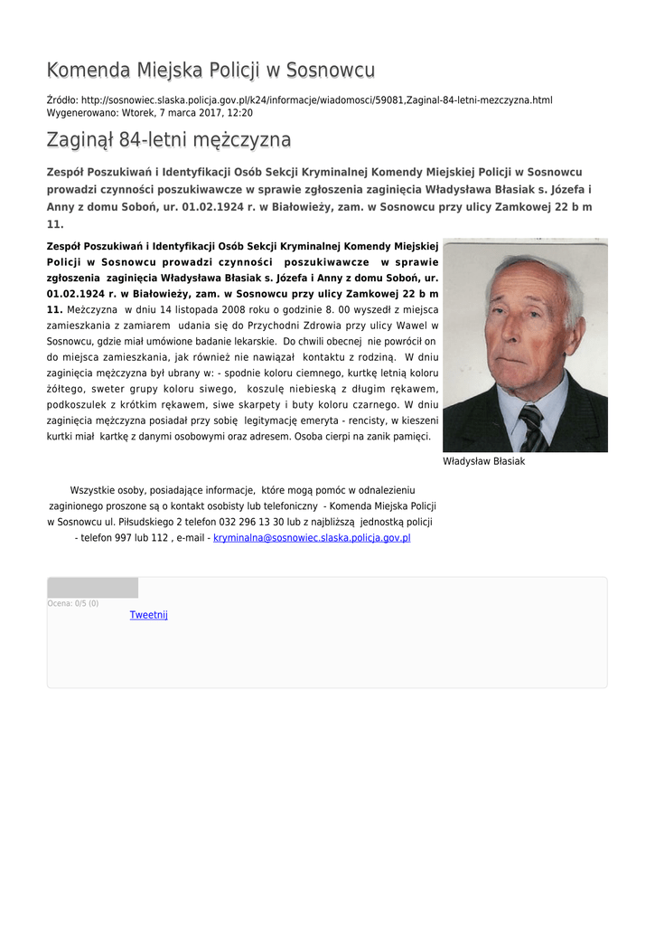 Komenda Miejska Policji w Sosnowcu Źródło: http://sosnowiec.slaska.policja.gov.pl/k24/informacje/wiadomosci/59081,Zaginal-84-letni-mezczyzna.html Wygenerowano: Wtorek, 7 marca 2017, 12:20 Zaginął 84-letni mężczyzna Zespół Poszukiwań i Identyfikacji Osób Sekcji Kryminalnej Komendy Miejskiej Policji w Sosnowcu prowadzi czynności poszukiwawcze w sprawie zgłoszenia zaginięcia Władysława Błasiak s. Józefa i Anny z domu Soboń, ur. 01.02.1924 r. w Białowieży, zam. w Sosnowcu przy ulicy Zamkowej 22 b m 11. Zespół Poszukiwań i Identyfikacji Osób Sekcji Kryminalnej Komendy Miejskiej Policji w Sosnowcu prowadzi czynności poszukiwawcze w sprawie zgłoszenia zaginięcia Władysława Błasiak s. Józefa i Anny z domu Soboń, ur. 01.02.1924 r. w Białowieży, zam. w Sosnowcu przy ulicy Zamkowej 22 b m 11. Meżczyzna w dniu 14 listopada 2008 roku o godzinie 8. 00 wyszedł z miejsca zamieszkania z zamiarem udania się do Przychodni Zdrowia przy ulicy Wawel w Sosnowcu, gdzie miał umówione badanie lekarskie. Do chwili obecnej nie powrócił on do miejsca zamieszkania, jak również nie nawiązał kontaktu z rodziną. W dniu zaginięcia mężczyzna był ubrany w: - spodnie koloru ciemnego, kurtkę letnią koloru żółtego, sweter grupy koloru siwego, koszulę niebieską z długim rękawem, podkoszulek z krótkim rękawem, siwe skarpety i buty koloru czarnego. W dniu zaginięcia mężczyzna posiadał przy sobię legitymację emeryta - rencisty, w kieszeni kurtki miał kartkę z danymi osobowymi oraz adresem. Osoba cierpi na zanik pamięci. Władysław Błasiak Wszystkie osoby, posiadające informacje, które mogą pomóc w odnalezieniu zaginionego proszone są o kontakt osobisty lub telefoniczny - Komenda Miejska Policji w Sosnowcu ul. Piłsudskiego 2 telefon 032 296 13 30 lub z najbliższą jednostką policji - telefon 997 lub 112 , e-mail - [email protected] Ocena: 0/5 (0) Tweetnij