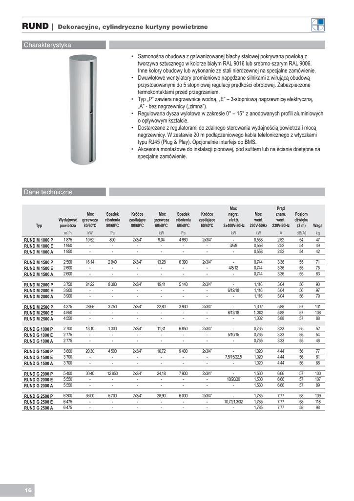 RUND | Dekoracyjne, cylindryczne kurtyny powietrzne Charakterystyka • Samonośna obudowa z galwanizowanej blachy stalowej pokrywana powłoką z tworzywa sztucznego w kolorze białym RAL 9016 lub srebrno-szarym RAL 9006. Inne kolory obudowy lub wykonanie ze stali nierdzewnej na specjalne zamówienie. • Dwuwlotowe wentylatory promieniowe napędzane silnikami z wirującą obudową przystosowanymi do 5 stopniowej regulacji prędkości obrotowej. Zabezpieczone termokontaktami przed przegrzaniem. • Typ „P” zawiera nagrzewnicę wodną, „E” – 3-stopniową nagrzewnicę elektryczną, „A” - bez nagrzewnicy („zimna”). • Regulowana dysza wylotowa w zakresie 0° – 15° z anodowanych profili aluminiowych o opływowym kształcie. • Dostarczane z regulatorami do zdalnego sterowania wydajnością powietrza i mocą nagrzewnicy. W zestawie 20 m podłączeniowego kabla telefonicznego z wtyczkami typu RJ45 (Plug & Play). Opcjonalnie interfejs do BMS. • Akcesoria montażowe do instalacji pionowej, pod sufitem lub na ścianie dostępne na specjalne zamówienie. Dane techniczne Króćce zasilające 60/40ºC Moc nagrz. elektr. 3x400V-50Hz Moc went. 230V-50Hz Prąd znam. went. 230V-50Hz Poziom dźwięku (3 m) Waga Pa 4 660 - 2x3/4” - kW 3/6/9 - kW 0,558 0,558 0,558 A 2,52 2,52 2,52 dB(A) 54 54 54 kg 47 49 42 13,28 - 6 390 - 2x3/4” - 4/8/12 - 0,744 0,744 0,744 3,36 3,36 3,36 55 55 55 71 75 63 2x3/4” - 19,11 - 5 140 - 2x3/4” - 6/12/18 - 1,116 1,116 1,116 5,04 5,04 5,04 56 56 56 90 97 79 3 750 - 2x3/4” - 22,80 - 3 930 - 2x3/4” - 6/12/18 - 1,302 1,.302 1,302 5,88 5,88 5,88 57 57 57 101 108 88 13,10 - 1 300 - 2x3/4” - 11,31 - 6 850 - 2x3/4” - 5/10/15 - 0,765 0,765 0,765 3,33 3,33 3,33 55 55 55 52 54 46 3 600 3 700 3 700 20,30 - 4 500 - 2x3/4” - 16,72 - 9 400 - 2x3/4” - 7,5/15/22,5 - 1,020 1,020 1,020 4,44 4,44 4,44 56 56 56 77 81 68 RUND G 2000 P RUND G 2000 E RUND G 2000 A 5 400 5 550 5 550 30,40 - 12 850 - 2x3/4” - 24,18 - 7 900 - 2x3/4” - 10/20/30 - 1,530 1,530 1,530 6,66 6,66 6,66 57 57 57 100 107 89 RUND G 2500 P RUND G 2500 E RUND G 2500 A 6 300 6 475 6 475 36,00 - 5 700 - 2x3/4” - 28,90 - 6 000 - 2x3/4” - 10,7/21,3/32 - 1,785 1,785 1,785 7,77 7,77 7,77 58 58 58 109 118 98 Typ Wydajność powietrza Moc grzewcza 80/60ºC Spadek ciśnienia 80/60ºC Króćce zasilające 80/60ºC Moc grzewcza 60/40ºC Spadek ciśnienia 60/40ºC RUND M 1000 P RUND M 1000 E RUND M 1000 A m3/h 1 875 1 950 1 950 kW 10,52 - Pa 890 - 2x3/4” - kW 9,04 - RUND M 1500 P RUND M 1500 E RUND M 1500 A 2 500 2 600 2 600 16,14 - 2 940 - 2x3/4” - RUND M 2000 P RUND M 2000 E RUND M 2000 A 3 750 3 900 3 900 24,22 - 8 380 - RUND M 2500 P RUND M 2500 E RUND M 2500 A 4 375 4 550 4 550 28,66 - RUND G 1000 P RUND G 1000 E RUND G 1000 A 2 700 2 775 2 775 RUND G 1500 P RUND G 1500 E RUND G 1500 A 16 RUND | Dekoracyjne, cylindryczne kurtyny powietrzne Wymiary i sposoby instalacji Instalacja pionowa Instalacja naścienna lub podsufitowa A B Wg zamówienia Wg zamówienia Wszystkie wymiary w [mm] Instalacja pozioma 17
