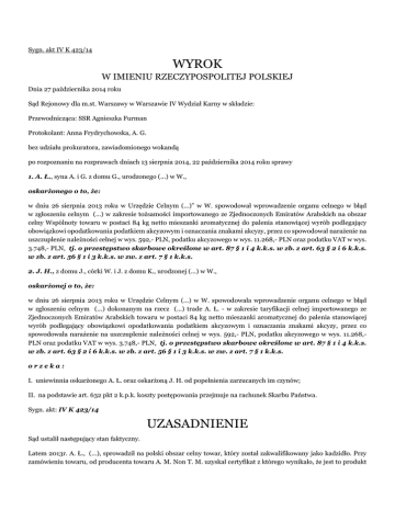 Sygn. akt IV K 423/14 WYROK W IMIENIU RZECZYPOSPOLITEJ POLSKIEJ Dnia 27 października 2014 roku Sąd Rejonowy dla m.st. Warszawy w Warszawie IV Wydział Karny w składzie: Przewodnicząca: SSR Agnieszka Furman Protokolant: Anna Frydrychowska, A. G. bez udziału prokuratora, zawiadomionego wokandą po rozpoznaniu na rozprawach dniach 13 sierpnia 2014, 22 października 2014 roku sprawy 1. A. Ł., syna A. i G. z domu G., urodzonego (...) w W., oskarżonego o to, że: w dniu 26 sierpnia 2013 roku w Urzędzie Celnym (...)” w W. spowodował wprowadzenie organu celnego w błąd w zgłoszeniu celnym (...) w zakresie tożsamości importowanego ze Zjednoczonych Emiratów Arabskich na obszar celny Wspólnoty towaru w postaci 84 kg netto mieszanki aromatycznej do palenia stanowiącej wyrób podlegający obowiązkowi opodatkowania podatkiem akcyzowym i oznaczania znakami akcyzy, przez co spowodował narażenie na uszczuplenie należności celnej w wys. 592,- PLN, podatku akcyzowego w wys. 11.268,- PLN oraz podatku VAT w wys. 3.748,- PLN, tj. o przestępstwo skarbowe określone w art. 87 § 1 i 4 k.k.s. w zb. z art. 63 § 2 i 6 k.k.s. w zb. z art. 56 § 1 i 3 k.k.s. w zw. z art. 7 § 1 k.k.s. 2. J. H., z domu J., córki W. i J. z domu K., urodzonej (...) w W., oskarżonej o to, że: w dniu 26 sierpnia 2013 roku w Urzędzie Celnym (...) w W. spowodowała wprowadzenie organu celnego w błąd w zgłoszeniu celnym (...) dokonanym na rzecz (...) trade A. Ł. - w zakresie taryfikacji celnej importowanego ze Zjednoczonych Emiratów Arabskich towaru w postaci 84 kg netto mieszanki aromatycznej do palenia stanowiącej wyrób podlegający obowiązkowi opodatkowania podatkiem akcyzowym i oznaczania znakami akcyzy, przez co spowodowała narażenie na uszczuplenie należności celnej w wys. 592,- PLN, podatku akcyzowego w wys. 11.268,PLN oraz podatku VAT w wys. 3.748,- PLN, tj. o przestępstwo skarbowe określone w art. 87 § 1 i 4 k.k.s. w zb. z art. 63 § 2 i 6 k.k.s. w zb. z art. 56 § 1 i 3 k.k.s. w zw. z art. 7 § 1 k.k.s. orzeka: I. uniewinnia oskarżonego A. Ł. oraz oskarżoną J. H. od popełnienia zarzucanych im czynów; II. na podstawie art. 632 pkt 2 k.p.k. koszty postępowania przejmuje na rachunek Skarbu Państwa. Sygn. akt: IV K 423/14 UZASADNIENIE Sąd ustalił następujący stan faktyczny. Latem 2013r. A. Ł., (...), sprowadził na polski obszar celny towar, który został zakwalifikowany jako kadzidło. Przy zamówieniu towaru, od producenta towaru A. M. Non T. M. uzyskał certyfikat z którego wynikało, że jest to produkt stosowany w aromaterapii, jako alternatywa środka leczniczego, która wykorzystuje materiały roślinne, znane jako olejki eteryczne, melasy ziołowe i inne związki aromatyczne (k.180). Ponadto eksporter poinformował go, że towar nie zawiera tytoniu i nie powinien być spożywany ani palony (k.187). W imieniu oskarżonego, zgłoszenia celnego, w procedurze dopuszczenia do obrotu (...) z dnia 26 sierpnia 2013r., dokonała agent celny J. G.. Na podstawie uzyskanej od importera informacji oraz tłumaczenia faktury (k.8, 83,84), towar został zadeklarowany jako kadzidełka zapachowe – 14 opakowań i zakwalifikowany do kodu (...) ze stawką celną 6,5% oraz stawką podatkową 23%, co oznaczało, że sprowadzany wyrób nie podlega obowiązkowi opodatkowania obowiązkiem akcyzowym. Było to już trzecie zgłoszenie celne wykonywane przez J. H. w imieniu tego importera (k.62-7 czerwca 2013r., k. 72 – 19 lipca 2013r.). Przed dokonaniem zgłoszenia celnego A. Ł. przekazał Agencji (...) fakturę w języku angielskim wraz z tłumaczeniem i oświadczenie, że importowany towar jest kadzidłem niezawierającym tytoniu (k.105-106, 83-85). W związku z uzyskaną informacja J. G. dokonała w imieniu oskarżonego zgłoszenia celnego klasyfikując towar do kodu (...). Funkcjonariusz celny J. K., mając na względzie rodzaj sprowadzonego towaru, kraj przywozu (Zjednoczone Emiraty Arabskie), nazwę nadawcy (A. T. F.) skierował przesyłkę do rewizji celnej (k. 59v). Oskarżeni są osobami niekaranymi (k. 100, 128). Powyższe ustalenia zostały dokonane w oparciu wyjaśnienia oskarżonych A. Ł. (k.187-191,114-115,) i J. H. (k.192-194, 105v), zeznania świadków L. Z. (k.60 – 61,195 – 196) i J. K. (k. 59v, 194) oraz dokumenty ujawnione na rozprawie w dniu 13 sierpnia 2014r. (k.197), w szczególności protokół badań przeprowadzonych przez laboratorium celne Izby Celnej w B. (k. 43-47) Oskarżony A. Ł. nie przyznał się do zarzucanego mu czynu. Nie kwestionował ustaleń faktycznych w zakresie przebiegu wydarzeń związanych ze sprowadzeniem towaru, zgłoszeniem celnym i zastosowanym w zgłoszeniu kodem nomenklaturowym. Nie zgodził się jednak z końcowymi wnioskami sprawozdania z badań z dnia 02 października 2013r. We wnioskach końcowych znalazło się twierdzenie, że produkty sprowadzone przez oskarżonego powinny być zakwalifikowane jako wyroby niezawierające tytoniu, przeznaczone do palenia w fajkach wodnych, do kodu (...) i zgodnie z art. 98 ust.5 i ust.8 ustawy z dnia 6 grudnia 2008r. o podatku akcyzowym są wyrobem akcyzowym. W przekonaniu oskarżonego sprowadzona przez niego melasa nie jest wyrobem akcyzowym. Wskazuje, że przed sprowadzeniem towaru otrzymał od producenta certyfikat określający przeznaczenie i skład towaru. Ponadto zapoznał się z indywidualnymi interpretacjami celnym dotyczącymi takich samych produktów z których wynikało, że nie podlegają one ustawie o podatku akcyzowym. Oskarżony dodał, że produkt miał być umieszczony w opakowaniach jednostkowych, na których miała być umieszczona informacja, że wyrób nie jest przeznaczony do jedzenia, palenia i dla dzieci. W dniu 12 listopada 2013r, Oskarżony sam wystąpił do Dyrektora Izby(...)w W. z wnioskiem o wydanie pisemnej interpretacji prawa podatkowego (k. 177-179). We wniosku wskazał taki sam skład towaru, jaki posiadał towar przez niego już sprowadzony tj. melasę, fruktoz