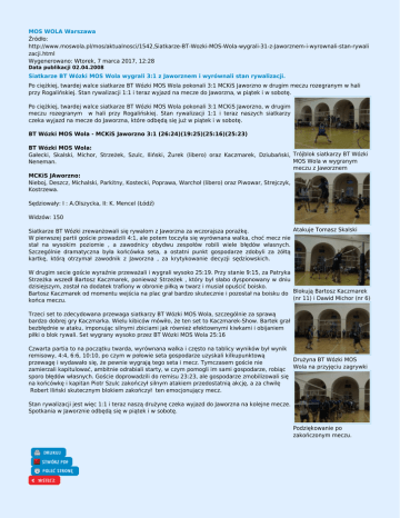 MOS WOLA Warszawa Źródło: http://www.moswola.pl/mos/aktualnosci/1542,Siatkarze-BT-Wozki-MOS-Wola-wygrali-31-z-Jaworznem-i-wyrownali-stan-rywali zacji.html Wygenerowano: Wtorek, 7 marca 2017, 12:28 Data publikacji 02.04.2008 Siatkarze BT Wózki MOS Wola wygrali 3:1 z Jaworznem i wyrównali stan rywalizacji. Po ciężkiej, twardej walce siatkarze BT Wózki MOS Wola pokonali 3:1 MCKiS Jaworzno w drugim meczu rozegranym w hali przy Rogalińskiej. Stan rywalizacji 1:1 i teraz wyjazd na mecze do Jaworzna, w piątek i w sobotę. Po ciężkiej, twardej walce siatkarze BT Wózki MOS Wola pokonali 3:1 MCKiS Jaworzno, w drugim meczu rozegranym w hali przy Rogalińskiej. Stan rywalizacji 1:1 i teraz naszych siatkarzy czeka wyjazd na mecze do Jaworzna, które odbędą się już w piątek i w sobotę. BT Wózki MOS Wola - MCKiS Jaworzno 3:1 (26:24)(19:25)(25:16)(25:23) BT Wózki MOS Wola: Gałecki, Skalski, Michor, Strzeżek, Szulc, Iliński, Żurek (libero) oraz Kaczmarek, Dziubański, Trójblok siatkarzy BT Wózki MOS Wola w wygranym Neneman. meczu z Jaworznem MCKiS JAworzno: Nieboj, Deszcz, Michalski, Parkitny, Kostecki, Poprawa, Warchoł (libero) oraz Piwowar, Strejczyk, Kostrzewa. Sędziowały: I : A.Olszycka, II: K. Mencel (Łódź) Widzów: 150 Atakuje Tomasz Skalski Siatkarze BT Wózki zrewanżowali się rywalom z Jaworzna za wczorajsza porażkę. W pierwszej partii goście prowadzili 4:1, ale potem toczyła się wyrównana walka, choć mecz nie stał na wysokim poziomie , a zawodnicy obydwu zespołów robili wiele błędów własnych. Szczególnie dramatyczna była końcówka seta, a ostatni punkt gospodarze zdobyli za żółtą kartkę, którą otrzymał zawodnik z Jaworzna , za krytykowanie decyzji sędziowskich. W drugim secie goście wyraźnie przeważali i wygrali wysoko 25:19. Przy stanie 9:15, za Patryka Strzeżka wszedł Bartosz Kaczmarek, ponieważ Strzeżek , który był słabo dysponowany w dniu dzisiejszym, został na dodatek trafiony w obronie piłką w twarz i musiał opuścić boisko. Bartosz Kaczmarek od momentu wejścia na plac grał bardzo skutecznie i pozostał na boisku do Blokują Bartosz Kaczmarek (nr 11) i Dawid Michor (nr 6) końca meczu. Trzeci set to zdecydowana przewaga siatkarzy BT Wózki MOS Wola, szczególnie za sprawą bardzo dobrej gry Kaczmarka. Wielu kibiców mówiło, że ten set to Kaczmarek-Show. Bartek grał bezbłędnie w ataku, imponując silnymi zbiciami jak również efektownymi kiwkami i obijaniem piłki o blok rywali. Set wygrany wysoko przez BT Wózki MOS Wola 25:16 Czwarta partia to na początku twarda, wyrównana walka i często na tablicy wyników był wynik remisowy, 4:4, 6:6, 10:10, po czym w połowie seta gospodarze uzyskali kilkupunktową Drużyna BT Wózki MOS przewagę i wydawało się, że pewnie wygrają tego seta i mecz. Tymczasem goście nie Wola na przyjęciu zagrywki zamierzali kapitulować, ambitnie odrabiali starty, w czym pomogli im sami gospodarze, robiąc sporo błędów własnych. Goście doprowadzili do remisu 23:23, ale gospodarze zmobilizowali się na końcówkę i kapitan Piotr Szulc zakończył silnym atakiem przedostatnią akcję, a za chwilę Robert Iliński skutecznym blokiem zakończył ten emocjonujący mecz. Stan rywalizacji jest więc 1:1 i teraz naszą drużynę czeka wyjazd do Jaworzna na kolejne mecze. Spotkania w Jaworznie odbędą się w piątek i w sobotę. Podziękowanie po zakończonym meczu. Komentarz (0) dodaj komentarz Brak komentarzy dodaj komentarz