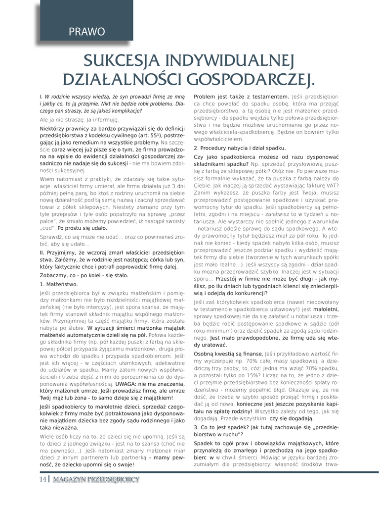 PRAWO SUKCESJA INDYWIDUALNEJ DZIAŁALNOŚCI GOSPODARCZEJ. I. W rodzinie wszyscy wiedzą, że syn prowadzi firmę ze mną i jakby co, to ją przejmie. Nikt nie będzie robił problemu. Dlaczego pan straszy, że są jakieś komplikacje? Ale ja nie straszę. Ja informuję. Niektórzy prawnicy za bardzo przywiązali się do definicji przedsiębiorstwa z kodeksu cywilnego (art. 55¹), postrzegając ją jako remedium na wszystkie problemy. Na szczęście coraz więcej już pisze się o tym, że firma prowadzona na wpisie do ewidencji działalności gospodarczej zasadniczo nie nadaje się do sukcesji - nie ma bowiem zdolności sukcesyjnej. Wiem natomiast z praktyki, że zdarzały się takie sytuacje: właściciel firmy umierał, ale firma działała już 3 dni później pełną parą, bo ktoś z rodziny uruchomił na siebie nową działalność pod tą samą nazwą i zaczął sprzedawać towar z półek sklepowych. Niestety złamano przy tym tyle przepisów i tyle osób popatrzyło na sprawę „przez palce”, że śmiało możemy powiedzieć, iż nastąpił swoisty „cud”. Po prostu się udało. Sprawdź, co się może nie udać... oraz co powinieneś zrobić, aby się udało... II. Przyjmijmy, że wczoraj zmarł właściciel przedsiębiorstwa. Załóżmy, że w rodzinie jest następca; córka lub syn, który faktycznie chce i potrafi poprowadzić firmę dalej. Zobaczmy, co - po kolei - się stało. 1. Małżeństwo. Jeśli przedsiębiorca był w związku małżeńskim i pomiędzy małżonkami nie było rozdzielności majątkowej małżeńskiej (nie było intercyzy), jest spora szansa, że majątek firmy stanowił składnik majątku wspólnego małżonków. Przynajmniej ta część majątku firmy, która została nabyta po ślubie. W sytuacji śmierci małżonka majątek małżeński automatycznie dzieli się na pół. Połowa każdego składnika firmy (np. pół każdej puszki z farbą na sklepowej półce) przypada żyjącemu małżonkowi, druga płowa wchodzi do spadku i przypada spadkobiercom. Jeśli jest ich więcej - w częściach ułamkowych, adekwatnie do udziałów w spadku. Mamy zatem nowych współwłaścicieli i trzeba dojść z nimi do porozumienia co do dysponowania współwłasnością. UWAGA: nie ma znaczenia, który małżonek umrze. Jeśli prowadzisz firmę, ale umrze Twój mąż lub żona - to samo dzieje się z majątkiem! Jeśli spadkobiercy to małoletnie dzieci, sprzedaż czegokolwiek z firmy może być potraktowana jako dysponowanie majątkiem dziecka bez zgody sądu rodzinnego i jako taka nieważna. Wiele osób liczy na to, że dzieci się nie upomną. Jeśli są to dzieci z jednego związku - jest na to szansa (choć nie ma pewności...). Jeśli natomiast zmarły małżonek miał dzieci z innym partnerem lub partnerką - mamy pewność, że dziecko upomni się o swoje! 14 MAGAZYN PRZEDSIĘBIORCY Problem jest także z testamentem. Jeśli przedsiębiorca chce powołać do spadku osobę, która ma przejąć przedsiębiorstwo, a tą osobą nie jest małżonek przedsiębiorcy - do spadku wejdzie tylko połowa przedsiębiorstwa i nie będzie możliwe uruchomienie go przez nowego właściciela-spadkobiercę. Będzie on bowiem tylko współwłaścicielem. 2. Procedury nabycia i dział spadku. Czy jako spadkobierca możesz od razu dysponować składnikami spadku? Np. sprzedać przysłowiową puszkę z farbą ze sklepowej półki? Otóż nie. Po pierwsze musisz formalnie wykazać, że ta puszka z farbą należy do Ciebie. Jak inaczej ją sprzedać wystawiając fakturę VAT? Zanim wykażesz, że puszka farby jest Twoja, musisz przeprowadzić postępowanie spadkowe i uzyskać prawomocny tytuł do spadku. Jeśli spadkobiercy są pełnoletni, zgodni i na miejscu - załatwisz to w tydzień u notariusza. Ale wystarczy nie spełnić jednego z warunków - notariusz odeśle sprawę do sądu spadkowego. A wtedy prawomocny tytuł będziesz miał za pół roku. To jednak nie koniec - kiedy spadek nabyło kilka osób, musisz przeprowadzić jeszcze podział spadku i wydzielić majątek firmy dla siebie (tworzenie w tych warunkach spółki jest mało realne...). Jeśli wszyscy są zgodni - dział spadku można przeprowadzić szybko. Inaczej jest w sytuacji sporu... Przestój w firmie nie może być długi - jak myślisz, po ilu dniach lub tygodniach klienci się zniecierpliwią i odejdą do konkurencji? Jeśli zaś którykolwiek spadkobierca (nawet niepowołany w testamencie spadkobierca ustawowy!) jest małoletni, sprawy spadkowej nie da się załatwić u notariusza i trzeba będzie robić postępowanie spadkowe w sądzie (pół roku minimum) oraz dzielić spadek za zgodą sądu rodzinnego. Jest mało prawdopodobne, że firmę uda się wtedy uratować. Osobną kwestią są finanse. Jeśli przykładowo wartość firmy wyczerpuje np. 70% całej masy spadkowej, a dziedziczą trzy osoby, to, cóż: jedna ma wziąć 70% spadku, a pozostali tylko po 15%? Licząc na to, że jedno z dzieci przejmie przedsiębiorstwo bez konieczności spłaty rodzeństwa - możemy popełnić błąd. Okazuje się, że nie dość, że trzeba w szybki sposób przejąć firmę i poskładać ją od nowa, konieczne jest jeszcze pozyskanie kapitału na spłatę rodziny! Wszystko zależy od tego, jak się dogadają. Przede wszystkim: czy się dogadają. 3. Co to jest spadek? Jak tutaj zachowuje się „przedsiębiorstwo w ruchu”? Spadek to ogół praw i obowiązków majątkowych, które przynależą do zmarłego i przechodzą na jego spadkobierców w chwili śmierci. Mówiąc w języku bardziej zrozumiałym dla przedsiębiorcy: własność środków trwa- PRAWO łych i obrotowych, stan rachunku bankowego oraz kasy, należności i zobowiązania, prawa i obowiązki wynikające z umów w obrocie, których stroną był przedsiębiorca, a którym z osobna przyglądamy się poniżej. I niestety nic więcej. Bo wszystko, co ponadto, nie jest elementem spadku. Kiedyś jeden z przedsiębiorców przekonywał mnie, że skoro od 1