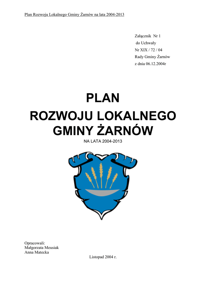 Plan Rozwoju Lokalnego Gminy Żarnów na lata 2004-2013 Załącznik Nr 1 do Uchwały Nr XIX / 72 / 04 Rady Gminy Żarnów z dnia 06.12.2004r PLAN ROZWOJU LOKALNEGO GMINY ŻARNÓW NA LATA 2004-2013 Opracowali: Małgorzata Meusiak Anna Matecka Listopad 2004 r. Plan Rozwoju Lokalnego Gminy Żarnów na lata 2004-2013 WSTĘP ....................................................................................................................................... 4 I. OBSZAR I CZAS REALIZACJI „PLANU ROZWOJU LOKALNEGO” ................................. 5 II. AKTUALNA SYTUACJA SPOŁECZNO-GOSPODARCZA NA OBSZARZE OBJĘTYM WDRAŻANIEM .......................................................................................................................... 5 2.1. Położenie, powierzchnia, ludność. ...................................................................................... 5 2.2. Środowisko przyrodnicze i zasoby naturalne...................................................................... 8 Ukształtowanie terenu ............................................................................................................... 9 Struktura gruntów według klas bonitacyjnych......................................................................... 11 Klimat....................................................................................................................................... 11 Szata roślinna, obszary chronione, istniejące formy ochrony przyrody .................................. 15 2.3.Turystyka............................................................................................................................ 16 Walory przyrodnicze ................................................................................................................ 16 Walory kulturowe..................................................................................................................... 18 2.4. Zagospodarowanie przestrzenne ...................................................................................... 22 2.4.1. Uwarunkowania ochrony środowiska naturalnego ....................................................... 22 Stan czystości wód podziemnych............................................................................................. 22 Stan czystości wód powierzchniowych.................................................................................... 23 Stan czystości powietrza ......................................................................................................... 24 Stan czystości gleb ................................................................................................................... 24 2.4.2. Infrastruktura techniczna................................................................................................ 25 System komunikacji ................................................................................................................ 25 2.4.3. Telekomunikacja ............................................................................................................ 26 2.4.4. Elektroenergetyka........................................................................................................... 26 2.4.5. Ciepłownictwo ............................................................................................................... 27 2.4.6. Zaopatrzenie w gaz......................................................................................................... 27 2.4.7. Gospodarka wodno-ściekowa ........................................................................................ 27 2.4.8. Gospodarka odpadami.................................................................................................... 28 2.4.9. Własność nieruchomości................................................................................................ 29 2.5. Gospodarka........................................................................................................................ 29 2.5.1. Główni pracodawcy........................................................................................................ 29 2.5.2. Struktura branż na terenie gminy ................................................................................... 30 2.6. Identyfikacja problemów (2.1 – 2.5.)................................................................................ 33 2.7. Rolnictwo ......................................................................................................................... 34 2.7.1. Identyfikacja problemów................................................................................................ 37 2.8. Sfera społeczna.................................................................................................................. 37 2.8.1. Sytuacja demograficzna i społeczna .............................................................................. 37 2.8.2. Warunki i jakość życia mieszkańców ............................................................................ 40 System oświaty......................................................................................................................... 40 Ochrona zdrowia ...................................................................................................................... 41 Działalność kulturalna.............................................................................................................. 41 Poziom bezpieczeństwa............................................................................................................ 41 Zasoby mieszkaniowe .............................................................................................................. 42 2.8.3. Pomoc społeczna ............................................................................................................ 42 2.8.4. Rynek pracy......................................................................