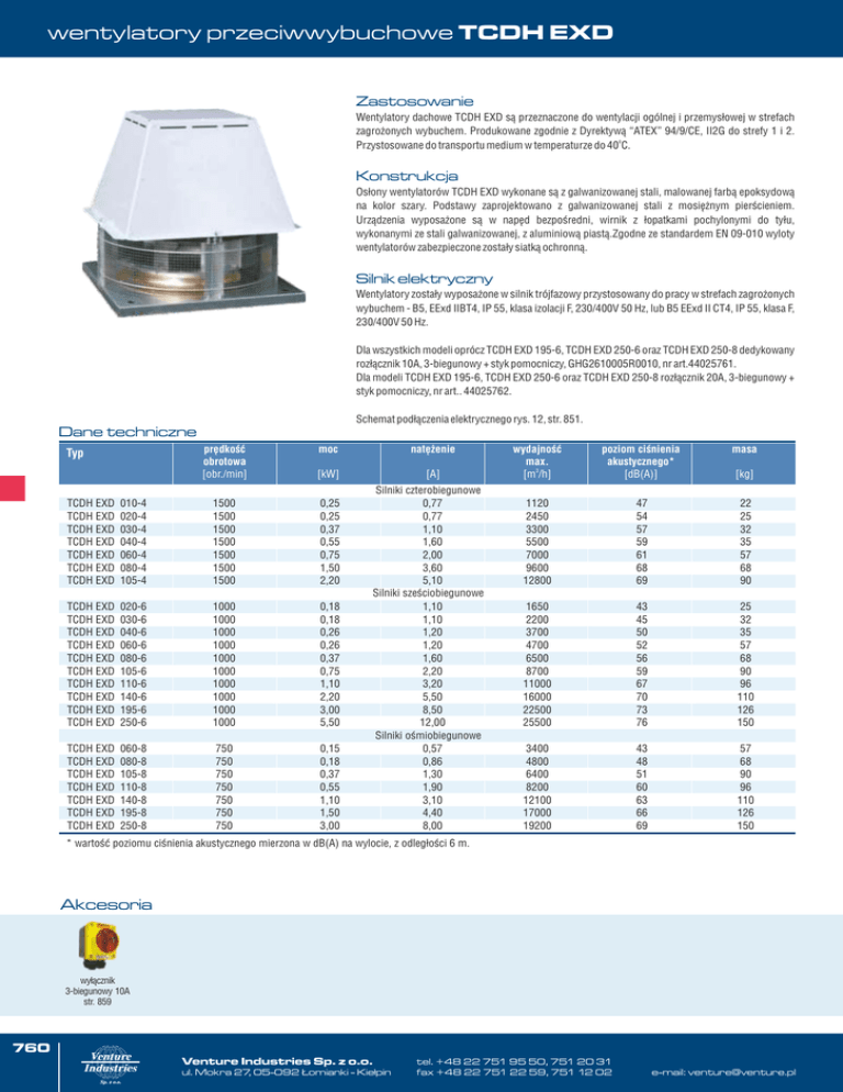 wentylatory przeciwwybuchowe TCDH EXD Zastosowanie Wentylatory dachowe TCDH EXD są przeznaczone do wentylacji ogólnej i przemysłowej w strefach zagrożonych wybuchem. Produkowane zgodnie z Dyrektywą “ATEX” 94/9/CE, II2G do strefy 1 i 2. Przystosowane do transportu medium w temperaturze do 40oC. Konstrukcja Osłony wentylatorów TCDH EXD wykonane są z galwanizowanej stali, malowanej farbą epoksydową na kolor szary. Podstawy zaprojektowano z galwanizowanej stali z mosiężnym pierścieniem. Urządzenia wyposażone są w napęd bezpośredni, wirnik z łopatkami pochylonymi do tyłu, wykonanymi ze stali galwanizowanej, z aluminiową piastą.Zgodne ze standardem EN 09-010 wyloty wentylatorów zabezpieczone zostały siatką ochronną. Silnik elektryczny Wentylatory zostały wyposażone w silnik trójfazowy przystosowany do pracy w strefach zagrożonych wybuchem - B5, EExd IIBT4, IP 55, klasa izolacji F, 230/400V 50 Hz, lub B5 EExd II CT4, IP 55, klasa F, 230/400V 50 Hz. Dla wszystkich modeli oprócz TCDH EXD 195-6, TCDH EXD 250-6 oraz TCDH EXD 250-8 dedykowany rozłącznik 10A, 3-biegunowy + styk pomocniczy, GHG2610005R0010, nr art.44025761. Dla modeli TCDH EXD 195-6, TCDH EXD 250-6 oraz TCDH EXD 250-8 rozłącznik 20A, 3-biegunowy + styk pomocniczy, nr art.. 44025762. Schemat podłączenia elektrycznego rys. 12, str. 851. Dane techniczne prędkość obrotowa [obr./min] Typ moc natężenie [kW] TCDH EXD TCDH EXD TCDH EXD TCDH EXD TCDH EXD TCDH EXD TCDH EXD 010-4 020-4 030-4 040-4 060-4 080-4 105-4 1500 1500 1500 1500 1500 1500 1500 0,25 0,25 0,37 0,55 0,75 1,50 2,20 TCDH EXD TCDH EXD TCDH EXD TCDH EXD TCDH EXD TCDH EXD TCDH EXD TCDH EXD TCDH EXD TCDH EXD 020-6 030-6 040-6 060-6 080-6 105-6 110-6 140-6 195-6 250-6 1000 1000 1000 1000 1000 1000 1000 1000 1000 1000 0,18 0,18 0,26 0,26 0,37 0,75 1,10 2,20 3,00 5,50 TCDH EXD TCDH EXD TCDH EXD TCDH EXD TCDH EXD TCDH EXD TCDH EXD 060-8 080-8 105-8 110-8 140-8 195-8 250-8 750 750 750 750 750 750 750 0,15 0,18 0,37 0,55 1,10 1,50 3,00 [A] Silniki czterobiegunowe 0,77 0,77 1,10 1,60 2,00 3,60 5,10 Silniki sześciobiegunowe 1,10 1,10 1,20 1,20 1,60 2,20 3,20 5,50 8,50 12,00 Silniki ośmiobiegunowe 0,57 0,86 1,30 1,90 3,10 4,40 8,00 wydajność max. [m3/h] poziom ciśnienia akustycznego* [dB(A)] masa 1120 2450 3300 5500 7000 9600 12800 47 54 57 59 61 68 69 22 25 32 35 57 68 90 1650 2200 3700 4700 6500 8700 11000 16000 22500 25500 43 45 50 52 56 59 67 70 73 76 25 32 35 57 68 90 96 110 126 150 3400 4800 6400 8200 12100 17000 19200 43 48 51 60 63 66 69 57 68 90 96 110 126 150 [kg] * wartość poziomu ciśnienia akustycznego mierzona w dB(A) na wylocie, z odległości 6 m. Akcesoria wyłącznik 3-biegunowy 10A str. 859 760 Venture Industries Sp. z o.o. ul. Mokra 27, 05-092 Łomianki - Kiełpin tel. +48 22 751 95 50, 751 20 31 fax +48 22 751 22 59, 751 12 02 e-mail: [email protected] wentylatory przeciwwybuchowe TCDH EXD A 430 430 540 540 660 660 800 800 946 946 1030 B OD E F 405 430 539 562 650 662 726 759 876 900 940 181 217 256 294 326 362 399 444 490 537 581 344 344 450 450 570 570 668 668 830 830 830 30 30 30 30 30 30 30 30 30 30 40 F Typ TCDH EXD 010 TCDH EXD 020 TCDH EXD 030 TCDH EXD 040 TCDH EXD 060 TCDH EXD 080 TCDH EXD 105 TCDH EXD 110 TCDH EXD 140 TCDH EXD 195 TCDH EXD 250 B Wymiary [mm] OD E A Charakterystyki pracy 4 bieguny 4 bieguny [Pa] 500 50 400 40 300 1000 100 040 030 30 70 68 65 64 71 020 70 61 200 59 010 57 56 20 100 10 0 0 Ciśnienie akustyczne z 1,5 m Ciśnienie akustyczne z 1,5 m [Pa] 67 66 62 61 58 58 64 64 60 60 0 1000 0 0.2 2000 0.4 0.6 72 68 69 3000 0.8 4000 1 1.2 74 80 600 60 400 75 060 73 74 80 77 81 77 40 74 200 20 0 0 3 /s] 78 83 3 2000 4000 6000 8000 1000012000 [m /h] 0 0.5 [m /s] 1 1.5 2 2.5 3 3.5 3 [Pa] 35 300 30 250 25 200 20 150 15 100 10 080 Ciśnienie akustyczne z 1,5 m Ciśnienie akustyczne z 1,5 m 84 79 6 biegunów [Pa] 350 0 81 77 0 6 biegunów 50 79 76 [m /h] 1.6 [m 78 80 080 3 5000 1.4 105 800 65 67 060 60 040 030 55 61 63 64 67 69 020 56 61 63 51 52 54 5 59 52 56 0 0 0 64 66 57 54 61 59 65 64 68 67 69 71 1000 2000 3000 4000 5000 6000 0.3 0.6 0.9 1.2 1.5 1.8 www.venture.pl 3 [m /h] 3 [m /s] 800 80 700 70 600 500 400 250 80 81 195 60 50 110 105 30 200 20 100 10 0 0 82 79 72 40 300 77 78 75 76 71 140 83 80 67 76 68 78 70 74 69 73 73 71 75 76 80 79 82 82 85 84 0 5000 10000 15000 20000 25000 0 1 2 3 4 5 6 7 3 [m /h] 8 [m 3 /s] 761 wentylatory przeciwwybuchowe TCDH EXD Charakterystyki pracy 8 biegunów 8 biegunów [Pa] [Pa] 25 Ciśnienie akustyczne z 1,5 m Ciśnienie akustyczne z 1,5 m 250 105 200 60 20 61 080 150 57 15 59 54 060 100 62 63 55 59 10 56 61 57 50 5 0 0 59 0 0 58 63 61 65 64 1000 2000 3000 4000 5000 6000 0.3 0.6 0.9 1.2 1.5 1.8 3 [m /h] 3 [m /s] 450 45 400 40 350 300 250 250 73 76 195 35 63 6064 140 30 25 200 20 150 15 100 10 50 5 0 0 75 61 56 110 76 65 58 66 62 58 63 60 62 0 0 4000 1 61 65 65 8000 12000 2 3 68 67 78 3 16000 4 77 [m /h] 5 3 [m /s] 762 Venture Industries Sp. z o.o. ul. Mokra 27, 05-092 Łomianki - Kiełpin tel. +48 22 751 95 50, 751 20 31 fax +48 22 751 22 59, 751 12 02 e-mail: [email protected]