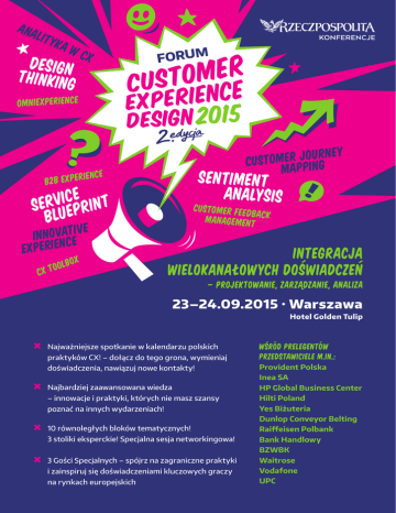 A na li t y ka w De s i g n Thinking CX FORUM Omniexperience o ur n e y J r e m o t s u C Mapping Sentiment analysis r i en c e e p x E B 2 B ce n t i v r e S uePri Bl Customer Fe edba Ma na g em en t c k i ve Innovate c experien oolb t X C ox 23–24.09.2015 · Warszawa Hotel Golden Tulip �Najważniejsze spotkanie w kalendarzu polskich praktyków CX! – dołącz do tego grona, wymieniaj doświadczenia, nawiązuj nowe kontakty! � Najbardziej zaawansowana wiedza – innowacje i praktyki, których nie masz szansy poznać na innych wydarzeniach! �10 równoległych bloków tematycznych! 3 stoliki eksperckie! Specjalna sesja networkingowa! �3 Gości Specjalnych – spójrz na zagraniczne praktyki i zainspiruj się doświadczeniami kluczowych graczy na rynkach europejskich wsród prelegentów przedstawiciele m.in.: Provident Polska Inea SA HP Global Business Center Hilti Poland Yes Biżuteria Dunlop Conveyor Belting Raiffeisen Polbank Bank Handlowy BZWBK Waitrose Vodafone UPC Szanowni Państwo, Serdecznie zapraszam do udziału w II edycji Forum Customer Experience Design. Ubiegłoroczne doświadczenia oraz wnikliwa analiza potrzeb szkoleniowych zaowocowały stworzeniem programu, który jest unikalny w skali rynku, a przekazywana wiedza jest znacznie bardziej zaawansowana. Ideą tegorocznego Forum Customer Experience Design jest przekazanie Państwu praktycznej wiedzy o konkretnych narzędziach i rozwiązaniach, które pozwolą w pełni zarządzać doświadczeniami Waszych klientów. W programie nie zabraknie zarówno gości zagranicznych jak i doświadczonych praktyków z Polski, a możliwość samodzielnego wyboru prelekcji ułatwi Państwu poznanie interesujących Was aspektów Customer Experience. Serdecznie zapraszam do udziału Tomasz Jakubiak Project Manager Customer Experie nce jest sumą doświad czeń jakich doznaje na sz Klient podczas każdej int erakcji z naszą firmą. emocji, nce to ekonomia Customer Experie sa na an sz To ! światem a emocje…rządzą eń, cz iad św do h yc wn kreowanie pozy ty anie st ro edzialność za sp ale i duża odpowi . iom an kiw ześniej ocze zbudowanym wc Agnieszka Olek Marzena Wiszniewska Client Experience & Quality Manager O&T Sub-Sector Bank Handlowy Customer Experience Manager Bank Zachodni WBK Magdalena Opalińska-Kruk Czym jest dla mnie Customer Experience? Ekspert ds. Zarządzania Doświadczeniami Klienta Provident Polska ent ma z firmą iadczeń, jakie kli św do h kic st ia jego relacji zy ws To suma z cały okres trwan ze pr u yk st ch ta liw ych punk lenia. Jeśli firmy to miara zadowo we wszelkich moż ia, en cz iad cia, św Do dłużej. (unikalne) pr zeży z firmą, a nawet yjne i w yjątkowe kc ra rto at wa nie go cz łą ze ac tom wy zy ty wne. Dl zapewniają klien ch marką będą po ji z i kc w sfa tó ty en sa um m ns zio ko eń? Wysoki po cz to doświadczenia iad św ż do cie ch ze zy a to jest pr ienia najleps jalności Klientów, dążyć do zapewn i lo ia an uf za iem je utrz yman klientów skutku u każdej firmy. podstawą sukces Tak mówią praktycy. Dołącz do nich na Forum Customer Experience Design 2015 Partnerzy FORUM Forum CUSTOMER EXPERIENCE DESIGN 2015 2 23 września dzień pierwszy 9 920 Rejestracja uczestników i poranna kawa Poranna sesja networkingowa – czas na poznanie się, wymianę wizytówek pomiędzy uczestnikami i prelegentami 930 Misja Innowacja! Manager Customer Experience – jak sprostać wielowymiarowym potrzebom organizacji i stać się niezbędnym ogniwem w strukturze firmy Magdalena Opalińska-Kruk, Ekspert ds. Zarządzania doświadczeniami klienta, Provident Polska CASE STUDY PROVIDENT POLSKA � CX Manager – Ambasador, Champion, Influencer… jak sprostać wielopoziomowym oczekiwaniom nowoczesnego biznesu � Jak określić obszar działań managera CEM i swoje miejsce w strukturze firmy? � W jaki sposób zorganizować komunikację pomiędzy CX Managerem a pozostałymi działami firmy? 1010 Zmiana krytyka w promotora. Praktyczne wykorzystanie badań NPS Mirosława Kawala, Dyrektor ds. Relacji z Klientami, UPC Polska CASE STUDY UPC POLSKA 11 1115 Przerwa na kawę Emotional Intelligence in Customer Experience – an art or a science?* Sandra Thompson, Customer Experience Consultant, Vodafone; Founding Director, Exceed All Expectations Alastair Boot, Customer Experience Lead, Waitrose � Emotional intelligence drives market leading customer experience � Understand how the science behind customer personas can help achieve greater rapport � Find out more about the art of engaging the people who deliver exceptional customer experiences. 1215 Customer Feedback Management – jak zmaksymalizować wykorzystanie informacji pochodzących od klientów i pracowników w celu stworzenia spójnej strategii Customer Experience Management? Marta Bryła-Gozdyra, Dyrektor Zarządzająca, Everbe � Jak przygotować spójną strategię zbierania rozproszonej informacji zwrotnej? � W jaki sposób analizować, interpretować i zarządzać dużą ilością danych pochodzących z różnych kanałów w oparciu o Customer Journey Map? (np.: ankiety, telefon, chat, video, social media) � Jak przełożyć zinterpretowane dane na realne działania biznesowe w oparciu o model Close the Loop? 1305 Customer Experience od kuchni – jak zapewnić pozytywne doświadczenia na różnych etapach cyklu życia klienta Michał Skowroński, Senior Sales Consultant, Oracle � W jaki sposób dyskretnie zaangażować potencjalnego i istniejącego klienta z uwzględnieniem jego zachowania i reakcji na przekazywany content � Jak efektywnie i skutecznie zastosować strategię multi-channel biorąc pod uwagę zarówno customer experience jak i uwarunkowania rynkowe *prelekcja w języku angielskim Forum CUSTOMER EXPERIENCE DESIGN 2015 3 23 września dzień pierwszy 1340 Lunch 1430 Jak projektować doświadczenia klienta na każdym etapie kontaktu z Twoją firmą? Piotr Stachowiak, Customer Service Manager, Hilti Poland 
