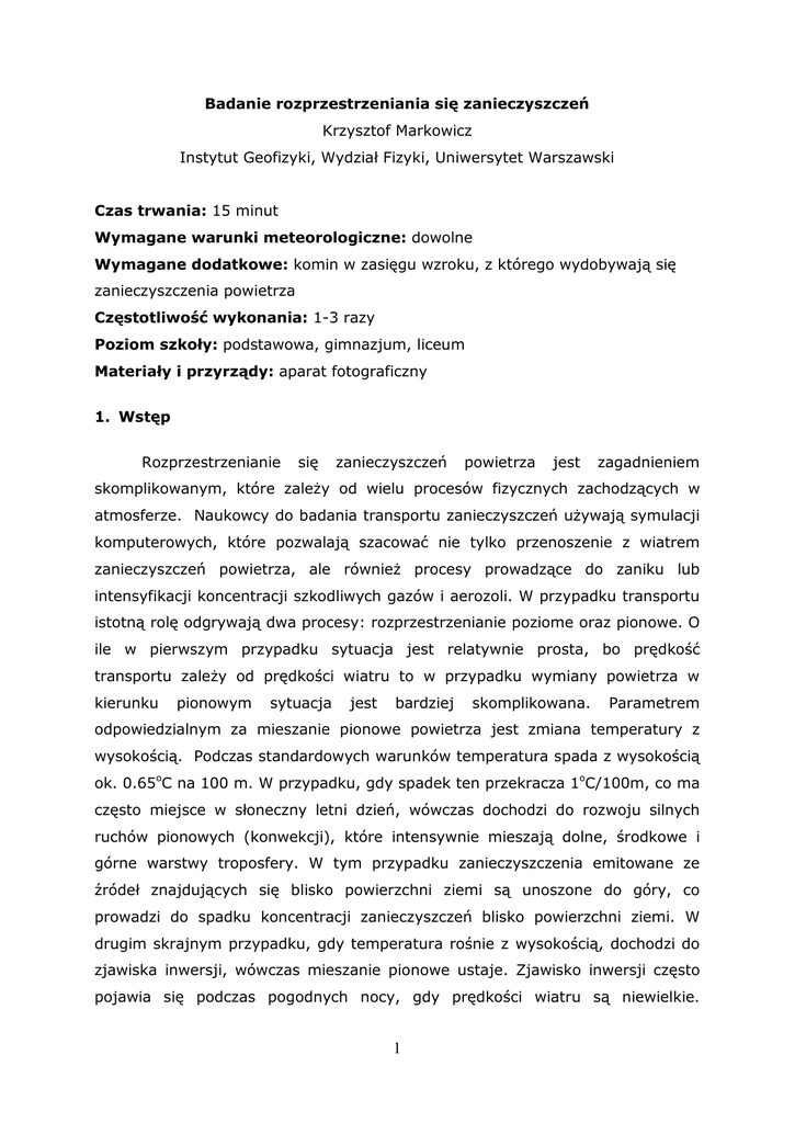 Badanie rozprzestrzeniania się zanieczyszczeń Krzysztof Markowicz Instytut Geofizyki, Wydział Fizyki, Uniwersytet Warszawski Czas trwania: 15 minut Wymagane warunki meteorologiczne: dowolne Wymagane dodatkowe: komin w zasięgu wzroku, z którego wydobywają się zanieczyszczenia powietrza Częstotliwość wykonania: 1-3 razy Poziom szkoły: podstawowa, gimnazjum, liceum Materiały i przyrządy: aparat fotograficzny 1. Wstęp Rozprzestrzenianie się zanieczyszczeń powietrza jest zagadnieniem skomplikowanym, które zależy od wielu procesów fizycznych zachodzących w atmosferze. Naukowcy do badania transportu zanieczyszczeń używają symulacji komputerowych, które pozwalają szacować nie tylko przenoszenie z wiatrem zanieczyszczeń powietrza, ale również procesy prowadzące do zaniku lub intensyfikacji koncentracji szkodliwych gazów i aerozoli. W przypadku transportu istotną rolę odgrywają dwa procesy: rozprzestrzenianie poziome oraz pionowe. O ile w pierwszym przypadku sytuacja jest relatywnie prosta, bo prędkość transportu zależy od prędkości wiatru to w przypadku wymiany powietrza w kierunku pionowym sytuacja jest bardziej skomplikowana. Parametrem odpowiedzialnym za mieszanie pionowe powietrza jest zmiana temperatury z wysokością. Podczas standardowych warunków temperatura spada z wysokością ok. 0.65oC na 100 m. W przypadku, gdy spadek ten przekracza 1oC/100m, co ma często miejsce w słoneczny letni dzień, wówczas dochodzi do rozwoju silnych ruchów pionowych (konwekcji), które intensywnie mieszają dolne, środkowe i górne warstwy troposfery. W tym przypadku zanieczyszczenia emitowane ze źródeł znajdujących się blisko powierzchni ziemi są unoszone do góry, co prowadzi do spadku koncentracji zanieczyszczeń blisko powierzchni ziemi. W drugim skrajnym przypadku, gdy temperatura rośnie z wysokością, dochodzi do zjawiska inwersji, wówczas mieszanie pionowe ustaje. Zjawisko inwersji często pojawia się podczas pogodnych nocy, gdy prędkości wiatru są niewielkie. 1 Wówczas zanieczyszczenia są niemal uwieziony tuż przy powierzchni ziemi i ich koncentracja bardzo szybko rośnie. Zjawisko to jest bardzo niekorzystne na obszarach gdzie występują intensywne źródła zanieczyszczeń oraz w chłodnej porze roku, gdy wysoka jest tzw. „niska emisja” z systemów ogrzewania. 2. Obserwacje zachowania dymu z komina Pomimo, że pomiary zjawiska inwersji są trudne gdyż wymagają sondowania atmosfery przy pomocy balonu meteorologicznego lub samolotu, to jednak mieszanie konwekcyjne inwersja w całej warstwie inwersja przygruntowa inwersja powyżej pewnej wysokości Ryc. 1 Rozprzestrzenianie się zanieczyszczeń w zależności od stanu atmosfery. 2 wizualne obserwacje zachowania dymu emitowanego z kominów (szczególnie wysokich) dostarczają nam informacji o stanie atmosfery. W przypadku, gdy dym z komina meandruje, wznosząc się i opadając na przemian świadczy to o intensywnym mieszaniu pionowym i braku kumulacji zanieczyszczeń (Ryc.1a). W przypadku, gdy dym rozciąga się niemal horyzontalnie a ponadto nie smuga dymu nie rozszerza się ani w górę ani w dół świadczy to o inwersji w grubej warstwie atmosfery. Jeśli mamy do czynienia z inwersja tylko w cienkiej przygruntowej warstwie powietrza i gdy komin znajduje się powyżej inwersji to wówczas emitowane zanieczyszczenia zostają powyżej inwersji, która w tym przypadku chroni nas przed dużymi koncentracjami zanieczyszczeń. W ostatnim przypadku, gdy inwersja pojawia się powyżej pewnej wysokości (inwersja podniesiona) to wówczas dym układa się poniżej wysokości inwersji prowadząc do silnej kumulacji zanieczyszczeń przy powierzchni ziemi. Przedstawione powyżej sytuacje ukazują, dlaczego należy budować wysokie kominy. 3. Przeprowadzenie obserwacji Pomiary wykonujemy w czasie dnia w miejscu, w którym widoczny jest co najmniej jeden dość wysoki komin z którego wydobywa się dym. Przez ok. 5 minut obserwujemy zachowanie dymu oraz wykonujemy fotografie obserwowanego zjawiska. 4. Protokół wyników Wypełnij tabele wpisując datę pomiaru, godzinę w czasie uniwersalnym (odjąć 2 godziny dla czasu letniego lub odjąć 1 godzinę dla czasu zimowego), oraz na podstawie obserwacji zachowania dymy wybieramy jedną z możliwości przedstawioną na Ryc. 1. data i dym dym płynie dym rozszerza dym rozszerza godzina meandruje poziomo i nie się ale nie się ale tylko w [UTC] góra-dół rozszerza się dochodzi do dół obserwacji ziemi 3 5. Analiza wyników Na podstawie kilku obserwacji zastanów się czy można stwierdzić: kiedy pojawia się inwersja a kiedy występują intensywne procesy mieszania pionowego; czy inwersja pojawią się częściej dniem czy nocą? 6. Literatura [1] Zjawisko inwersji http://pl.wikipedia.org/wiki/Inwersja_temperatury 4