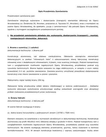 Załącznik nr 6 do SIWZ Opis Przedmiotu Zamówienia Przedmiotem zamówienia jest: Zamówienie obejmuje wykonanie i dostarczenie (transport) elementów dekoracji do Opery Wrocławskiej (ul. Świdnicka 35, Wrocław, pracownia ul. Tęczowa 57, Wrocław), wraz z montażem na scenie Opery Wrocławskiej, do spektaklu „Łucja z Lammermooru” dla potrzeb Opery Wrocławskiej, zgodnie z wymogami szczegółowymi przedstawionymi poniżej. I. Na przedmiot zamówienia składają się: wykonanie, dostarczenie (transport) , montaż, następujących elementów dekoracji: 1. Brama z suwnicą ( 1 sztuka) dokumentacja techniczna: 1.Brama.pdf Konstrukcja aluminiowa, lub stalowa cienkościenna. Obłożenie zewnętrzne elementami dekoracyjnymi w postaci "nitowanych listw" z odwzorowaniem starej fabrycznej konstrukcji nitowanej wraz z dodatkowymi olinowaniami, trybami, oraz suwnicą (imitacja). Podział transportowy ram z uwzględnieniem możliwości logistycznych Opery Wrocławskiej, przykładowy podział w/g rysunków technicznych. Brama będzie wieszana na ciągu elektrycznym, w związku z czym należy przewidzieć 3-4 szt. punktów zawieszenia. Zawiesia powinny umożliwiać prawidłowe zbalansowanie konstrukcji oraz równe zawieszenie w pionie i poziomie. Maksymalny ciężar każdej ściany 250 kg. Malowanie farbą strukturalną (efekt lakieru młotkowego) w kolorze srebrnoszarym . Dokładne wytyczne dotyczące wykończenia artystycznego według wskazówek scenografa oraz akceptacji próbek malowania przedstawionych przez wykonawcę. 2. Ściany fabryki dokumentacja techniczna: 2.fabryka.pdf W scenie fabryki występują 4 ściany: a). Jedna ściana horyzontalna z podnoszonym oknem (10700 x 7500 mm) Element wieszany na sztankiecie o wymiarach określonych w dokumentacji technicznej. Konstrukcja aluminiowa (np profil 40x20x2 mm) obłożona sklejką o grubości 4-6mm. Podział transportowy ram z uwzględnieniem możliwości logistycznych Opery Wrocławskiej, przykładowy podział w/g rysunków technicznych. Na ścianie występują elementy przestrzenne, gzymsy, listwy wykonane w technice termoformowania PCV. W oknach konstrukcja kratownicy / szprosy usztywniające. Szyby okien przeźroczyste. Dolne okno w części centralnej ściany, zaznaczone na rysunkach technicznych funkcjonuje jako niezależna rama zawieszona na osobnym sztankiecie. Podczas akcji scenicznej okno zostaje uniesione w górę. Z uwagi na to należy przewidzieć dodatkowe punkty zawieszenia (2 punkty z regulowaną wysokością), prowadnice umożliwiające bezkolizyjny i cichy przesuw oraz blokady uniemożliwiające ruch podczas podnoszenia / opuszczania konstrukcji. Ramy ściany złączone u podstawy przy pomocy płaskownika stalowego. Ściana będzie wieszana na ciągu elektrycznym, w związku z czym należy przewidzieć 4-6 szt. punktów zawieszenia. Zawiesia powinny umożliwiać prawidłowe, zbalansowane zawieszenie konstrukcji w pionie i poziomie. Maksymalny ciężar ściany 380 kg. b). Trzy ściany horyzontalne 3 ściany podwieszane na sztankietach o wymiarach określonych w dokumentacji technicznej. Konstrukcja aluminiowa (np. profil 40x20x2 mm) obłożona sklejką o grubości 4-6mm. Podział transportowy ram z uwzględnieniem możliwości logistycznych Opery Wrocławskiej, przykładowy podział w/g rysunków technicznych. Na ścianie występują elementy przestrzenne, gzymsy, listwy wykonane w technice termoformowania PCV. W oknach konstrukcja kratownicy / szprosy usztywniające. Szyby okien przeźroczyste. Ściany będą wieszane na ciągach elektrycznych, w związku z czym należy przewidzieć od 2-3 szt. punktów zawieszenia na każdej ze ścian. Zawiesia powinny umożliwiać prawidłowe, zbalansowane zawieszenie konstrukcji w pionie i poziomie. Kominek umieszczony na ścianie centralnej nie wchodzi w skład zamówienia. Maksymalny ciężar każdej ściany 180 kg. Elementem uzupełniającym w tej scenie jest mapa nadrukowana na materiale typu canvas (pliki graficzne do wydruku dostarczy zamawiający niezwłocznie po udzieleniu zamówienia). Obrzeża nadruku obszyte wraz z umieszczonymi oczkami montażowymi (co 25 cm). Konstrukcja ramy wykonana z profili stalowych, demontowana. Konstrukcja umożliwia równomierne rozpięcie nadruku. Na obrzeżach elementy przestrzenne ozdobne w formie listw oraz imitacji nitów (wzór w dokumentacji: Brama.pdf). Rama wyposażona w 2 punkty zawieszenia. Malowanie wszystkich powierzchni ścian fabryki farbą strukturalną kolorze szarym, dalsze wytyczne dotyczące wykończenia (efekt lakieru młotkowego) w artystycznego według wskazówek scenografa oraz akceptacji próbek malowania przedstawionych przez wykonawcę. 3. Ściana pokoju Łucji dokumentacja techniczna: 3.pokoj.pdf Element wieszany na sztankiecie o wymiarach określonych w dokumentacji technicznej. Konstrukcja aluminiowa (np. profil min. 40x20x2 mm) obłożona sklejką o grubości 6mm. Ściana składa się z elementu centralnego oraz dwóch (lewa i prawa) ścianek bocznych rozkładanych przy pomocy zawiasów (dokumentacja techniczna). Ściany uchylne boczne wyposażone w blokady uniemożliwiające ich otwarcie podczas ruchu ściany. Podział transportowy ram z uwzględnieniem możliwości logistycznych Opery Wrocławskiej, przykładowy podział w/g rysunków technicznych. Na ścianie występują elementy przestrzenne, sztukateria drewniana . Ściana będzie wieszana na ciągu elektrycznym, w związku z czym należy przewidzieć 2-4 szt. punktów zawieszenia. Zawiesia powinny umożliwiać prawidłowe z balansowanie konstrukcji oraz równe zawieszenie w pionie i poziomie. Maksymalny łączny ciężar ściany centralnej oraz dwóch (lewa i prawa) ścianek bocznych 300 kg. Malowanie wszystkich powierzchni frontowych: bejcowanie z zachowaniem słoi drewna, w charakterze starej boazerii ściennej / kasetonowej. 4. Podesty dokumentacja techniczna: 4.podesty.pdf Podesty wraz z stopniami (wg projektu). Konstrukcja z profili aluminiowych na kołach