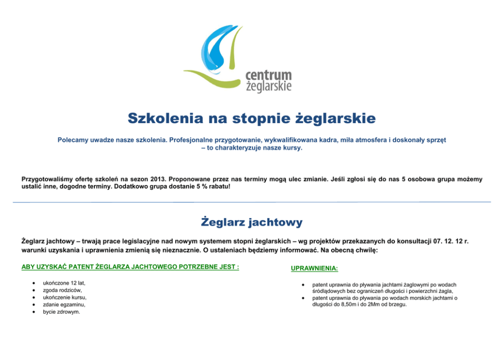 Szkolenia na stopnie żeglarskie Polecamy uwadze nasze szkolenia. Profesjonalne przygotowanie, wykwalifikowana kadra, miła atmosfera i doskonały sprzęt – to charakteryzuje nasze kursy. Przygotowaliśmy ofertę szkoleń na sezon 2013. Proponowane przez nas terminy mogą ulec zmianie. Jeśli zgłosi się do nas 5 osobowa grupa możemy ustalić inne, dogodne terminy. Dodatkowo grupa dostanie 5 % rabatu! Żeglarz jachtowy Żeglarz jachtowy – trwają prace legislacyjne nad nowym systemem stopni żeglarskich – wg projektów przekazanych do konsultacji 07. 12. 12 r. warunki uzyskania i uprawnienia zmienią się nieznacznie. O ustaleniach będziemy informować. Na obecną chwilę: ABY UZYSKAĆ PATENT ŻEGLARZA JACHTOWEGO POTRZEBNE JEST : ukończone 12 lat, zgoda rodziców, ukończenie kursu, zdanie egzaminu, bycie zdrowym. UPRAWNIENIA: patent uprawnia do pływania jachtami żaglowymi po wodach śródlądowych bez ograniczeń długości i powierzchni żagla, patent uprawnia do pływania po wodach morskich jachtami o długości do 8,50m i do 2Mm od brzegu. RODZAJ TERMINY SZKOLENIA Kurs weekendowy Kurs weekendowy Kurs weekendowy 12.04 - godz 17:00 spotkanie organizacyjne 13 – 14.04 20 – 21.04 27 – 28.04 4 – 5.05 11 – 12.05 24.05 – godz 17:00 – spotkanie organizacyjne 25 – 26.05 01 – 02.06 08 – 09.06 15 – 16.06 22 – 23.06 08.09 – godz 17:00 – spotkanie organizacyjne 07 – 08.09 14 – 15.09 21 – 22.09 28 – 29.09 05 – 06.10 EGZAMIN 800 zł – KURS 19 – 20.05 realizacja programu PZŻ materiały szkoleniowe ubezpieczenie opieka instruktora żeglarstwa 250 zł* - EGZAMIN + PATENT ( płatne gotówką przed egzaminem ) 800 zł – KURS 29 - 30.06 12 – 13.10 * opłata za egzamin zgodnie z cennikiem PZŻ 50% ulgi dla młodzieży uczącej się do lat 26. Opłata w gotówce przed egzaminem W CENIE: CENA 250 zł* - EGZAMIN + PATENT ( płatne gotówką przed egzaminem ) 800 zł – KURS 250 zł* - EGZAMIN + PATENT ( płatne gotówką przed egzaminem ) Sternik jachtowy Sternik jachtowy – wg projektów przekazanych do konsultacji 07. 12. 12 r. sternik jachtowy ma być zastąpiony stopniem jachtowego sternika morskiego – warunki uzyskania patentu j. st. m. mają być podobne do egzaminu na dotychczasowy stopień sternika jachtowego; uprawnienia mają być znacznie większe. W projekcie rozporządzenia zaproponowano możliwość podejścia do egzaminu na patent żeglarza czy sernika morskiego bez konieczności odbycia szkolenia na kursie. ABY UZYSKAĆ PATENT ŻEGLARZA JACHTOWEGO POTRZEBNE JEST : UPRAWNIENIA: ukończone18 lat, bycie zdrowym, ukończenie kursu na stopień, wypływanie 200 godz.(żeglugi) w 2 lub więcej rejsach morskich, zdanie egzaminu. RODZAJ TERMIN Kurs weekendowy Kurs weekendowy 10.05 - godz 17:00 spotkanie organizacyjne 11 – 12.05 18 – 19.05 25 – 26.05 01 – 02.06 08 – 09.06 13.09 – godz 17:00 – spotkanie organizacyjne 14 – 15.09 21 – 22.09 28 – 29.09 05 – 06.10 12 – 13.10 prowadzenie jachtów żaglowych po wodach śródlądowych bez ograniczeń długości prowadzenie jachtów żaglowych o długości całkowitej do 12 m po wodach Morza Bałtyckiego i innych mórz zamkniętych oraz wodach pływowych w strefie do 20 Mm od brzegu. EGZAMIN CENA 900 zł - KURS 15 – 16.06 350 zł* - EGZAMIN + PATENT ( płatne gotówką przed egzaminem ) 900 zł - KURS 19 - 20.06 * płata za egzamin zgodnie z cennikiem PZŻ 50% ulgi dla młodzieży uczącej się do lat 26. Opłata w gotówce przed egzaminem 350 zł* - EGZAMIN + PATENT ( płatne gotówką przed egzaminem ) W CENIE: realizacja programu PZŻ materiały szkoleniowe ubezpieczenie opieka instruktora żeglarstwa MOŻLIWY JEST BEZPŁATNY NOCLEG NA JACHCIE LUB POD NAMIOTEM Do egzaminu należy posiadać opinie z rejsów morskich co najmniej 200h żeglugi w co najmniej 2 rejsach Minimalna liczba uczestników na kursie to 5 osób. W przypadku braku chętnych kurs zostanie odwołany. JESTEŚ ZAINTERESOWANY? NAPISZ DO NAS JUŻ DZIŚ! [email protected] UWAGA PROMOCJA!DLA GRUP ZNIŻKA! ZBIERZ GRUPĘ 5 - OSOBOWĄ, A DOSTANIECIE 5% ZNIŻKI! MOŻLIWE JEST TAKŻE USTALENIE INNEGO, WYBRANEGO PRZEZ GRUPĘ TERMINU Centrum Żeglarskie ul. Przestrzenna 21 Szczecin 70-800 tel. 091 46 00 844 [email protected]