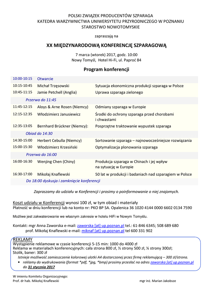 POLSKI ZWIĄZEK PRODUCENTÓW SZPARAGA KATEDRA WARZYWNICTWA UNIWERSYTETU PRZYRODNICZEGO W POZNANIU STAROSTWO NOWOTOMYSKIE zapraszają na XX MIĘDZYNARODOWĄ KONFERENCJĘ SZPARAGOWĄ 7 marca (wtorek) 2017, godz. 10:00 Nowy Tomyśl, Hotel Hi-Fi, ul. Paproć 84 Program konferencji 10:00-10:15 Otwarcie 10:15-10:45 Michał Trzęsowski Sytuacja ekonomiczna produkcji szparaga w Polsce 10:45-11:15 Jamie Petchell (Anglia) Uprawa szparaga zielonego Przerwa do 11:45 11:45-12:15 Aloys & Arne Rosen (Niemcy) Odmiany szparaga w Europie 12:15-12:35 Włodzimierz Janusiewicz Środki do ochrony szparaga przed chorobami i chwastami 12:35-13:05 Bernhard Brückner (Niemcy): Posprzętne traktowanie wypustek szparaga Obiad do 14:30 14:30-15:00 Herbert Cebulla (Niemcy) Sortowanie szparaga – najnowocześniejsze rozwiązania 15:00-15:30 Włodzimierz Krzesiński Optymalizacja plonowania szparaga Przerwa do 16:00 16:00-16:30 Wenjing Chen (Chiny) Produkcja szparaga w Chinach i jej wpływ na sytuację w Europie 16:30-17:00 Mikołaj Knaflewski 50 lat w produkcji i badaniach nad szparagiem w Polsce Do 18:00 dyskusja i zamknięcie konferencji Zapraszamy do udziału w Konferencji i prosimy o poinformowanie o niej znajomych. Koszt udziału w Konferencji wynosi 100 zł, w tym obiad i materiały Płatność w dniu konferencji lub na konto nr: PKO BP SA. Opalenica 36 1020 4144 0000 6602 0134 7590 Możliwe jest zakwaterowanie we własnym zakresie w hotelu HiFi w Nowym Tomyślu. Kontakt: mgr Anna Zaworska e-mail: zaworska [at] up.poznan.pl tel.: 61-846 6345; 508 689 680 prof. Mikołaj Knaflewski e-mail: miknaf [at] up.poznan.pl tel 600 331 902 REKLAMY Wystąpienie reklamowe w czasie konferencji 5-15 min: 1000 do 4000 zł Reklama w materiałach konferencyjnych: cała strona 800 zł, ½ strony 500 zł, ¼ strony 300zł; Stolik, baner: 300 zł Istnieje możliwość zamieszczenie kolorowej ulotki A4 dostarczonej przez firmę reklamującą – 300 zł/strona. • reklamy do wydrukowania (format *pdf, *jpg, *bmp) prosimy przesłać na adres zaworska [at] up.poznan.pl do 31 stycznia 2017 W imieniu Komitetu Organizacyjnego: Prof. dr hab. Mikołaj Knaflewski mgr inż. Marian Jakobsze