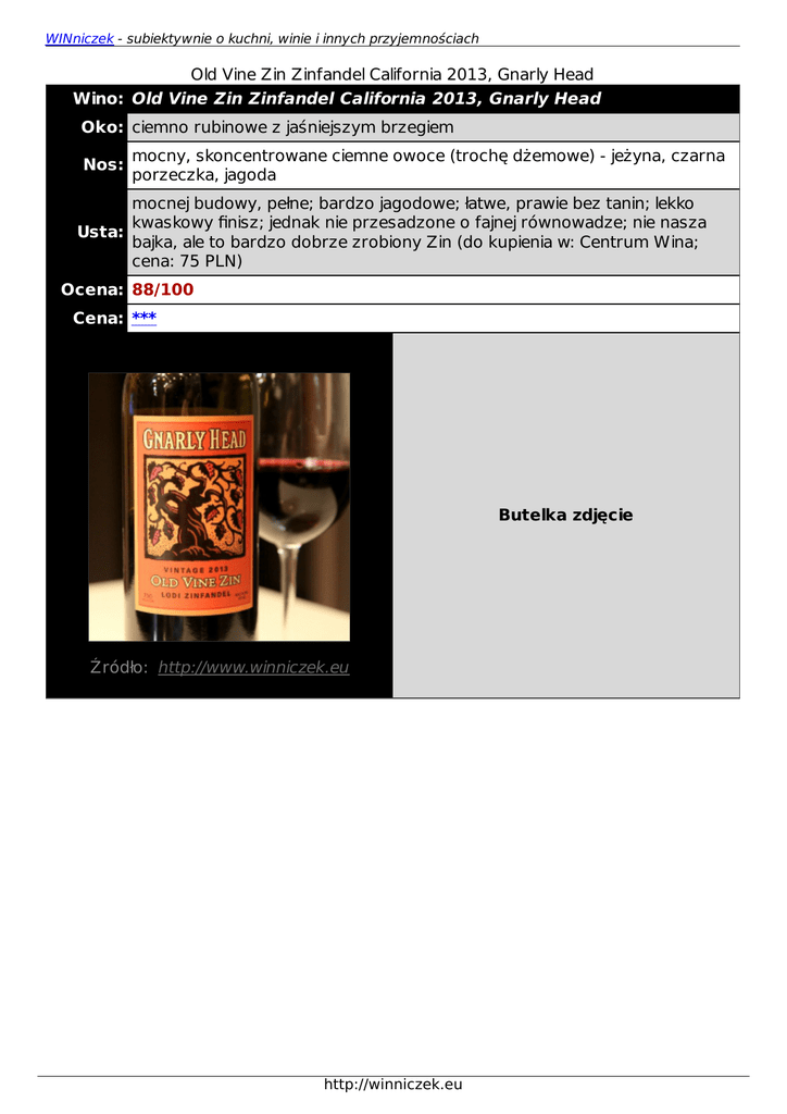 WINniczek - subiektywnie o kuchni, winie i innych przyjemnościach Old Vine Zin Zinfandel California 2013, Gnarly Head Wino: Old Vine Zin Zinfandel California 2013, Gnarly Head Oko: ciemno rubinowe z jaśniejszym brzegiem Nos: mocny, skoncentrowane ciemne owoce (trochę dżemowe) - jeżyna, czarna porzeczka, jagoda mocnej budowy, pełne; bardzo jagodowe; łatwe, prawie bez tanin; lekko kwaskowy finisz; jednak nie przesadzone o fajnej równowadze; nie nasza Usta: bajka, ale to bardzo dobrze zrobiony Zin (do kupienia w: Centrum Wina; cena: 75 PLN) Ocena: 88/100 Cena: *** Butelka zdjęcie Źródło: http://www.winniczek.eu http://winniczek.eu