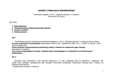 RAPORT Z EWALUACJI WEWNĘTRZNEJ Przedszkole Miejskie nr 29 im. „Akademii Uśmiechu” w Olsztynie Rok szkolny 2011/2012 Spis treści: 1. 2. 3. 4. Wprowadzenie. Charakterystyka przeprowadzonego badania Analiza wyników. Podsumowanie. Ad.1 Przedmiotem ewaluacji wewnętrznej Przedszkola Miejskiego nr 29 im. „Akademii Uśmiechu” w Olsztynie stał się obszar: Procesy zachodzące w przedszkolu Rozporządzenie MEN z dnia 7 października 2009 ( Dz. U. Z 2009r. Nr 168 poz. 1324) Celem ewaluacji jest: Ocena sposobu wykorzystywania posiadanej wiedzy o dziecku do wspierania jego rozwoju. Sprawdzono wymaganie: Czy procesy wspomagania rozwoju i edukacji dzieci przebiegające w przedszkolu są monitorowane i doskonalone. Ad. 2 Koncepcja pracy przedszkola w roku szkolnym obejmuje m. in. blok: „Integracja dzieci w przedszkolu – adaptacja”. Aby zbadać jego realizację, zaangażowane były wszystkie nauczycielki przedszkola. Nauczycielki zbierają dane o dziecku na podstawie dokumentów: - kwestionariusz wywiadu z rodzicami 1 - arkusz obserwacji dla dzieci młodszych– wg Programu Edukacji Przedszkolnej upowszechniający rozwój aktywności dzieci „nasze Przedszkole” M. Kwaśniewska, W. Żaba - Żabińska - arkusz badania gotowości szkolnej – wg Programu Edukacji Przedszkolnej upowszechniający rozwój aktywności dzieci „nasze Przedszkole” M. Kwaśniewska, W. Żaba - Żabińska - opinie od specjalistów Na podstawie w/w narzędzi badawczych nauczycielki poznają potrzeby i możliwości dzieci. W każdej grupie dokonywana jest obserwacja pedagogiczna dzieci. Powinna ona być przeprowadzana systematycznie – 3 razy w roku szkolnym (grupy młodsze) . Po dokonaniu obserwacji nauczycielki zobowiązane są przekazać informację rodzicom. Dzieci 5 i 6-letnie objęte są badaniem gotowości szkolnej 2 razy w roku szkolnym. Nauczycielki przekazują informację rodzicom według ustalonych w rozporządzeniu terminów. Na podstawie diagnozy pedagogicznej i obserwacji zostają wybrane dzieci, które są objęte pomocą indywidualną, dla których tworzone są karty indywidualnych potrzeb dziecka , plany działań wspierających oraz kształcenie indywidualne. Ad. 3 Aby dokonać ewaluacji wewnętrznej postawiono następujące pytania kluczowe: 1.Czy trafnie dobrano stosowane narzędzia do rozpoznawania potrzeb i możliwości dzieci ? 2. Czy systematycznie prowadzono obserwacje i przestrzegano terminów informacji dla rodziców? 3. Czy realizowano zasady indywidualizacji podczas sytuacji edukacyjnych? Analizowano następujące dokumenty: - arkusz obserwacji pedagogicznej dla dzieci młodszych ( zał. 1) - informacja o gotowości szkolnej dziecka do podjęcia nauki w szkole podstawowej , arkusz badania gotowości szkolnej(zał. 2) - plany wspomagania (zał. 3, zał. 3a) - kształcenie indywidualne (zał.4) - plany pracy indywidualnej i w małych zespołach (zał.5) 2 Przedszkole rozpoznaje potrzeby i możliwości edukacyjne wychowanków poprzez dokonywanie obserwacji (grupy młodsze) i diagnozy (grupy starsze). Wymagania edukacyjne stawiane dzieciom są precyzyjnie określone i dostosowane do ich indywidualnych możliwości i predyspozycji oraz odpowiadają ich potrzebom. W wyniku obserwacji i diagnozy do pracy indywidualnej wytypowano dzieci ze wszystkich grup przedszkolnych. Wyniki obserwacji i diagnozy wykorzystywane są do planowania metod i form pracy z dziećmi (metody aktywizujące, wykorzystywanie nowoczesnych technik i środków multimedialnych).Podczas realizacji planów miesięcznych nauczycielki grup uwzględniały potrzeby i możliwości wszystkich dzieci . W części planu „wspomaganie rozwoju dzieci” zostały opracowane zajęcia dla dzieci wytypowanych do pracy indywidualnej w sferze manualnej, społecznej i umysłowej. We wszystkich grupach działających na terenie przedszkola organizowane są działania mające na celu zdiagnozowanie i wyeliminowanie deficytów rozwojowych u dzieci. Zajęcia wyrównujące szanse edukacyjne (indywidualne i grupowe) prowadzone są przez specjalistów zatrudnionych w placówce. Specjaliści opracowują program zajęć edukacyjnoterapeutyczny. Informacje o zajęciach przekazywane są rodzicom podczas rozmów indywidualnych , specjaliści dają rodzicom wskazówki do pracy z dzieckiem w domu. I. Zajęcia terapii logopedycznej w zespołach prowadzone przez specjalistę – logopedę w wymiarze 1godz. tygodniowo (zał. 6): II. Zajęcia indywidualne o charakterze terapeutycznym prowadzone przez specjalistę - terapeutę wg planu wspomagania w wymiarze 1 godz. tygodniowo ( zał. 7): III. Zajęcia gimnastyki korekcyjno- kompensacyjnej prowadzone w zespole przez specjalistę w wymiarze 1 godz. tygodniowo (zał. nr 8): IV. Zajęcia indywidualne prowadzone na podstawie sporządzonego Planu Działań Wspierających przez zespół: C. Oleszko, A. Dyndul, W. Wawer w roku szkolnym 2011/2012. 3 V. Konsultacje psychologiczno-pedagogiczne VI. Praca w zespołach z dziećmi uzdolnionymi matematycznie wyłonionymi na podstawie diagnozy wg projektu E. Gruszczyk- Kolczyńskiej ( plan ujęty w projektach dydaktycz- wychow.) (zał. 9): VII. Nauczanie indywidualne w gr. VI „Smerfy” w dokumentacji gr. VI „Smerfy”. w wymiarze 4 godziny tygodniowo – dziennik zajęć znajduje się Ponadto dzieci chętne maja możliwość uczęszczania na zajęcia dodatkowe umożliwiające rozwój zainteresowań i zdolności wychowanków. Oferta zajęć to : szachy w wymiarze 1 godz. tygodniowo, język angielski w wymiarze 2 godz. tygodniowo, tańce ludowe w wymiarze 1 godz. tygodniowo, tańce towarzyskie w wymiarze 2 godz. tygodniowo. Dzieci z grup biorą udział w zajęciach koła origami. „Krasnale” i „Misiaki” realizują program zuchowy „Mały Zuszek” . W przedszkolu realizacja zasady indywidualizacji jest dokumentowana przez nauczycieli w następujący sposób: miesięczne plany pracy, arkusze obserwacji, dzienniki zajęć grupowych, dzienniki zajęć dodatkowy