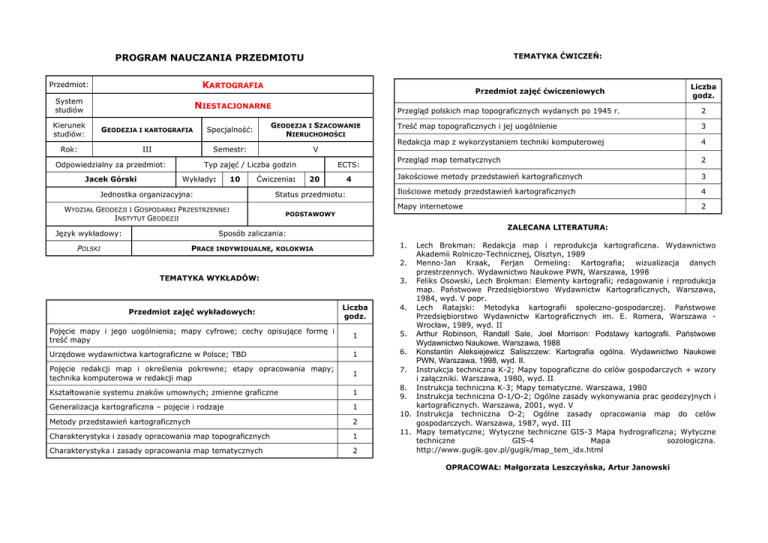 PROGRAM NAUCZANIA PRZEDMIOTU Przedmiot: KARTOGRAFIA System studiów NIESTACJONARNE TEMATYKA ĆWICZEŃ: Przedmiot zajęć ćwiczeniowych Kierunek studiów: GEODEZJA I KARTOGRAFIA Specjalność: GEODEZJA I SZACOWANIE NIERUCHOMOŚCI Rok: III Semestr: V Odpowiedzialny za przedmiot: Jacek Górski Typ zajęć / Liczba godzin Wykłady: 10 Ćwiczenia: ECTS: 20 4 Jednostka organizacyjna: Status przedmiotu: WYDZIAŁ GEODEZJI I GOSPODARKI PRZESTRZENNEJ INSTYTUT GEODEZJI PODSTAWOWY Język wykładowy: Sposób zaliczania: POLSKI PRACE INDYWIDUALNE, KOLOKWIA Liczba godz. Przegląd polskich map topograficznych wydanych po 1945 r. 2 Treść map topograficznych i jej uogólnienie 3 Redakcja map z wykorzystaniem techniki komputerowej 4 Przegląd map tematycznych 2 Jakościowe metody przedstawień kartograficznych 3 Ilościowe metody przedstawień kartograficznych 4 Mapy internetowe 2 ZALECANA LITERATURA: 1. 2. TEMATYKA WYKŁADÓW: 3. Przedmiot zajęć wykładowych: Liczba godz. 4. Pojęcie mapy i jego uogólnienia; mapy cyfrowe; cechy opisujące formę i treść mapy 1 5. Urzędowe wydawnictwa kartograficzne w Polsce; TBD 1 6. Pojęcie redakcji map i określenia pokrewne; etapy opracowania mapy; technika komputerowa w redakcji map 1 Kształtowanie systemu znaków umownych; zmienne graficzne 1 Generalizacja kartograficzna – pojęcie i rodzaje 1 Metody przedstawień kartograficznych 2 Charakterystyka i zasady opracowania map topograficznych 1 Charakterystyka i zasady opracowania map tematycznych 2 Lech Brokman: Redakcja map i reprodukcja kartograficzna. Wydawnictwo Akademii Rolniczo-Technicznej, Olsztyn, 1989 Menno-Jan Kraak, Ferjan Ormeling: Kartografia; wizualizacja danych przestrzennych. Wydawnictwo Naukowe PWN, Warszawa, 1998 Feliks Osowski, Lech Brokman: Elementy kartografii; redagowanie i reprodukcja map. Państwowe Przedsiębiorstwo Wydawnictw Kartograficznych, Warszawa, 1984, wyd. V popr. Lech Ratajski: Metodyka kartografii społeczno-gospodarczej. Państwowe Przedsiębiorstwo Wydawnictw Kartograficznych im. E. Romera, Warszawa Wrocław, 1989, wyd. II Arthur Robinson, Randall Sale, Joel Morrison: Podstawy kartografii. Państwowe Wydawnictwo Naukowe, Warszawa, 1988 Konstantin Aleksiejewicz Saliszczew: Kartografia ogólna. Wydawnictwo Naukowe PWN, Warszawa, 1998, wyd. II. 7. Instrukcja techniczna K-2; Mapy topograficzne do celów gospodarczych + wzory i załączniki. Warszawa, 1980, wyd. II 8. Instrukcja techniczna K-3; Mapy tematyczne. Warszawa, 1980 9. Instrukcja techniczna O-1/O-2; Ogólne zasady wykonywania prac geodezyjnych i kartograficznych. Warszawa, 2001, wyd. V 10. Instrukcja techniczna O-2; Ogólne zasady opracowania map do celów gospodarczych. Warszawa, 1987, wyd. III 11. Mapy tematyczne; Wytyczne techniczne GIS-3 Mapa hydrograficzna; Wytyczne techniczne GIS-4 Mapa sozologiczna. http://www.gugik.gov.pl/gugik/map_tem_idx.html OPRACOWAŁ: Małgorzata Leszczyńska, Artur Janowski