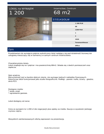 LOKAL na WYNAJEM 1 200 Inowrocław, Centrum 68 m2 57/5143/OLW 1 200 PLN 68 1200 PLN 1 2 1920 TenementHouse Office Opis Przedstawiam do wynajęcia pięknie wykończony lokal nadający się pod działalność biurową lub usługową mieszczący się w kamienicy w samym centrum Inowrocławia. Charakterystyka lokalu Lokal znajduje się na I piętrze i ma powierzchnię 68m2. Składa się z dwóch pomieszczeń oraz zaplecza. Opis wnętrza Nieruchomość jest w bardzo dobrym stanie, nie wymaga żadnych nakładów finansowych. Dotychczas lokal funkcjonował jako studio fotograficzne. Podłogi - panele i kafle, ściany - gładzie; okna PCV. Dostępne media: * woda, prąd; * ogrzewanie gazowe. Lokal dostępny od zaraz. Cena za wynajem to 1.200 zł (do negocjacji) plus opłaty za media. Kaucja w wysokości jednego czynszu najmu. Wszystkich zainteresowanych ofertą zapraszam na prezentację. Studio Nieruchomości Więcej naszych ofert znajdziecie na stronie www.studio-nieruchomosci.com Sprzedaj ze Studio Nieruchomości tel. 502 908 680 email: [email protected] Studio Nieruchomości Powered by TCPDF (www.tcpdf.org)