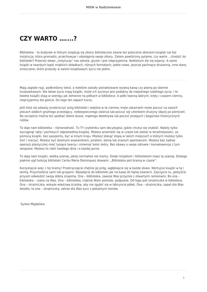 MOW w Radzionkowie CZY WARTO …....? Biblioteka – to budynek w którym znajdują się zbiory biblioteczne zwane też potocznie zbiorami książek lub też instytucja, która gromadzi, przechowuje i udostępnia swoje zbiory. Zatem powtórzmy pytanie, czy warto ...chodzić do biblioteki? Przecież słowo „instytucja” nas odraża, gryzie i jest nieprzyjemne. Niektórym źle się kojarzy. A same książki w twardych bądź miękkich okładkach, różnych formatach; jedne nowe, jeszcze pachnące drukarnią, inne stare, zniszczone, które przeszły w swoim książkowym życiu nie jedno. Mają zagięte rogi, podkreślony tekst, a niektóre zostały potraktowane wylaną kawą czy plamą po dżemie truskawkowym. Nie łatwe życie mają książki, może ich życiorys jest podobny do niejednego ludzkiego życia. I te biedne książki stoją w szeregu jak żołnierze na półkach w bibliotece. A półki tworzą labirynt, kręty i czasem ciemny, nieprzyjemny dla gościa. Do tego ten zapach kurzu. Jeśli ktoś się odważy przekroczyć próg biblioteki i wejdzie w te ciemne, kręte zakamarki może poczuć na swoich plecach oddech groźnego przestępcy, niebezpiecznego zwierza lub poczuć się członkiem drużyny idącej po pierścień. Na szczęście można też spotkać dobre dusze, mądrego detektywa lub poczuć przepych i bogactwo historycznych rodów. To daje nam biblioteka – różnorodność. To TY czytelniku sam decydujesz, gdzie chcesz się znaleźć. Należy tylko wyciągnąć rękę i pochwycić odpowiednią książkę. Możesz przenieść się w czasie lub zostać w teraźniejszości, za pomocą książki, bez paszportu, być w innym kraju. Możesz stanąć stopą w takich miejscach o których możesz tylko śnić i marzyć. Możesz być dzielnym wojownikiem, piratem, damą lub znanym sportowcem. Możesz bez żadnej operacji plastycznej mieć tysiące twarzy i zmieniać kolor skóry. Bez obawy o swoje zdrowie i konsekwencje z tym związane. Możesz to robić każdego dnia i o każdej porze. To dają nam książki, wielką szansę, jakiej normalnie nie mamy. Dzięki książkom i bibliotekom masz tę szansę. Dlatego pięknie ujął funkcję biblioteki Carlos Maria Dominquez słowami: „Biblioteka jest bramą w czasie”. Korzystajcie więc z tej bramy! Przekraczajcie chętnie jej próg, wgłębiajcie się w każde słowo. Wertujcie książki w tę i tamtą. Przychodźcie sami lub grupami. Wpadajcie do biblioteki jak na kawę do fajnej kawiarni. Zajrzyjcie tu, jakbyście przyszli odwiedzić swoją dobrą znajomą. Ona – biblioteka, zawsze Was przyjmie z otwartymi ramionami. Bo ona – biblioteka – czeka na Was. Ona – biblioteka, chętnie Wam pomoże, podpowie. Od tego jest strażniczka w bibliotece. Ona – strażniczka, wskaże właściwą ścieżkę, aby nie zgubić się w labiryncie półek. Ona – strażniczka, zapali dla Was światło, to ona – strażniczka, zetrze dla Was kurz z pokaźnych tomów. Sylwia Migdalska 1