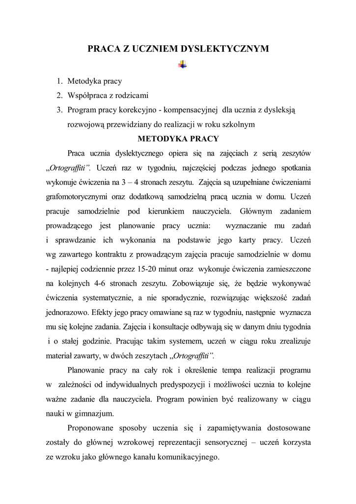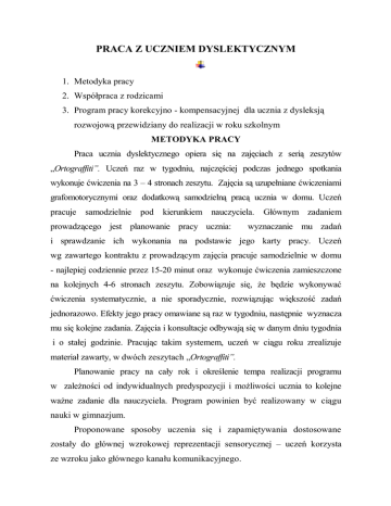 PRACA Z UCZNIEM DYSLEKTYCZNYM 1. Metodyka pracy 2. Współpraca z rodzicami 3. Program pracy korekcyjno - kompensacyjnej dla ucznia z dysleksją rozwojową przewidziany do realizacji w roku szkolnym METODYKA PRACY Praca ucznia dyslektycznego opiera się na zajęciach z serią zeszytów „Ortograffiti”. Uczeń raz w tygodniu, najczęściej podczas jednego spotkania wykonuje ćwiczenia na 3 – 4 stronach zeszytu. Zajęcia są uzupełniane ćwiczeniami grafomotorycznymi oraz dodatkową samodzielną pracą ucznia w domu. Uczeń pracuje samodzielnie pod kierunkiem nauczyciela. Głównym zadaniem prowadzącego jest planowanie pracy ucznia: wyznaczanie mu zadań i sprawdzanie ich wykonania na podstawie jego karty pracy. Uczeń wg zawartego kontraktu z prowadzącym zajęcia pracuje samodzielnie w domu - najlepiej codziennie przez 15-20 minut oraz wykonuje ćwiczenia zamieszczone na kolejnych 4-6 stronach zeszytu. Zobowiązuje się, że będzie wykonywać ćwiczenia systematycznie, a nie sporadycznie, rozwiązując większość zadań jednorazowo. Efekty jego pracy omawiane są raz w tygodniu, następnie wyznacza mu się kolejne zadania. Zajęcia i konsultacje odbywają się w danym dniu tygodnia i o stałej godzinie. Pracując takim systemem, uczeń w ciągu roku zrealizuje materiał zawarty, w dwóch zeszytach „Ortograffiti”. Planowanie pracy na cały rok i określenie tempa realizacji programu w zależności od indywidualnych predyspozycji i możliwości ucznia to kolejne ważne zadanie dla nauczyciela. Program powinien być realizowany w ciągu nauki w gimnazjum. Proponowane sposoby uczenia się i zapamiętywania dostosowane zostały do głównej wzrokowej reprezentacji sensorycznej – uczeń korzysta ze wzroku jako głównego kanału komunikacyjnego. WSPÓŁPRACA Z RODZICAMI Uczeń z dysleksją rozwojową, który pracuje nad usprawnianiem zaburzonych procesów poznawczych, do osiągnięcia sukcesu potrzebuje wsparcia i stymulowania do podejmowania wysiłku. Takie wsparcie dziecko otrzymuje od swoich najbliższych. Zadaniem rodziców jest nie tylko zapewnienie uczniowi odpowiednich warunków do pracy, ale również mobilizowanie do systematycznej pracy, śledzenie postępów i pozostawanie w stałym kontakcie z nauczycielem. Analizując kartę pracy ucznia, rodzice na bieżąco poznają postępy dziecka, wiedzą, czy wykonuje on systematycznie ćwiczenia, mogą określić stopień poprawności ich wykonania. W czasie rozmów z rodzicami należy uzmysłowić im to, że uczniowie z dysleksją wymagają szczególnej troski i zrozumienia z ich strony. Ważne jest, aby dostrzegali i doceniali wysiłki- każde, nawet niewielkie osiągnięcie dziecka oraz nie porównywali go z kolegami czy rodzeństwem, jeśli takie porównanie wypada na jego niekorzyść. PROGRAM PRACY KOREKCYJNO - KOMPENSACYJNEJ Program zajęć korekcyjno-kompensacyjnych został opracowany w taki sposób, by umożliwić uczniowi z dysleksją wykonywanie różnorodnych czynności: pisania, czytania i wypowiadania się. Ćwiczenia zostały tak dobrane, aby: usprawniały: percepcję słuchową, pamięć słuchową, wzrokową, spostrzegawczość, logiczne myślenie i wyobraźnię, ułatwiały pokonywanie dysgrafii i dysortografii, doskonaliły technikę głośnego czytania - całościowego, cichego ze zrozumieniem, podnosiły tempo czytania, korygowały błędy dyslektyczne, umożliwiały samodzielne wypowiadanie się w formie pisemnej i ustnej. Płaszczyzny Procedury Przewidywane pracy korekcyjnej osiągania celów osiągnięcia ucznia Ćwiczenia integracji sensomotorycznej: Ćwiczenia w pisaniu - przepisywanie tekstów - korygowanie błędów pisanych i drukowanych, dyslektycznych w piśmie utrwalanie zasad tzw. słuchowych, ortograficznych ortograficznych, stylu dotyczących pisania pisowni: „ó’, „u”, „ż”, - wzbogacanie słownictwa „rz’, tematycznego „h”, „ch” - podnoszenie świadomości - pisownia zmiękczeń: ortograficznej, poziomu „ć”, pisania ortograficznego „ś”, „ź”, „dź”, „ci”, „si”, - usprawnianie funkcji „zi” słuchowej „dzi”, „-i”, „-i”, „-ii”, „- - wyrabianie nawyku ii” autokontroli - pisownia cząstek:”, ,,-ę”, - rozwijanie myślenia „-om”, ,,-on”, ,,-em”, „- logicznego, twórczego en”, - inspirowanie wyobraźni „-bym”, „-byś”, ,,-by” - usprawnianie pamięci - wyróżnianie wyrazów wzrokowej świeżej, trwałej z daną trudnością ortograficzną, uzupełnianie drobnych elementów graficznych liter Płaszczyzny pracy Procedury Przewidywane korekcyjnej osiągania celów - samodzielne układanie osiągnięcia ucznia zdań rozwiniętych z wyrazami z określonym problemem ortograficznym - konstruowanie wypowiedzi pisemnych, logicznych na temat zadany lub dowolny - układanie opisów, opowiadań z zestawem dotyczących opowiadanie Ćwiczenia w mówieniu -wyrazów jakiegoś tematutekstu lub z przeczytanego - stymulowanie mowy czynnej, trudnościąi wspólne wielozdaniowych -daną indywidualne ortograficzną, na tematna wypowiedzi logicznych układanie opowiadań zadanyzadany lub dowolny temat lub - wzbogacanie - pisanie z pamięci dowolny słownictwa tematycznego zdańtekstu po - rozwijanie myślenia -wyrazów, opowiadanie - pisanie ze słuchu; bezpośrednim rozwiązywanie z z - czytanie głośne Ćwiczenia w czytaniu odtworzeniu logicznego, wyobraźni - rozwijanie umiejętności usprawnianie czytania krzyżówek magnetofonu przestrzeganiem znaków słuchania głośnego, czytania ze ortograficznych, - układanie zdań rebusów - usprawnianie pamięci interpunkcyjnych; przy zrozumieniem rozwiniętych z danymi muzyce, bez muzyki słuchowej - usprawnianie tempa -słowami czytanie ciche ze - doskonalenie płynności czytania zrozumieniem -wypowiedzi usuwanie blokady - czytanie głośne zdania emocjonalnej w czytaniu Materiał metodyczny opracowany na podstawie artykułu Renaty Czabaj , „Ortograffiti- przewodnik”