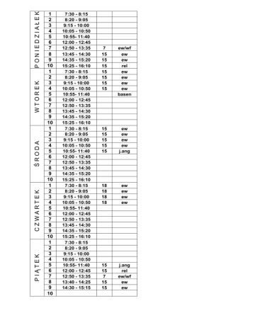 PONIEDZIAŁEK WTOREK ŚRODA CZWARTEK PIĄTEK 1 2 3 4 5 6 7 8 9 10 1 2 3 4 5 6 7 8 9 10 1 2 3 4 5 6 7 8 9 10 1 2 3 4 5 6 7 8 9 10 1 2 3 4 5 6 7 8 9 10 7:30 - 8:15 8:20 - 9:05 9:15 - 10:00 10:05 - 10:50 10:55- 11:40 12:00 - 12:45 12:50 - 13:35 13:45 - 14:30 14:35 - 15:20 15:25 - 16:10 7:30 - 8:15 8:20 - 9:05 9:15 - 10:00 10:05 - 10:50 10:55- 11:40 12:00 - 12:45 12:50 - 13:35 13:45 - 14:30 14:35 - 15:20 15:25 - 16:10 7:30 - 8:15 8:20 - 9:05 9:15 - 10:00 10:05 - 10:50 10:55- 11:40 12:00 - 12:45 12:50 - 13:35 13:45 - 14:30 14:35 - 15:20 15:25 - 16:10 7:30 - 8:15 8:20 - 9:05 9:15 - 10:00 10:05 - 10:50 10:55- 11:40 12:00 - 12:45 12:50 - 13:35 13:45 - 14:30 14:35 - 15:20 15:25 - 16:10 7:30 - 8:15 8:20 - 9:05 9:15 - 10:00 10:05 - 10:50 10:55- 11:40 12:00 - 12:45 12:50 - 13:35 13:40 - 14:25 14:30 - 15:15 7 15 15 15 15 15 15 15 ew/wf ew ew rel ew ew ew ew basen 15 15 15 15 15 ew ew ew ew j.ang 18 18 18 18 ew ew ew ew 15 15 7 15 15 j.ang rel ew/wf ew ew