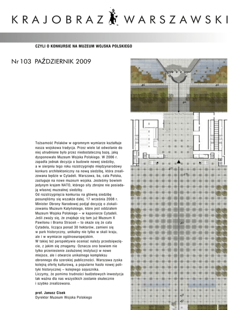 CZYLI O KONKURSIE NA MUZEUM WOJSKA POLSKIEGO Nr 103 PAŹDZIERNIK 2009 Tożsamość Polaków w ogromnym wymiarze kształtuje nasza wojskowa tradycja. Przez wiele lat odwołanie do niej utrudnione było przez niedostateczną bazę, jaką dysponowało Muzeum Wojska Polskiego. W 2006 r. zapadła jednak decyzja o budowie nowej siedziby, a w sierpniu tego roku rozstrzygnięto międzynarodowy konkurs architektoniczny na nową siedzibę, która zrealizowana będzie w Cytadeli. Warszawa, ba, cała Polska, zasługuje na nowe muzeum wojska. Jesteśmy bowiem jedynym krajem NATO, którego siły zbrojne nie posiadają własnej muzealnej siedziby. Od rozstrzygnięcia konkursu na główną siedzibę posunęliśmy się wszakże dalej. 17 września 2008 r. Minister Obrony Narodowej podjął decyzję o zlokalizowaniu Muzeum Katyńskiego, które jest oddziałem Muzeum Wojska Polskiego – w kaponierze Cytadeli. Jeśli zważy się, że znajduje się tam już Muzeum X Pawilonu i Brama Straceń – to okaże się że cała Cytadela, licząca ponad 30 hektarów, zamieni się w park historyczny, unikalny nie tylko w skali kraju, ale i w wymiarze ogólnoeuropejskim. W takiej też perspektywie oceniać należy przedsięwzięcie, z jakim się zmagamy. Oznacza ono bowiem nie tylko przeniesienie zasłużonej instytucji w nowe miejsce, ale i otwarcie unikalnego kompleksu obronnego dla szerokiej publiczności. Warszawa zyska kolejną ofertę kulturową, a popularne hasło nowej polityki historycznej – kolejnego sojusznika. Liczymy, że pomimo trudności budżetowych inwestycja tak ważna dla nas wszystkich zostanie skutecznie i szybko zrealizowana. prof. Janusz Cisek Dyrektor Muzeum Wojska Polskiego KONKURS NA KONCEPCJĘ URBANISTYCZNO-ARCHITEKTONICZNĄ KOMPLEKSU MUZEUM WOJSKA POLSKIEGO W CYTADELI WARSZAWSKIEJ Organizator Muzeum Wojska Polskiego Sąd konkursowy Krzysztof Chwalibóg Marian Fikus Marcin Gawlicki Jerzy Grochulski Janusz B. Jaworski – sędzia referent Witold Kalinowski Konrad Kucza-Kuczyński – przewodniczący Roman Łukasik Roman Matuszewski Marek Mikos Małgorzata Rozbicka Witold Sielewicz Marek Trzybiński Marek Szeniawski – sekretarz 2 Miejsce i termin rozstrzygnięcia Warszawa, 31 sierpnia 2009 r. UWOLNIĆ CYTADELĘ Rozmowa z Dariuszem Matlakiem – zastępcą dyrektora Muzeum Wojska Polskiego ds. inwestycyjnych Jak Pan ocenia poziom konkursu? Patrząc już z pewnej perspektywy, można zdecydowanie stwierdzić, że konkurs okazał się dość skomplikowanym przedsięwzięciem. Na wstępie obawialiśmy się, że wymogi muzealne, ograniczenia konserwatorskie związane z przyrodą i całym zabytkowym otoczeniem obiektu z jednej strony będą stanowić istotne ograniczenie, z drugiej zaś narzucać pewne oczywiste rozwiązania. Okazało się, że wielu architektów zdecydowało się jednak szukać rozwiązań nowatorskich. Decydowali się na rozwiązania przestrzenne, które czasami w ogóle przeczyły obecnej tam historycznej urbanistyce. Warto to docenić. Jestem dla nich pełen uznania. Chwała zwyciężonym, bo wykonana została ogromna praca twórcza. Chociaż te śmiałe realizacje urbanistyczne nie zyskały uznania w oczach sądu konkursowego, mamy poczucie, że poprzez konkurs publiczny przynajmniej zostały rozważone. Uzyskaliśmy dzięki temu przekonanie, że wybitni architekci przeanalizowali każdą możliwość, jaką ta przestrzeń tworzyła, i przez to spełniony został walor wszechstronności, pełne rozpatrzenie różnych rozwiązań. Natomiast, co się tyczy pracy wyróżnionej pierwszą nagrodą, jak i pozostałych laureatów konkursu, to tutaj analizując rozwiązania architektoniczne, trzeba zwrócić uwagę, że prace te proponują skrajnie odmienne rozwiązania. To też zapewne wskazuje na rozterki, jakie miał sąd konkursowy przy dokonywaniu wyboru. Można sobie oczywiście zadawać pytanie, dlaczego akurat ta, a nie inna, praca wygrała. Nie chciałbym się nad tym rozwodzić, ponieważ nie jestem architektem. Jako przedstawiciel inwestora patrzę na projekt w bardzo praktyczny sposób. Muzeum Wojska Polskiego posiada ok. 250 tys. muzealiów, zarówno dzieł sztuki, dokumentów, jak też wyposażenia i uzbrojenia. Jest to muzeum historyczne, którego celem, i jest to również proza związana z funkcjonowaniem takiej instytucji, nie jest to, co najbardziej doceniane i dostrzegane, czyli ekspozycja, ale przede wszystkim gromadzenie zabytków, ich konserwacja i opracowanie naukowe, czyli ważne jest, żeby w takim muzeum było miejsce nie tylko na tę spektakularną działalność, która jest zawsze najbardziej interesująca dla mediów i dla publiczności, ale również na to, co się dzieje w magazynach, w pracowniach konserwatorskich czy gabinetach naukowych. Wybrany projekt spełnia te oczekiwania. Może nie jest on nadzwyczaj nowatorski w formie, ale my nie oczekiwaliśmy rewolucyjnych koncepcji, proponujących wyszukaną formę, wyznaczających nowe trendy w architekturze tego typu obiektów. I dlatego w warunkach konkursu, które zostały skonsultowane zarówno z muzealnikami, jak i specjalistami od spraw wystawienniczych, zostały dość precyzyjnie zapisane określone funkcje, metraże, kubatury i standardy pomieszczeń, które są nam niezbędne do realizacji zapisanych ustawowo funkcji zadań muzeum. To z pewnością zawęziło architektom pole do fantazjowania. Nam zależało jednak przede wszystkim na funk- cjonalności tego obiektu. Dziś wiemy, analizując projekt, że otrzymaliśmy to, o co nam chodziło. Mówiłem do tej pory głównie o tych mniej znanych funkcjach muzeum, ale zawarliśmy oczywiście w naszej koncepcji również elementy ekspozycyjne. W tych wnętrzach i na tych powierzchniach można znakomicie pomieścić i połączyć program muzealny ukazujący w istocie całe dzieje Polski Ale w zwycięskim projekcie dużo miejsca poświęcono części ekspozycyjnej i zagospodarowaniu otoczenia budynku: okopy, woda, posadzka odbijająca niebo. Czy to